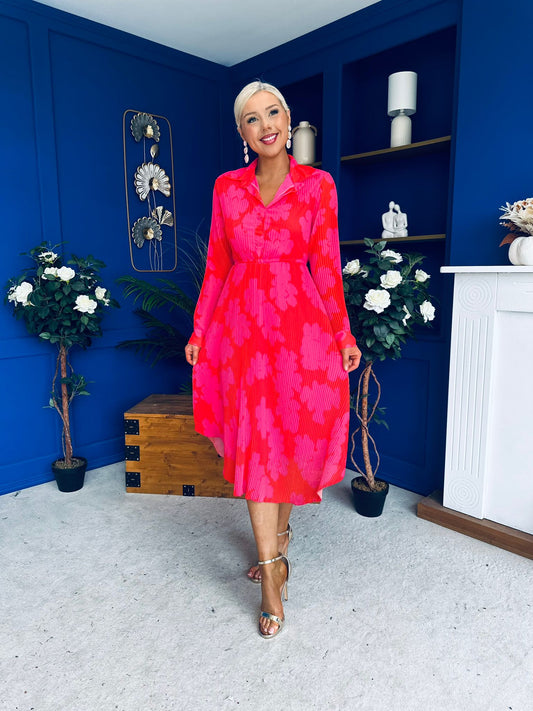 Blaire Detailed Plisse Midi Dress Floral Coral