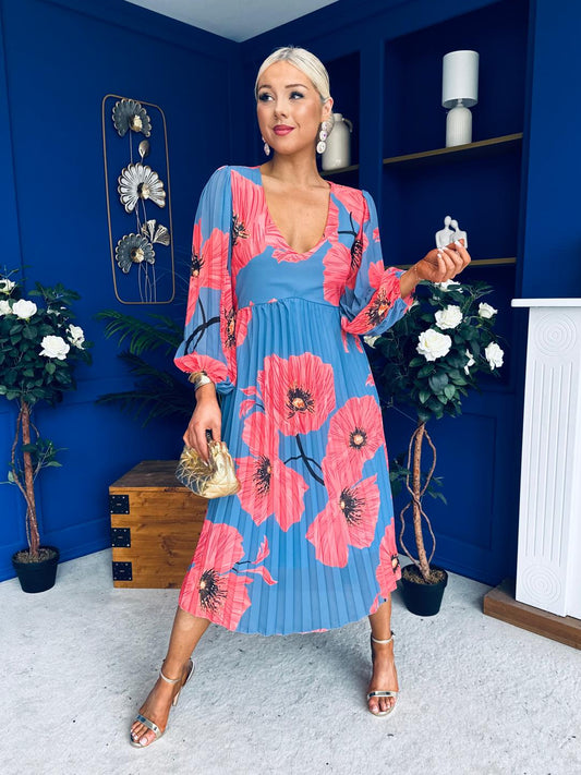 Caitriona Pleated Midi Dress Floral Cobalt