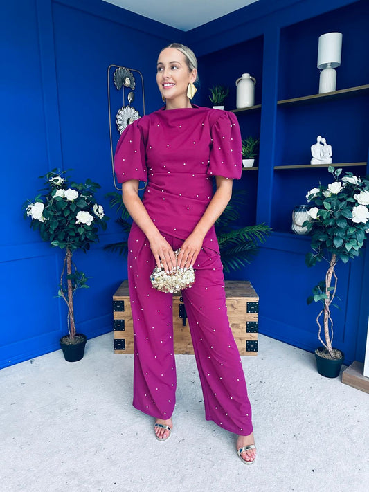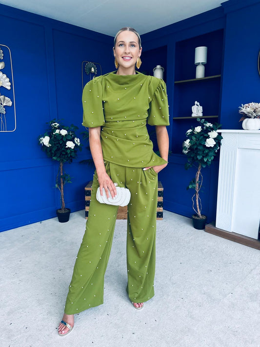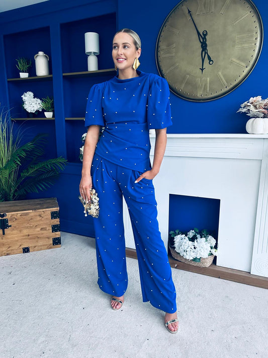 Cliona Pearl Detail Top And Trouser Set Cobalt