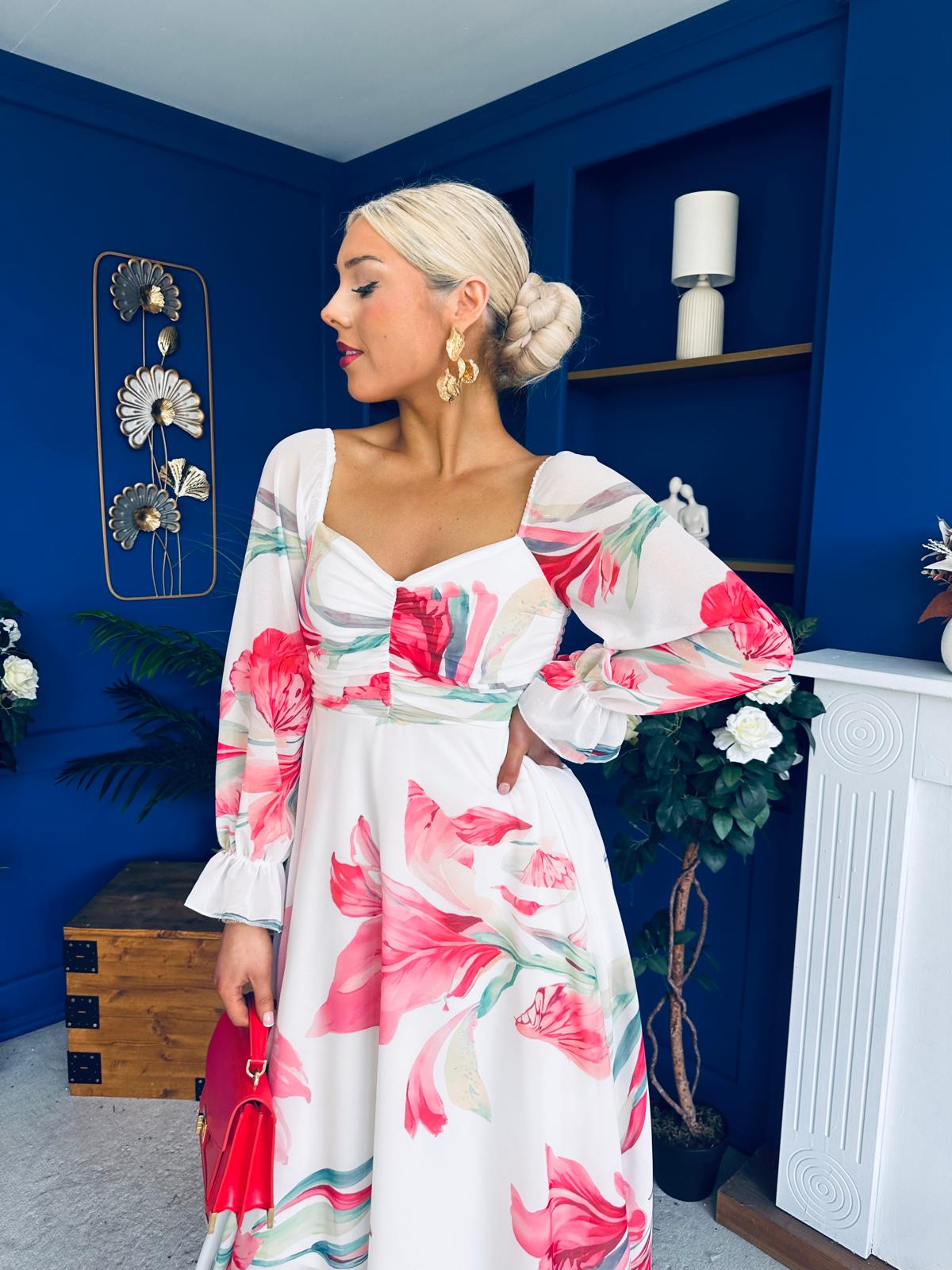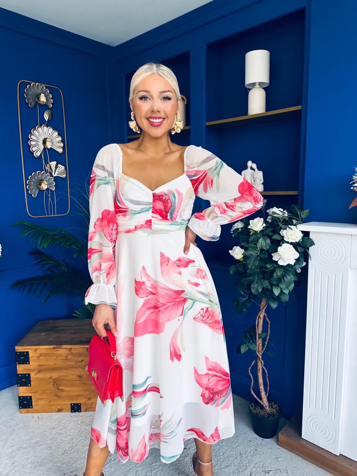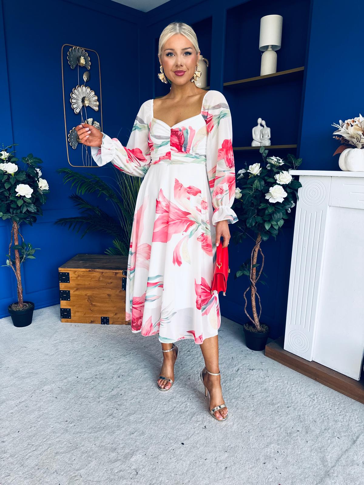 This dress comes in the most amazing print with beautiful full sleeve detail, ruched bust, banded midriff, elasticated back to cinch and flowing skirt to flatter
