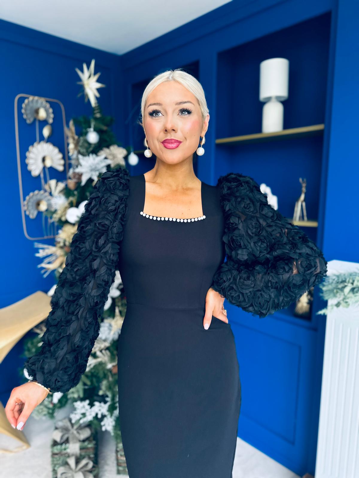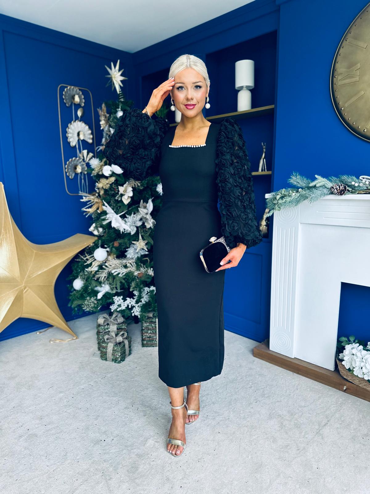 Alannah Floral Sleeve Occasion Midi Dress Black