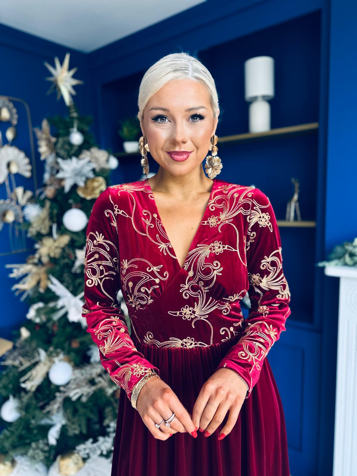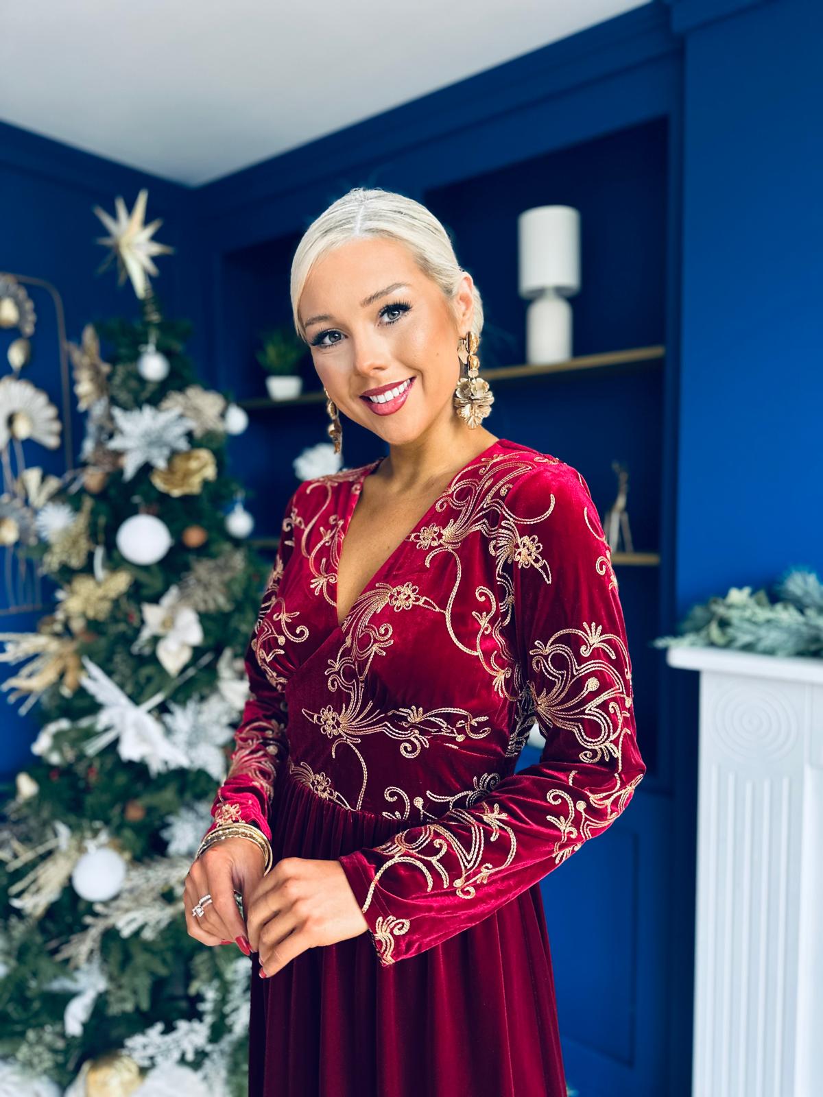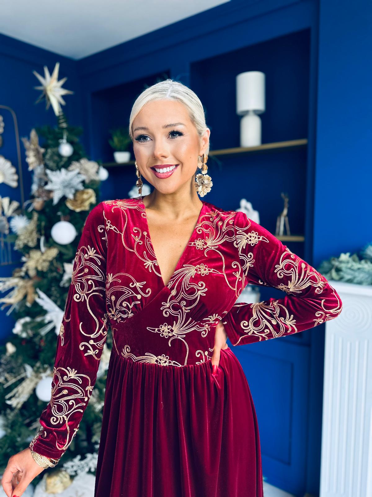 The bodice and sleeves are exquisitely detailed with ornate, metallic gold-toned embroidered scrollwork, adding a regal and festive touch.