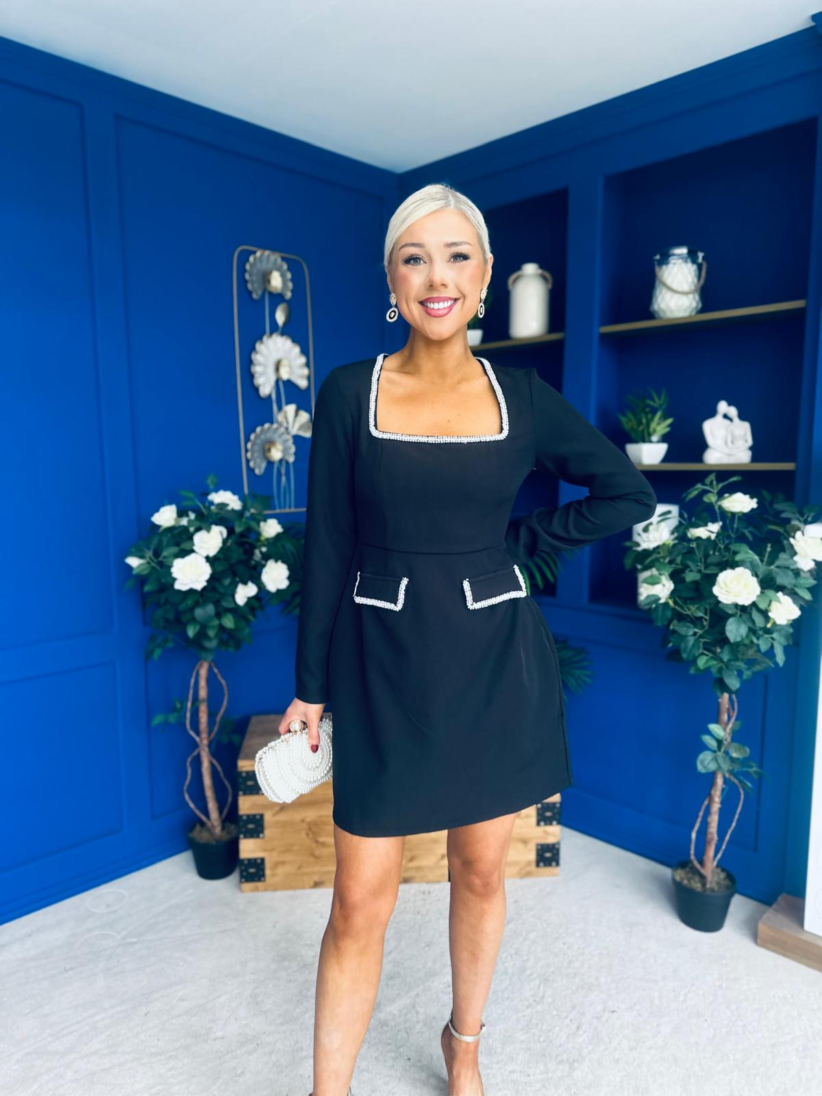 This sophisticated piece features a square neckline, playful mini length, and shimmering beaded fabric that adds a touch of glamour to the mini length.