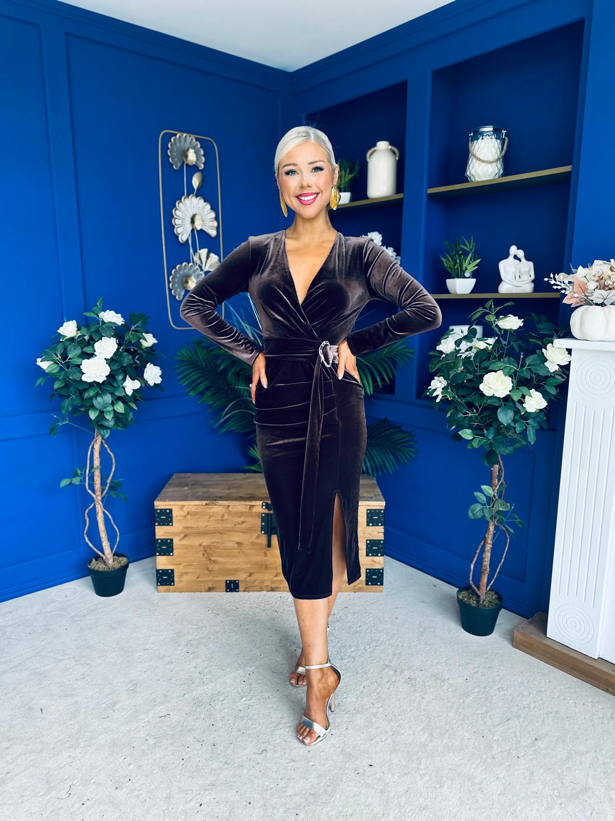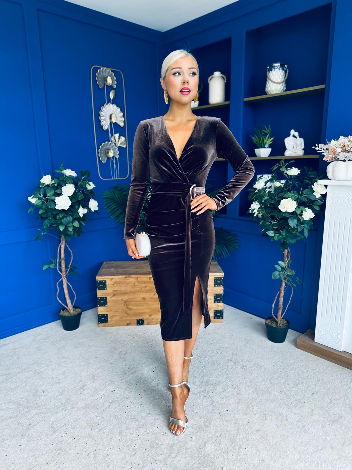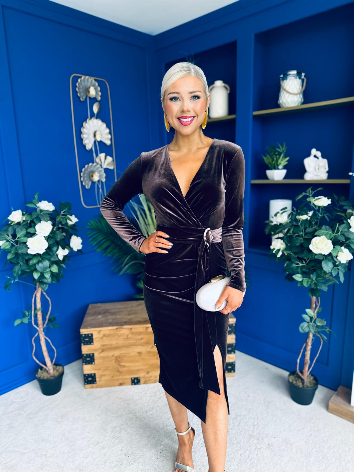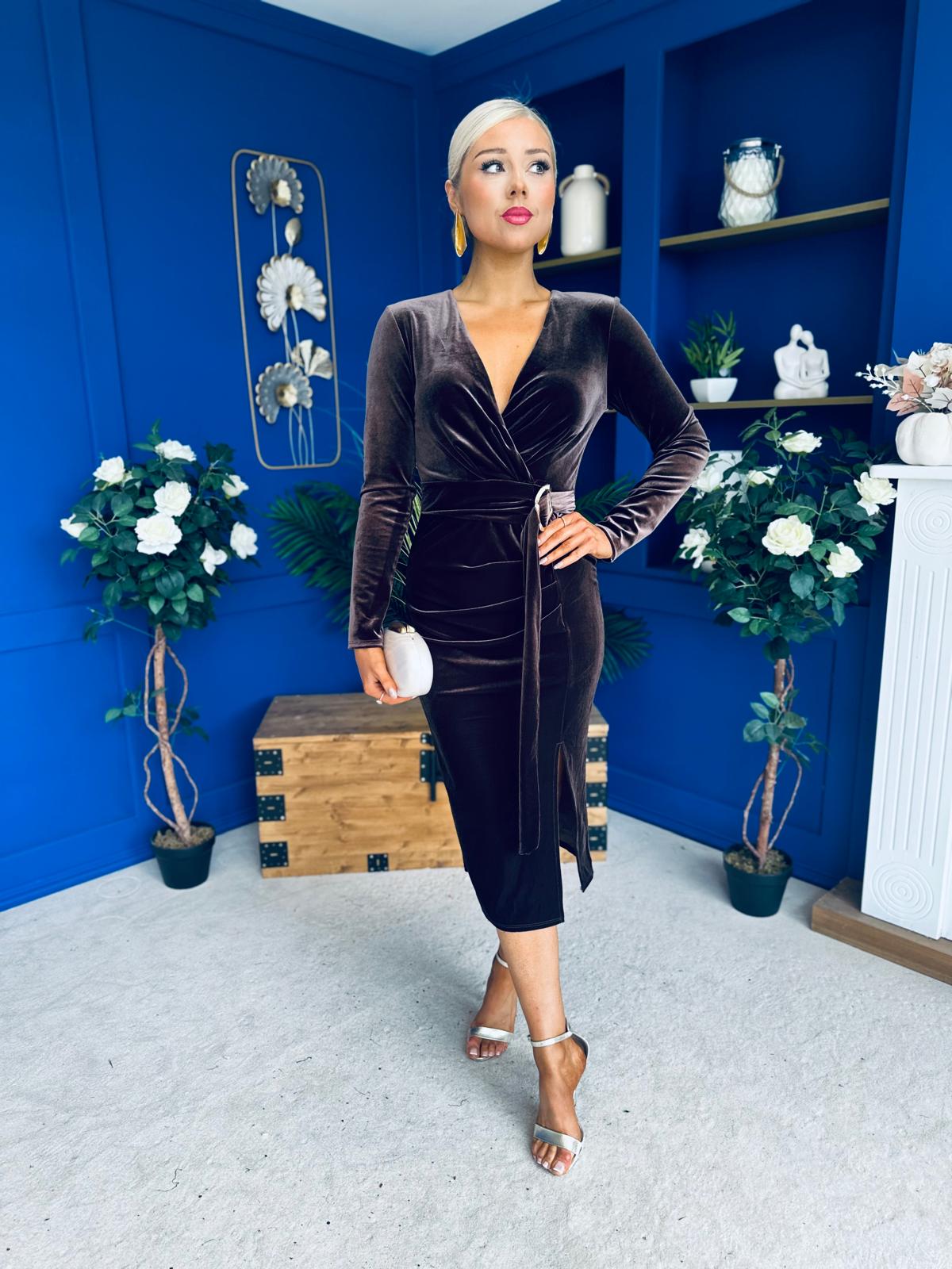 The amazing Annie occasion dress, in a fabulous velvet material, with wrap over neckline and full length sleeve with gold hardware detail