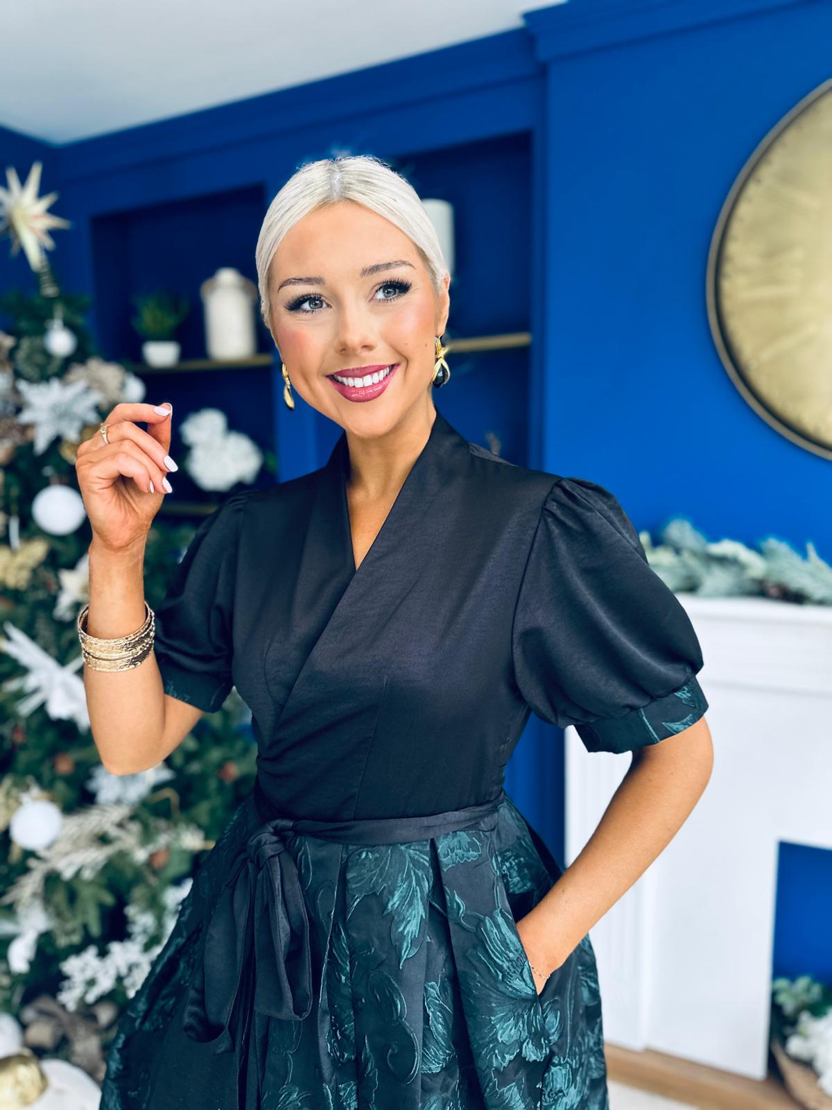 Designed to create a bold and eye-catching silhouette. The block colour top with a premium shape holding jaquard material give this dress is perfect style for making a stylish statement.
