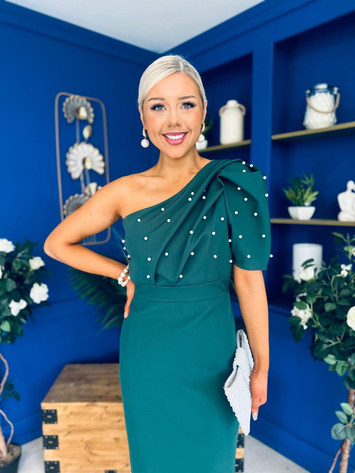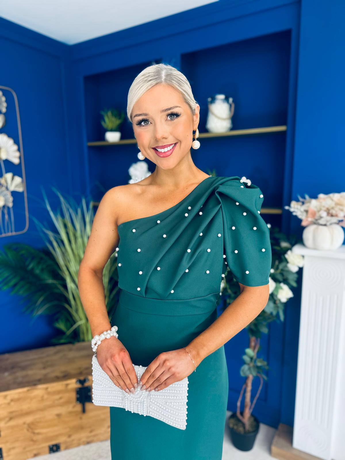 Our new April dress with single shoulder neckline, gathered bust with pearl embellishment & skirt is simply fabulous