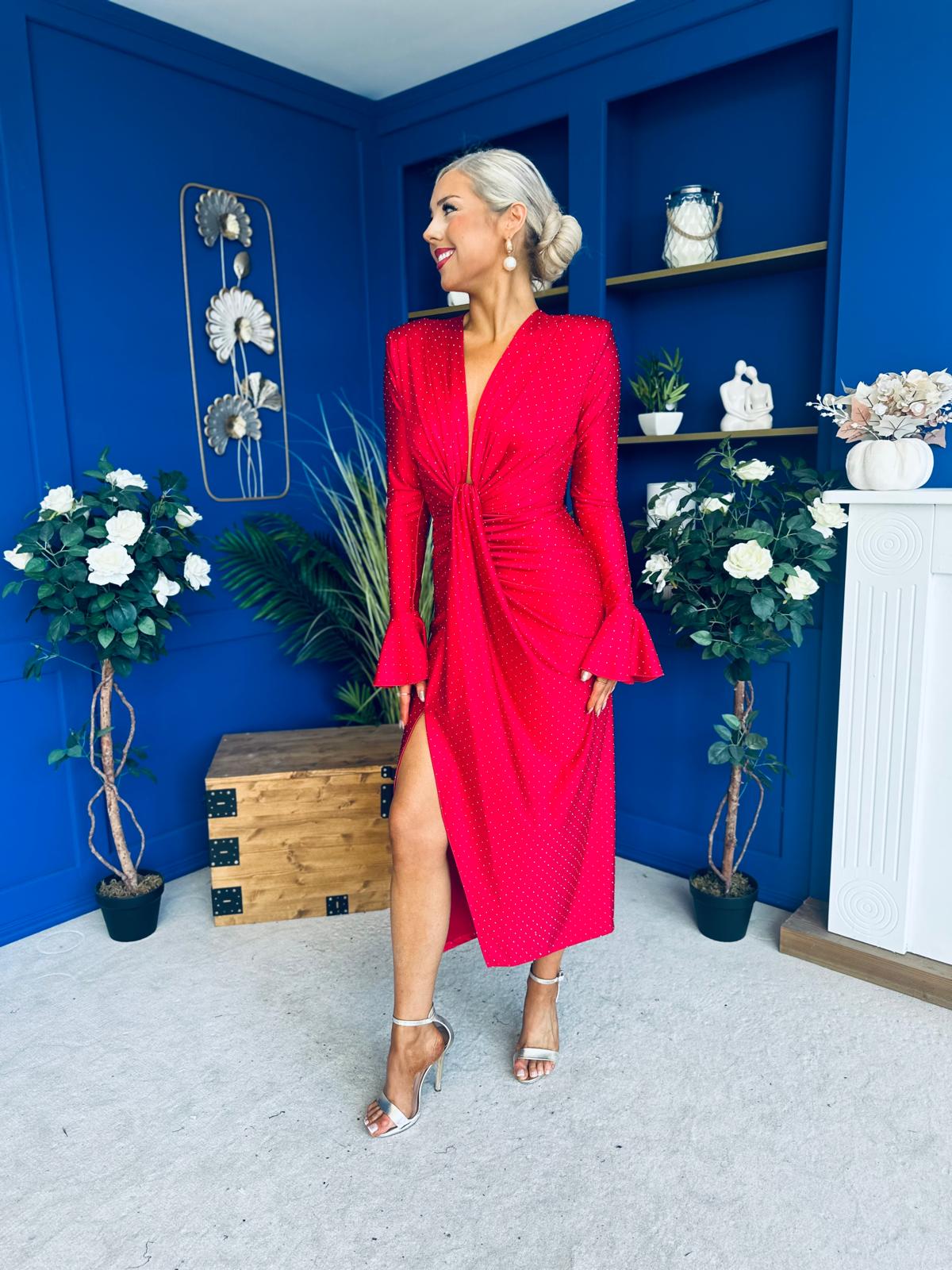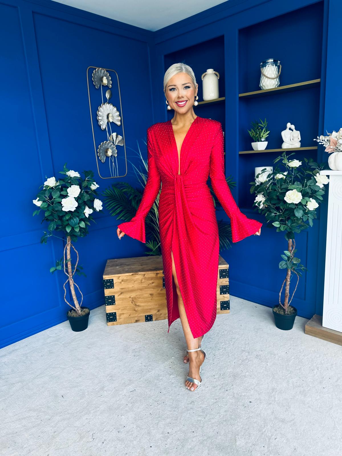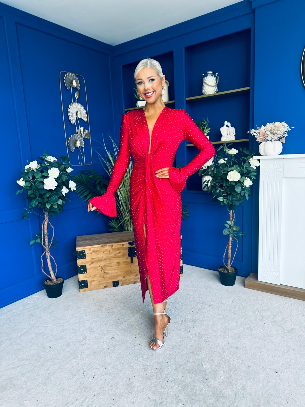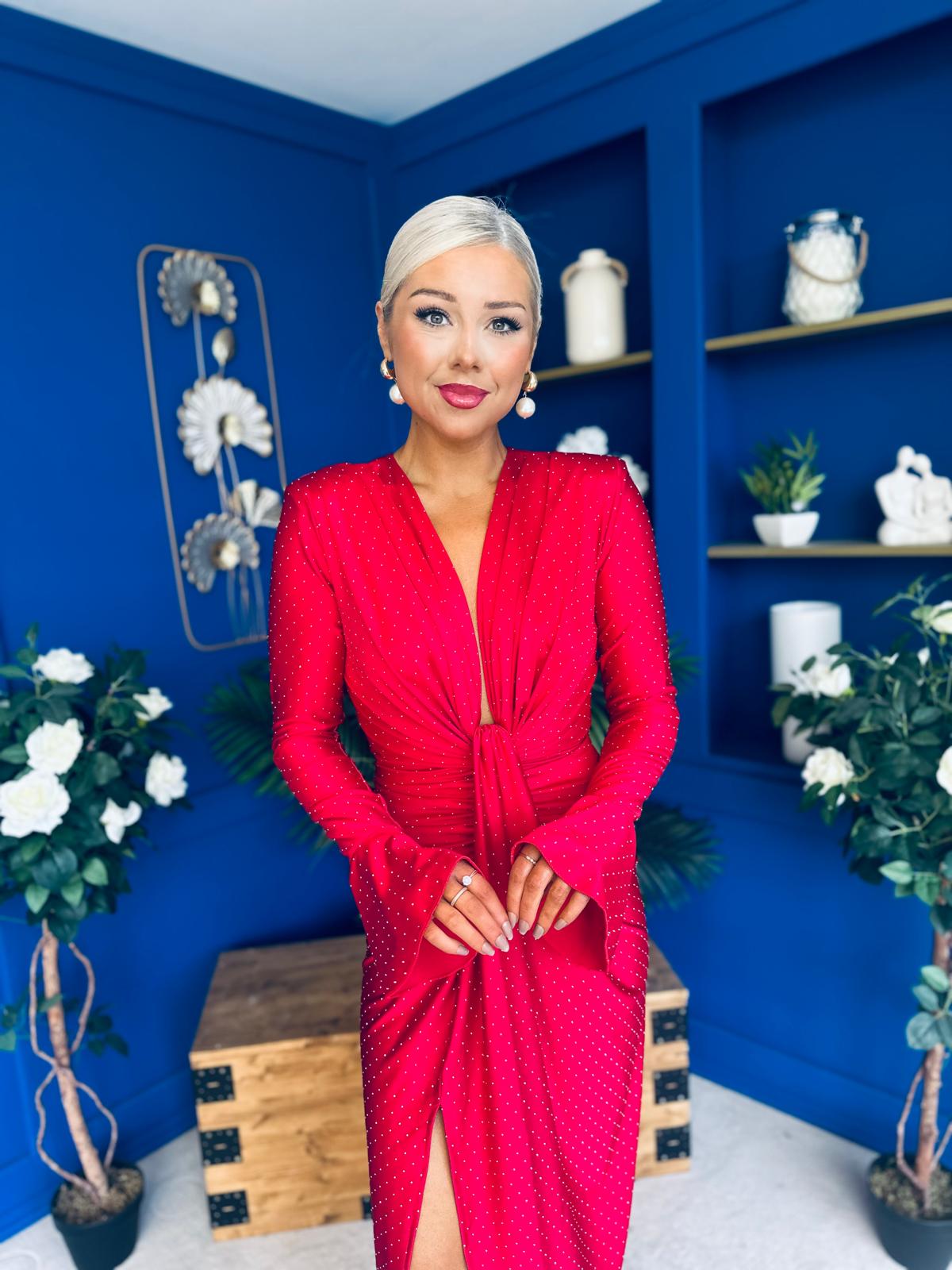 The amazing Ashley occasion dress, in a fabulous studded material, with plunging neckline and full length sleeve with cuff detail.