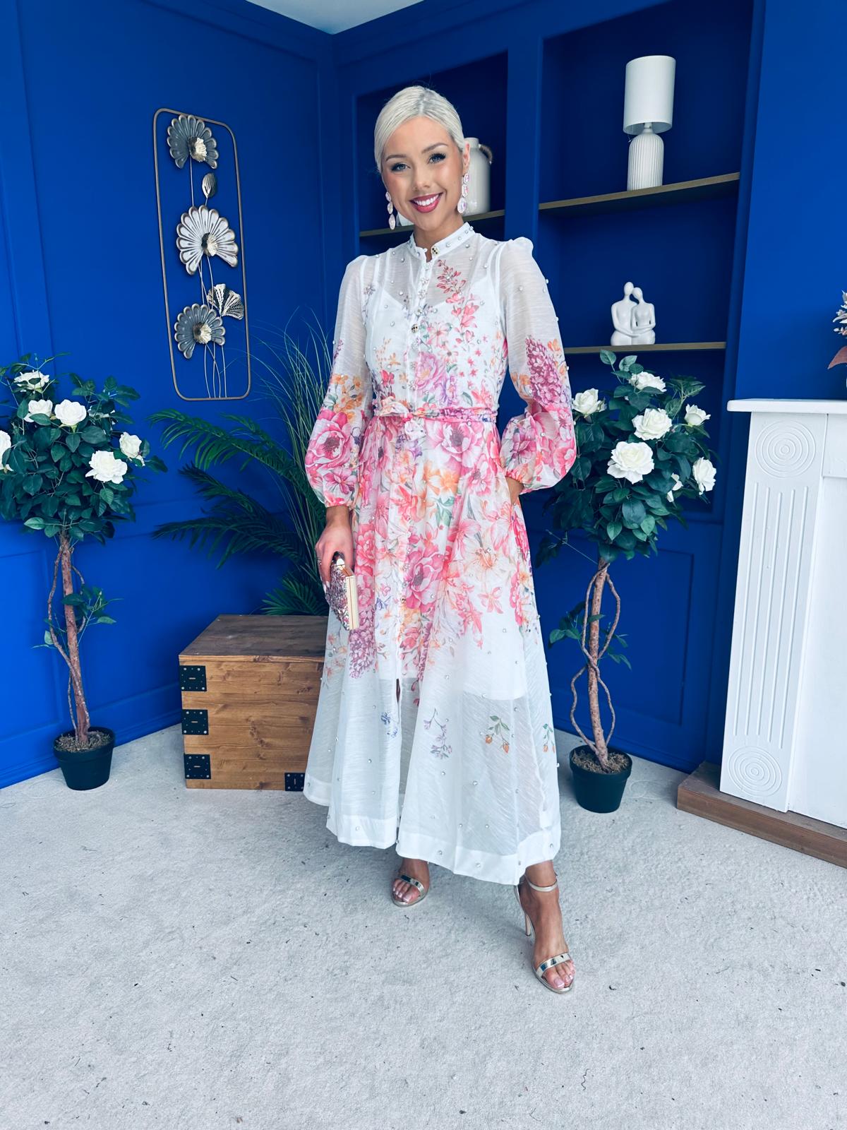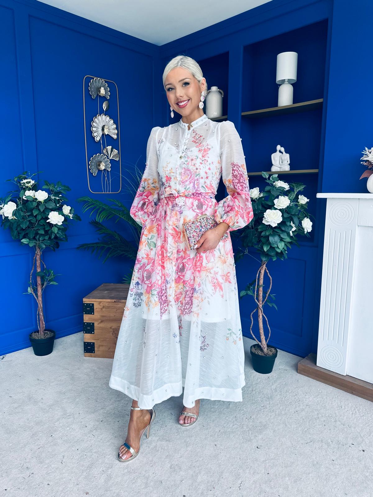 With a classic shirt detail neckline, flowing skirt matching drawstring belt, embellished dabric and a wonderful full sleeve.