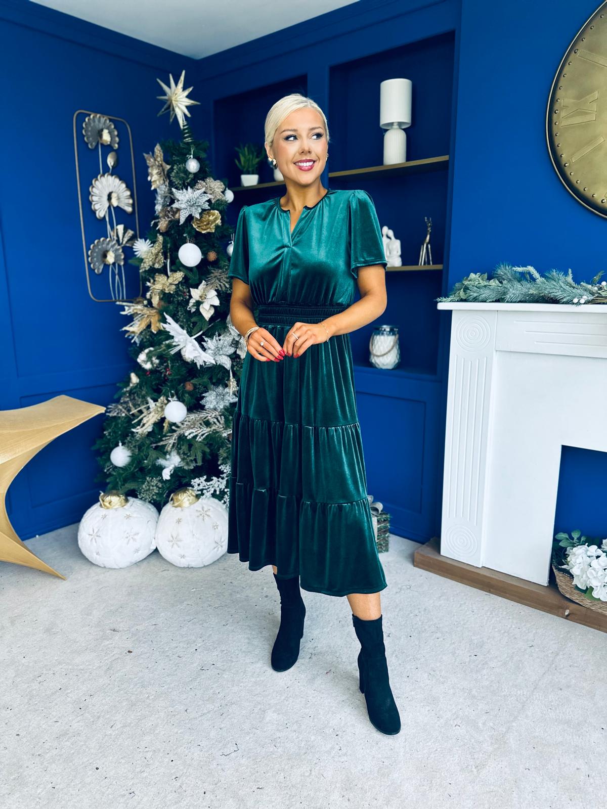 Our new Bethany Dress with Angel sleeve and detailed V neckline, elasticated waistband & flowing detailed skirt is simply fabulous