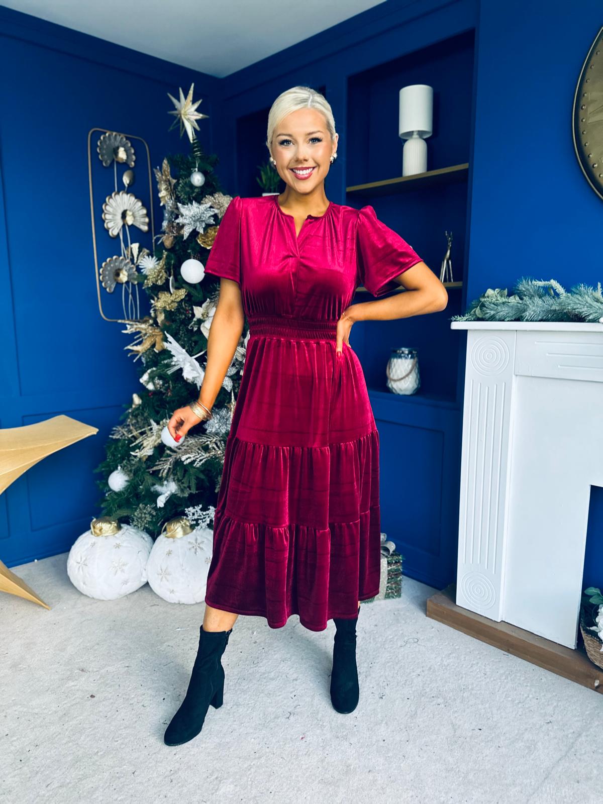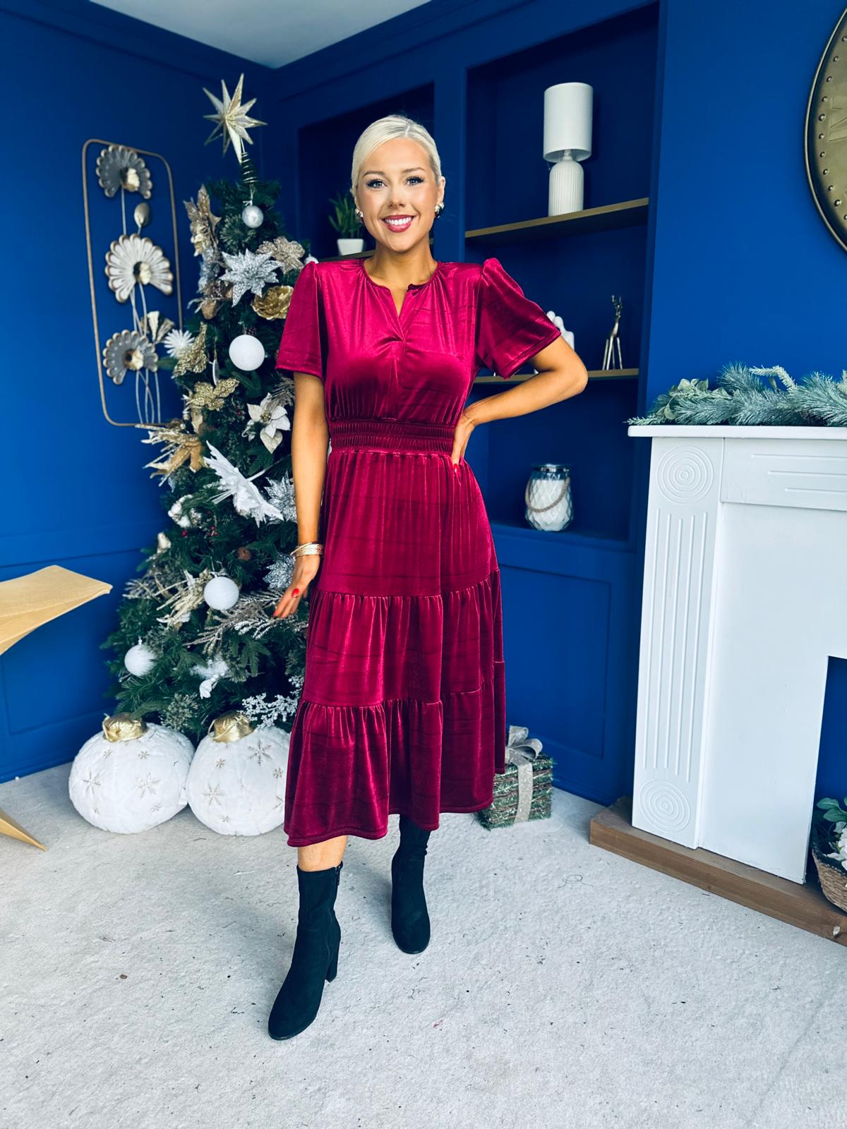 Bethany Detailed Velvet Midi Dress Wine