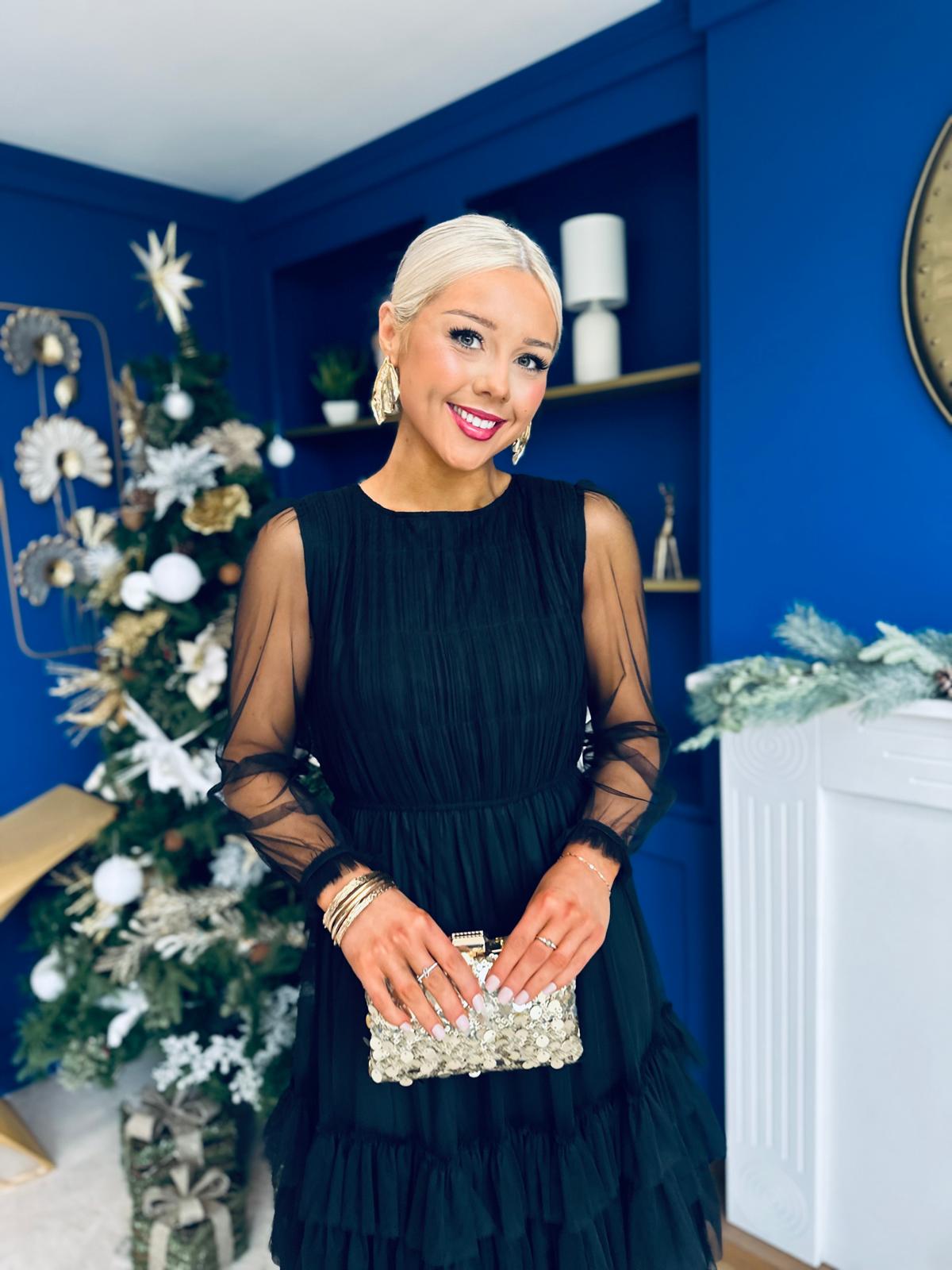 We are loving this flowing maxi dress with a classic rounded neckline, amazing bust detail, elasticated waist for comfort, sheer sleeve and the most fabulous flowing layered tulle skirt.Β