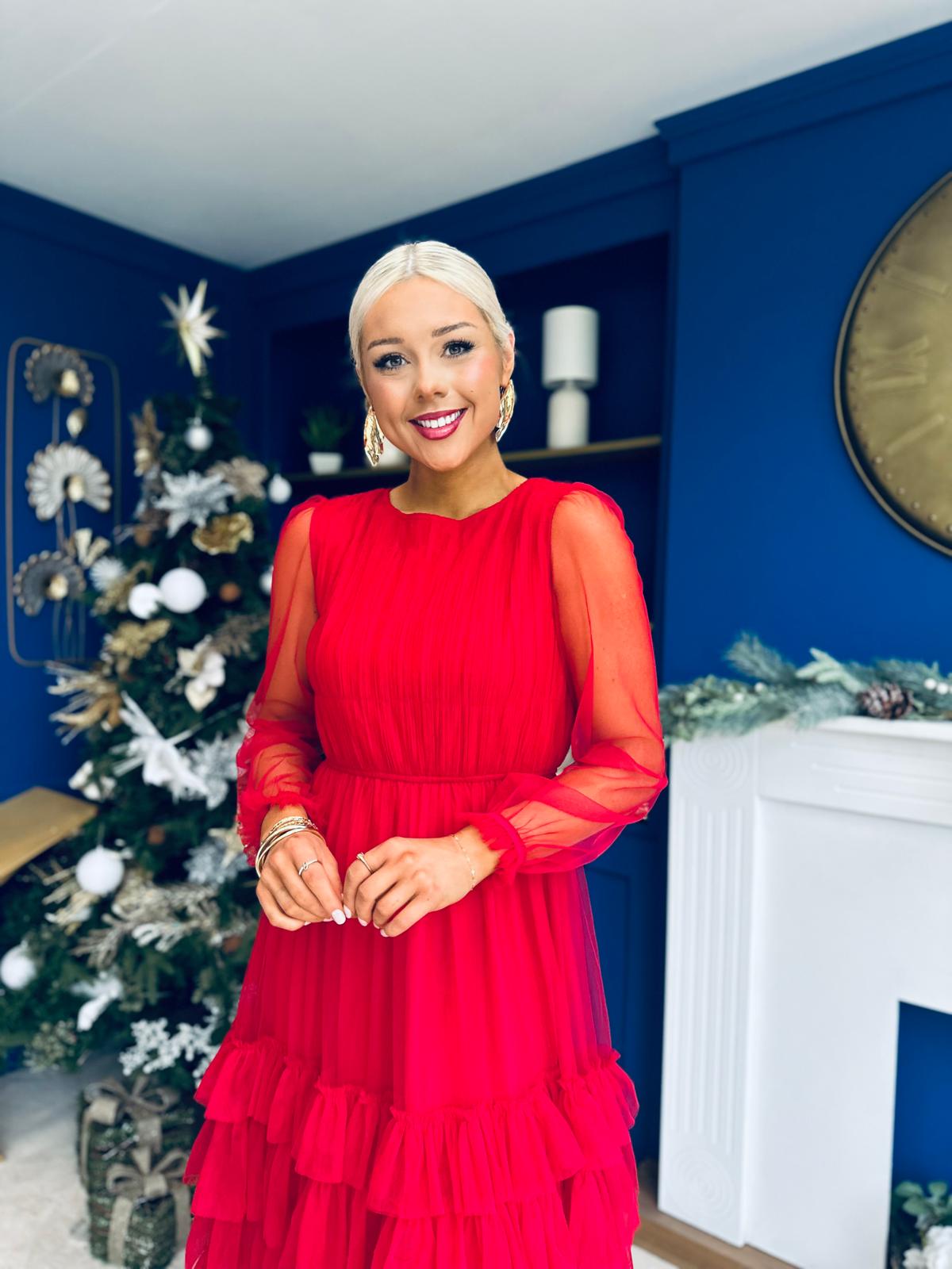 We are loving this flowing maxi dress with a classic rounded neckline, amazing bust detail, elasticated waist for comfort, sheer sleeve and the most fabulous flowing layered tulle skirt.Β