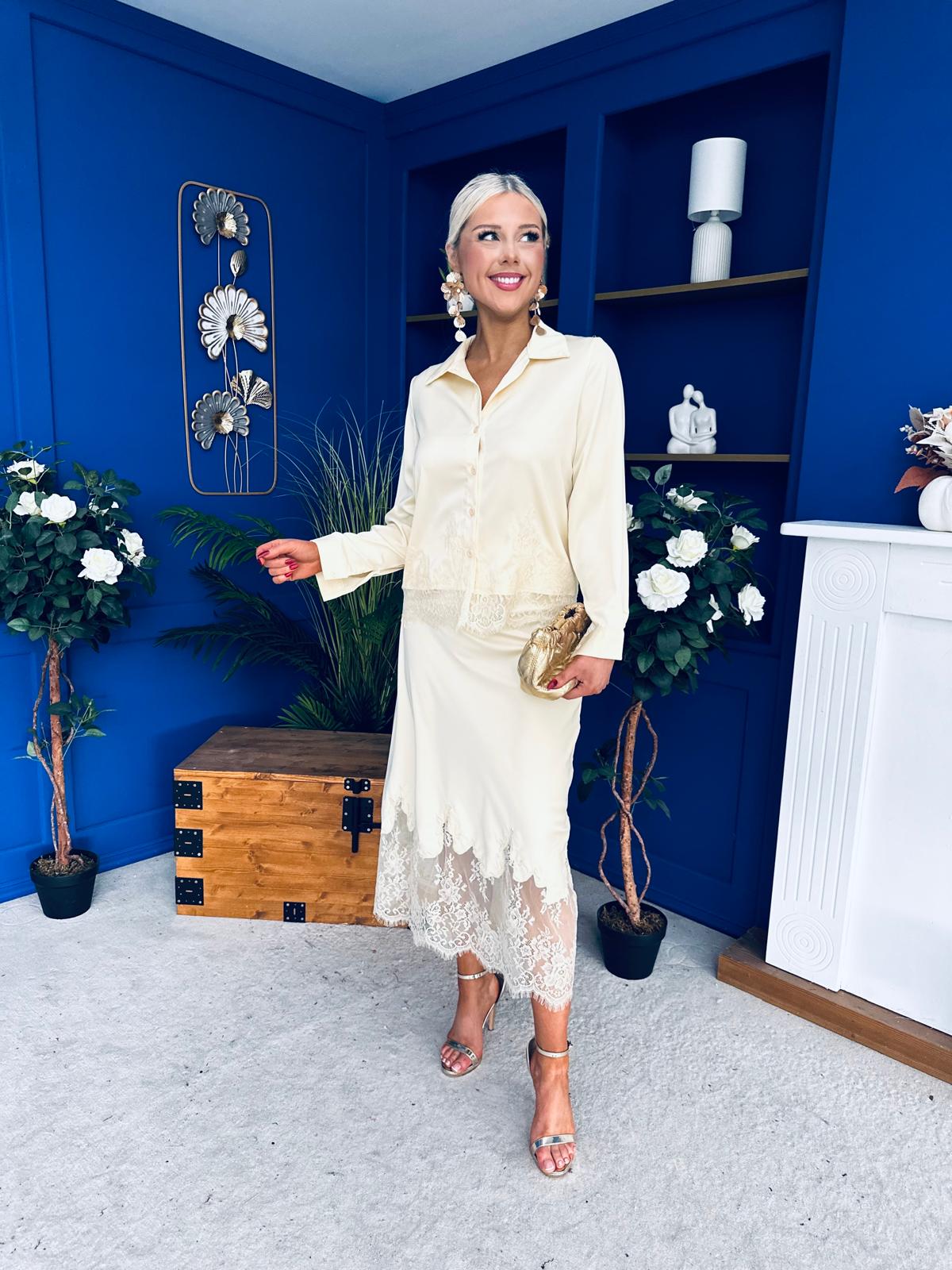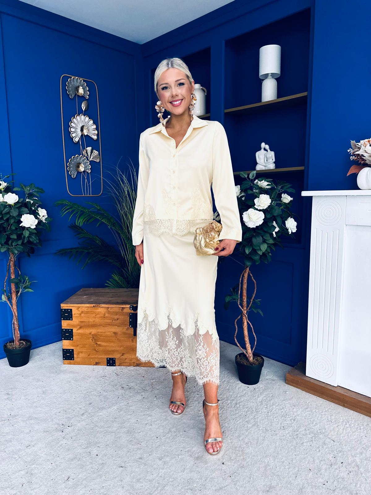 A stand out satin feel shirt and skirt set with eye catching lace detail