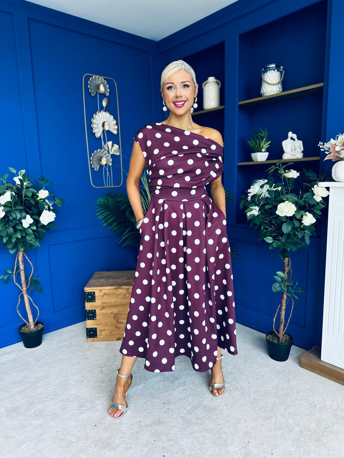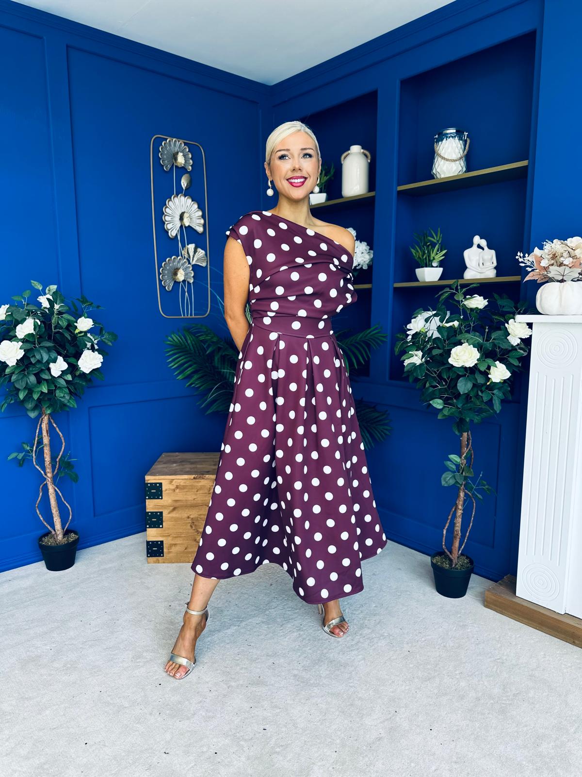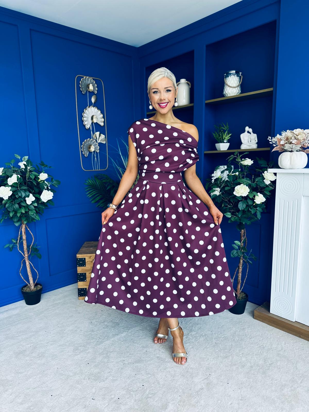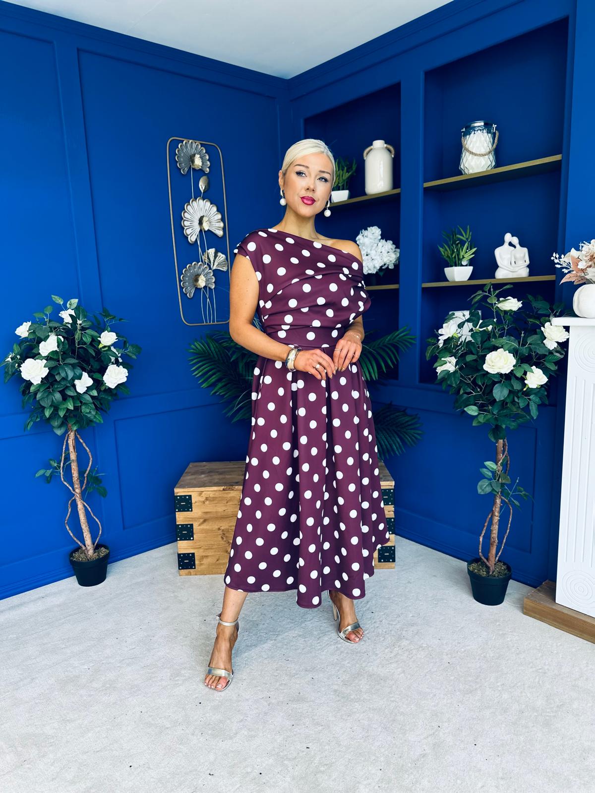 Breffy Asymmetric Neckline Skater Midi Burgundy Polka