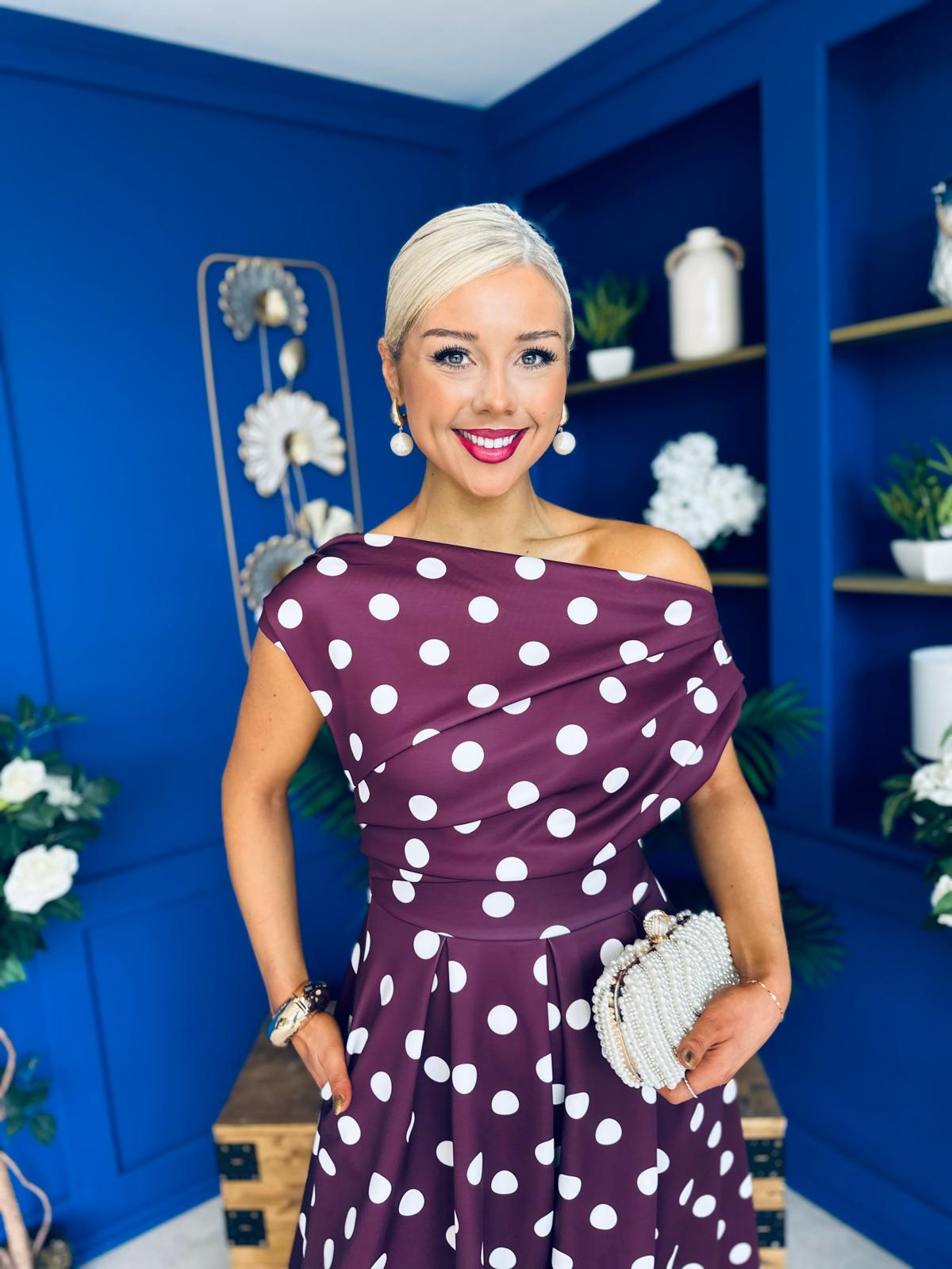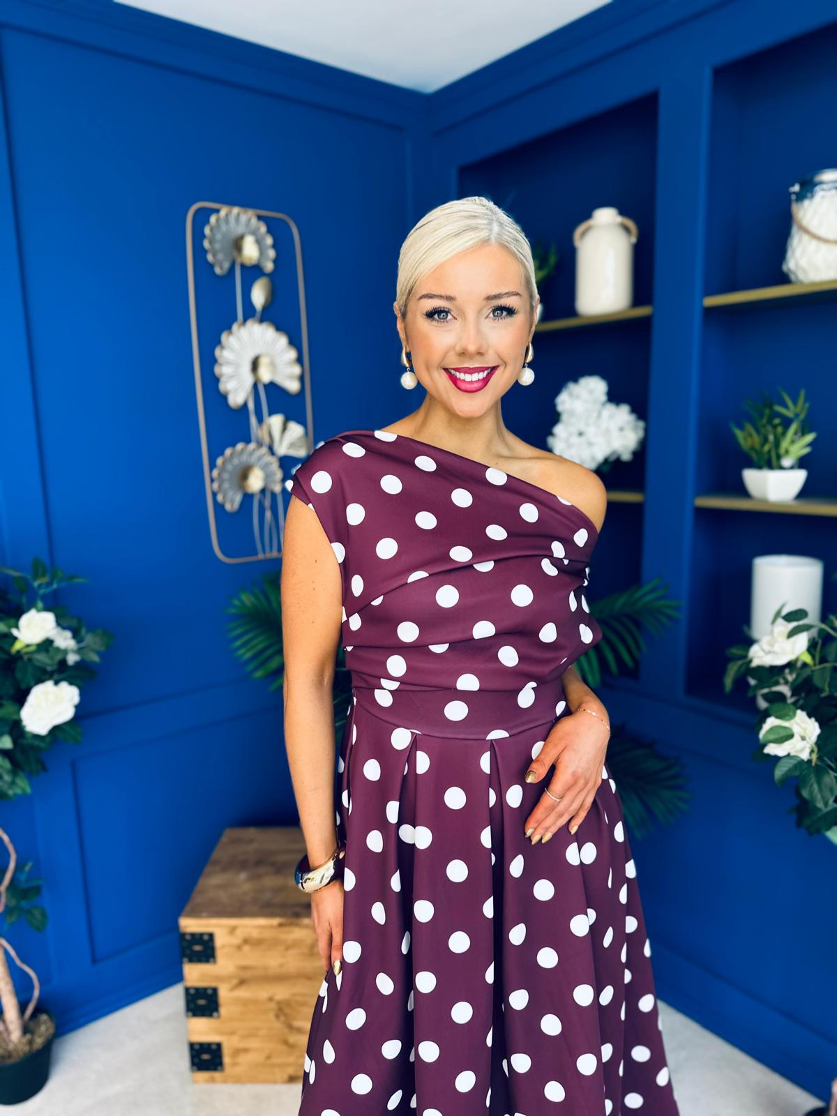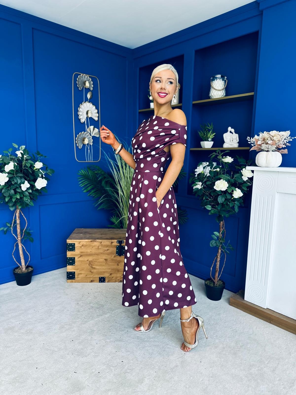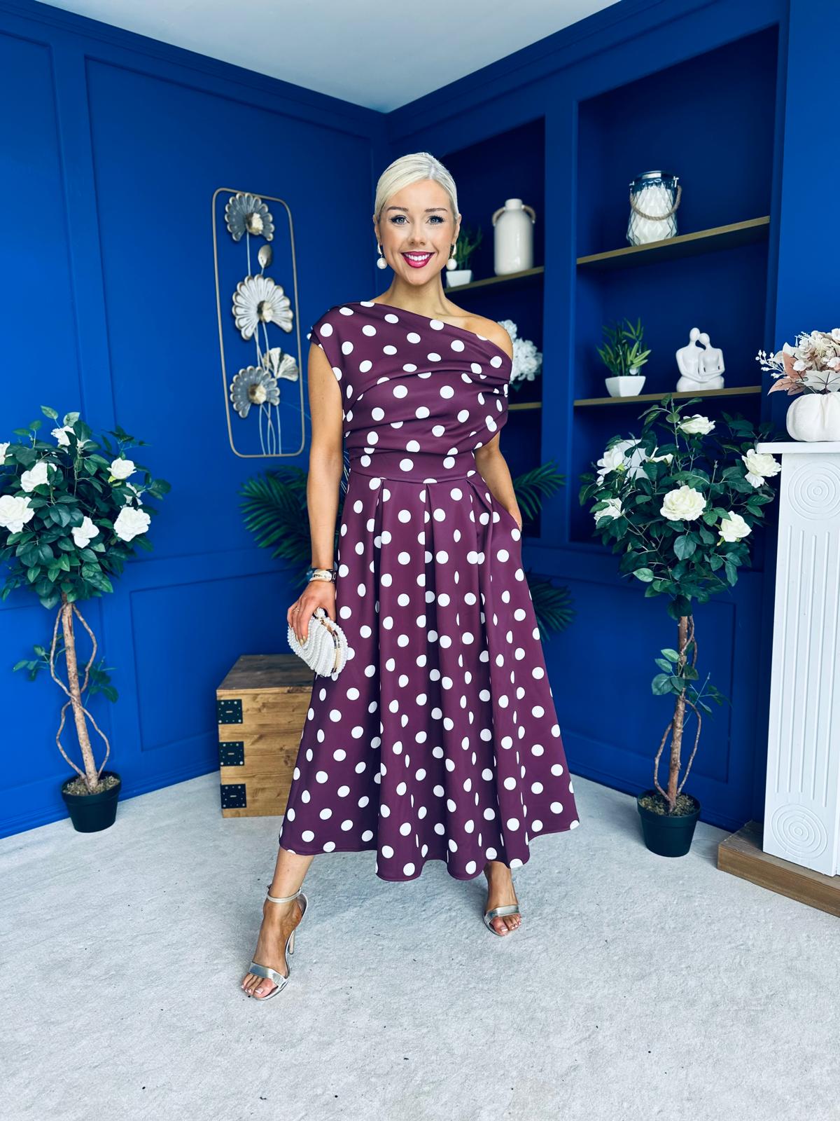 Breffy Asymmetric Neckline Skater Midi Burgundy Polka
