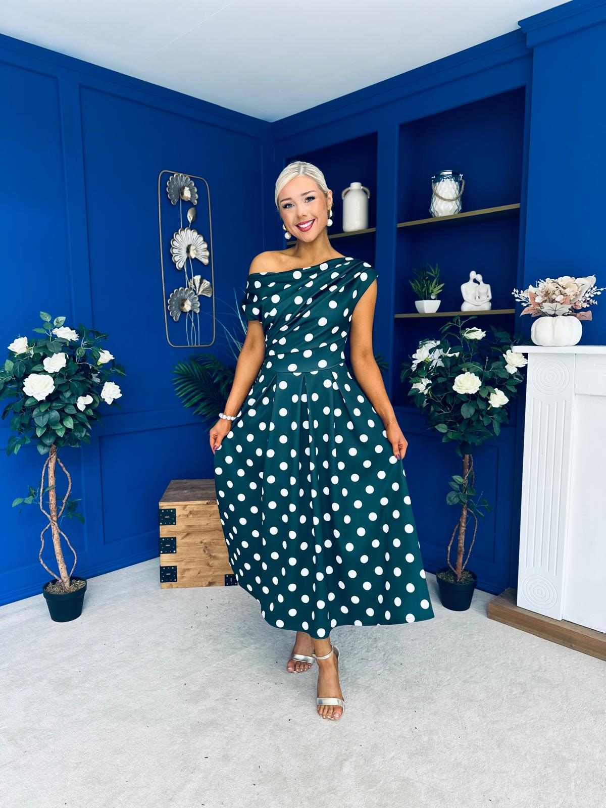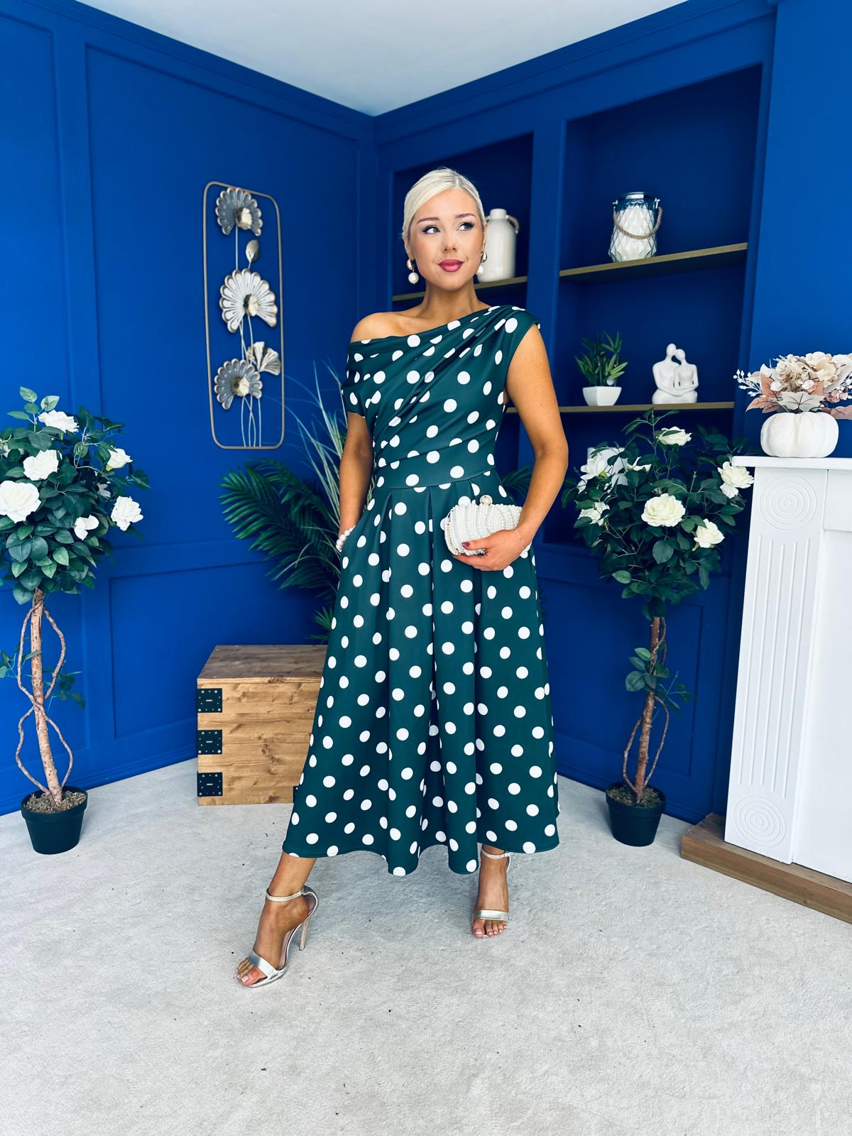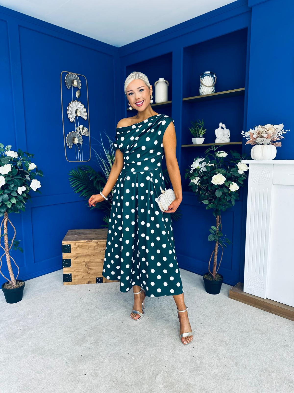 Breffy Asymmetric Neckline Skater Midi Forest Polka