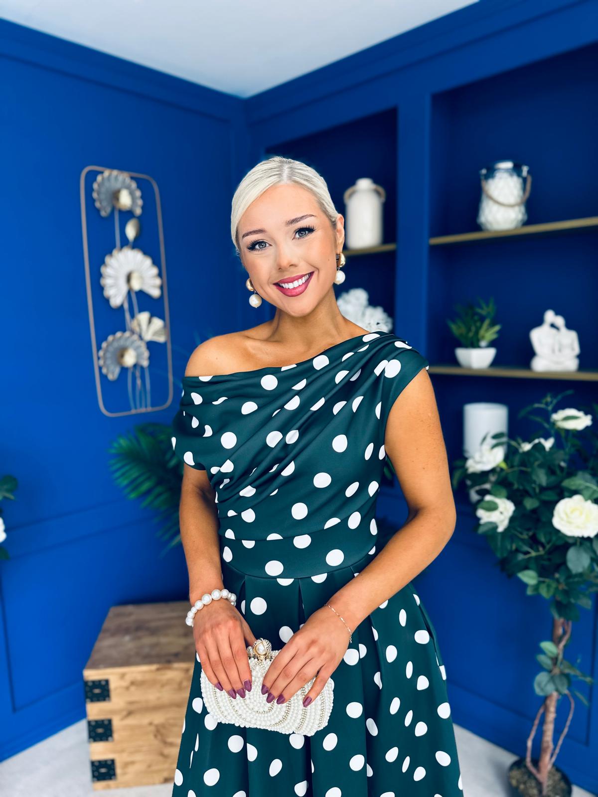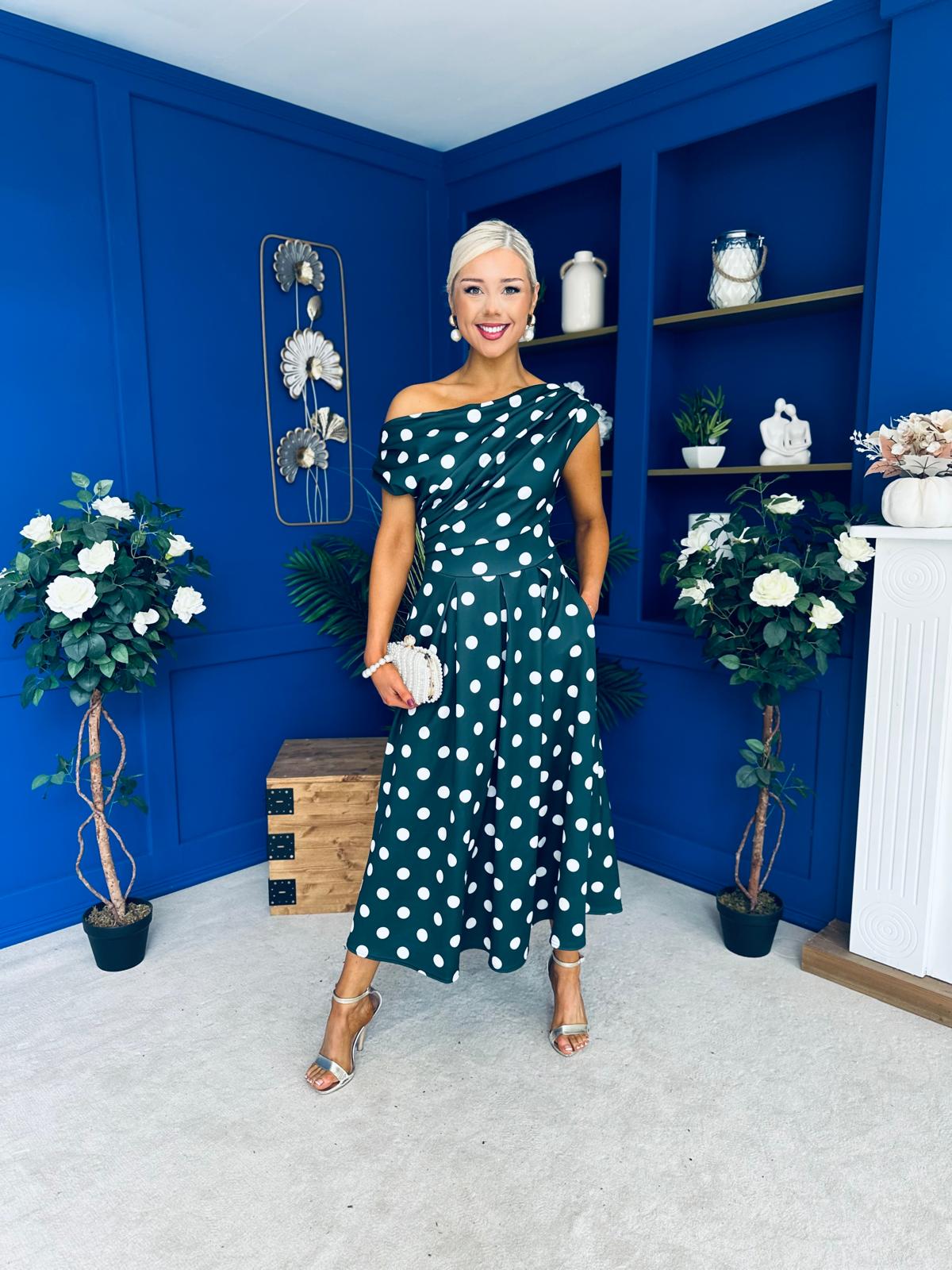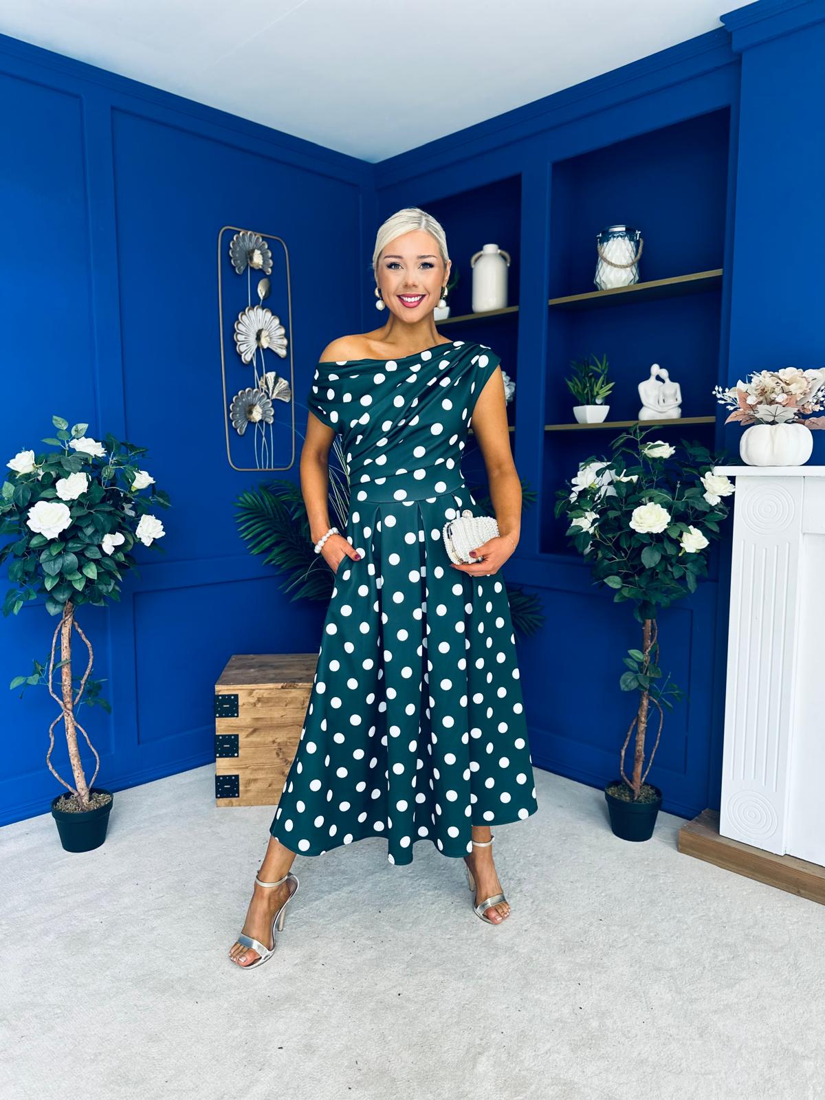 Breffy Asymmetric Neckline Skater Midi Forest Polka