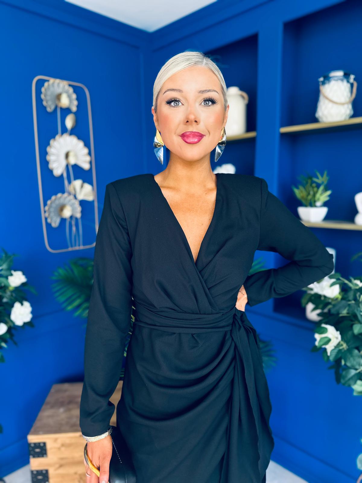 Featuring padded shoulders for a statement silhouette and a flattering wrap front skirt, this dress will make you feel and look your best.