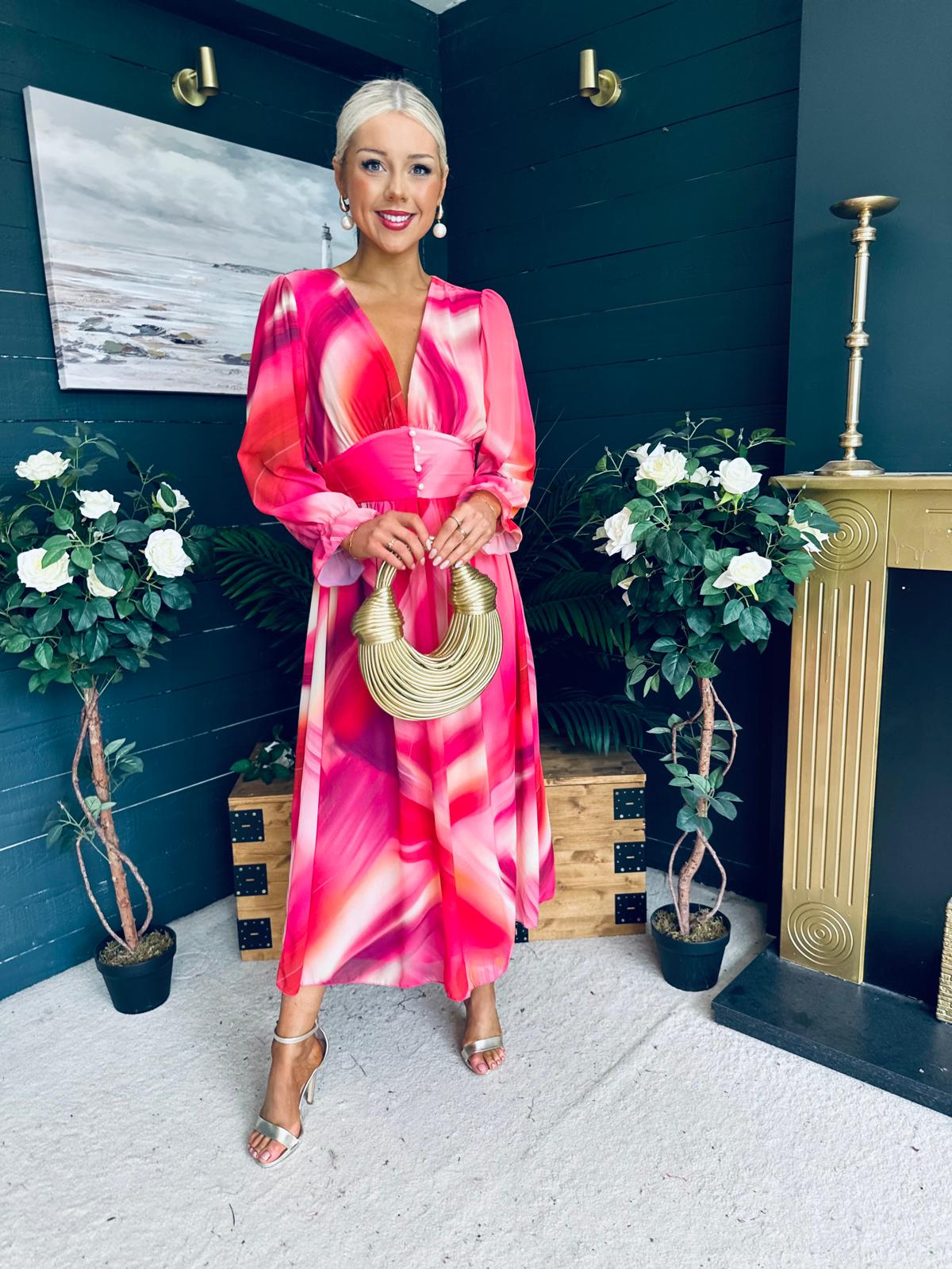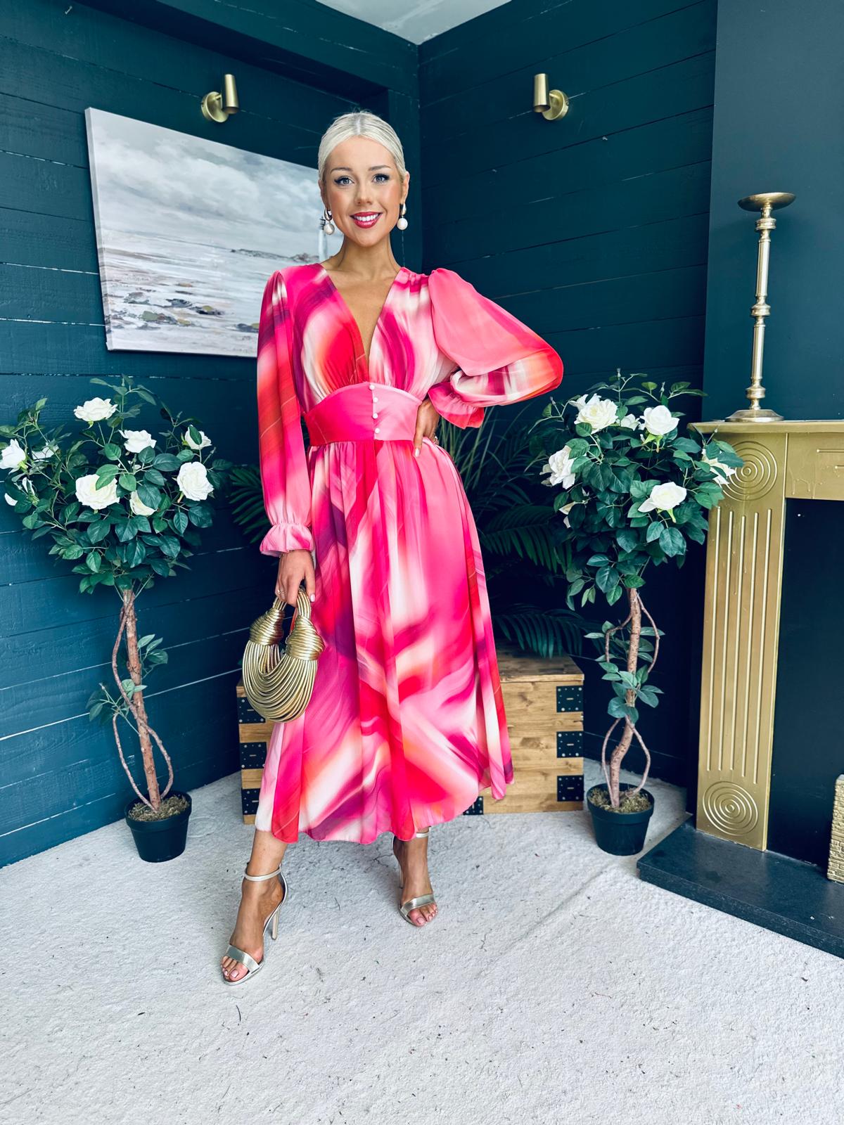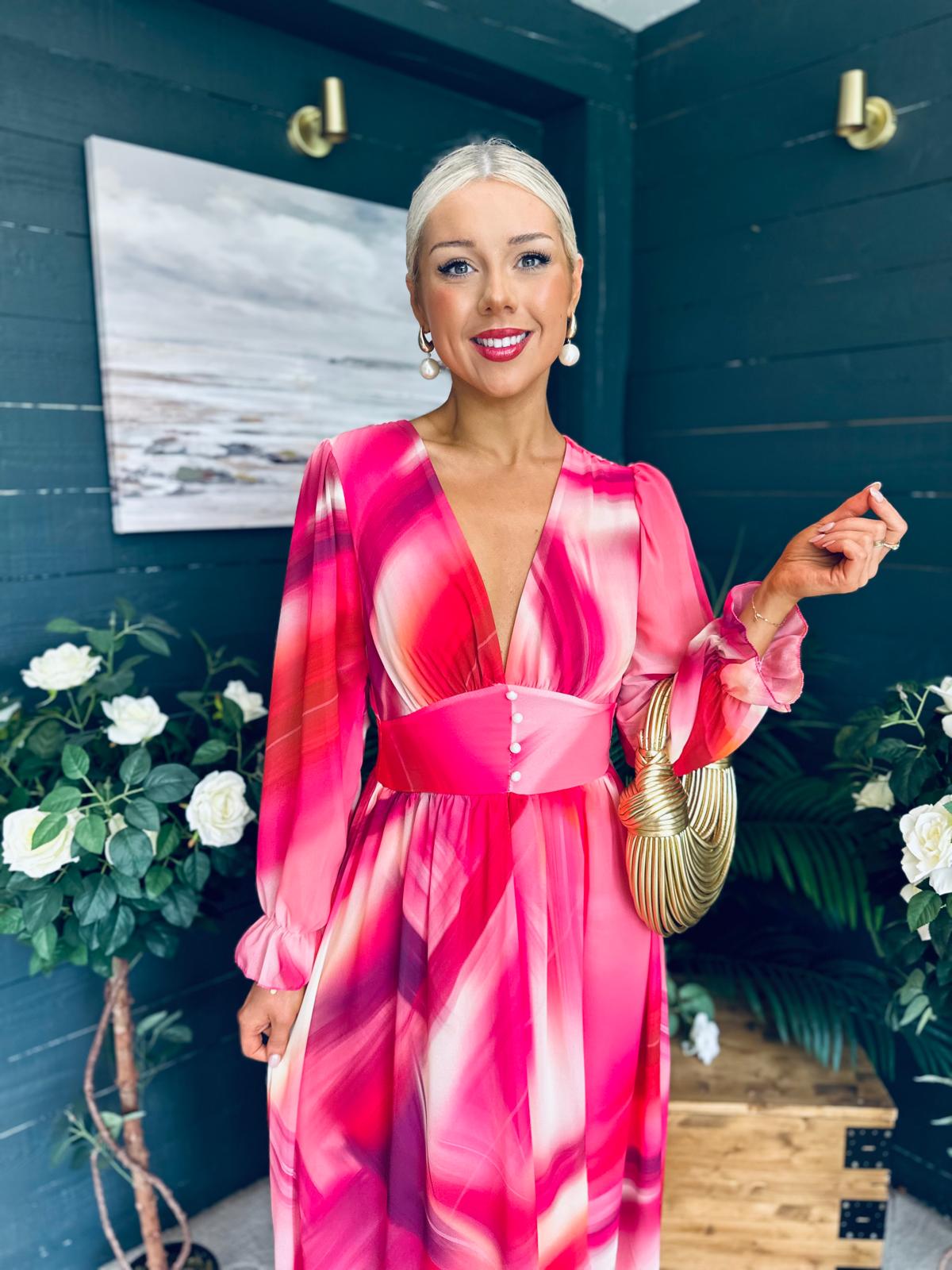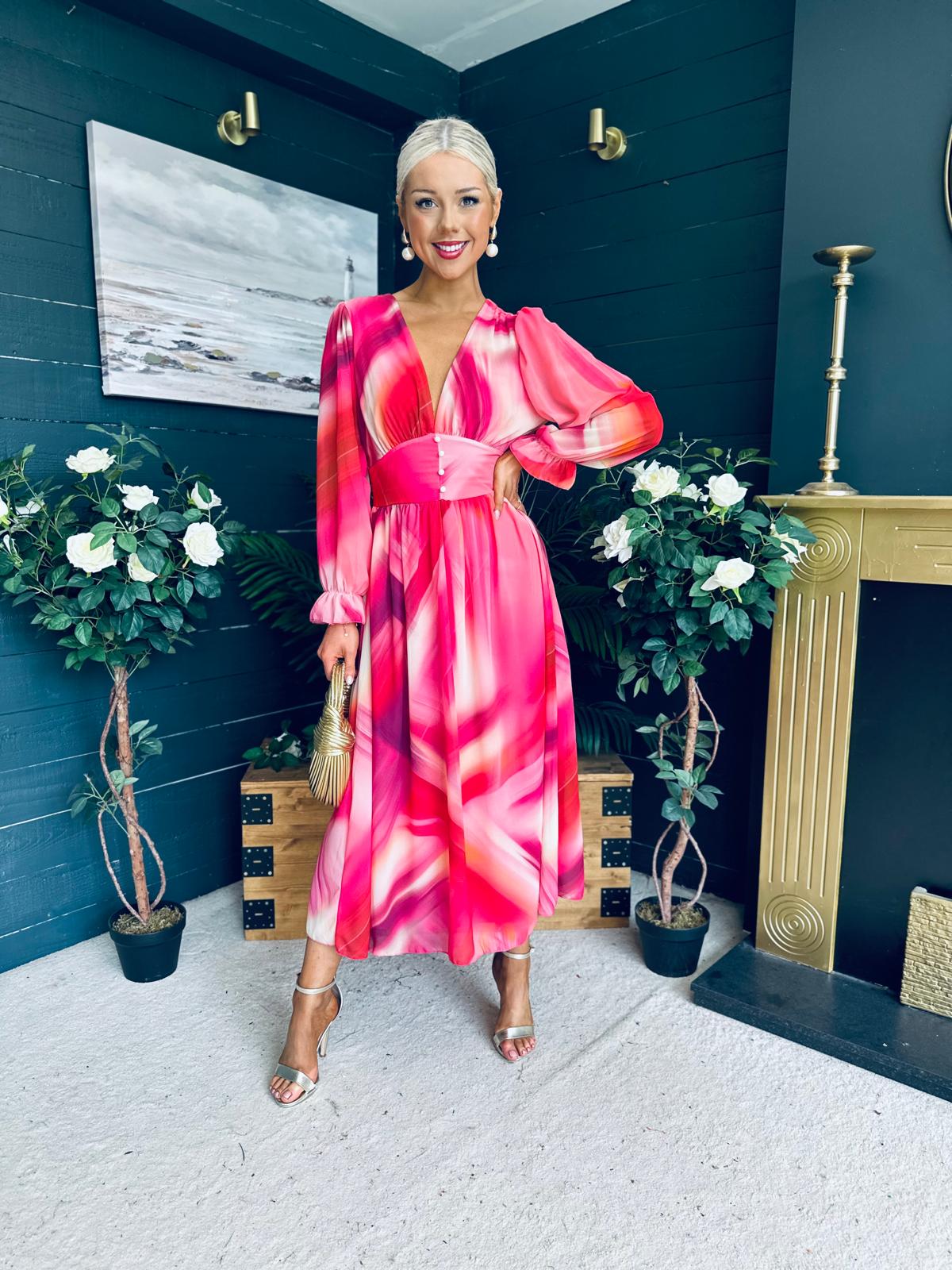 This occasion dress has a beautiful full sleeve, V neckline, button detail banded midriff, elasticated and flowing skirt for a statement silhouette and a flattering look, this dress will make you feel and look your best.