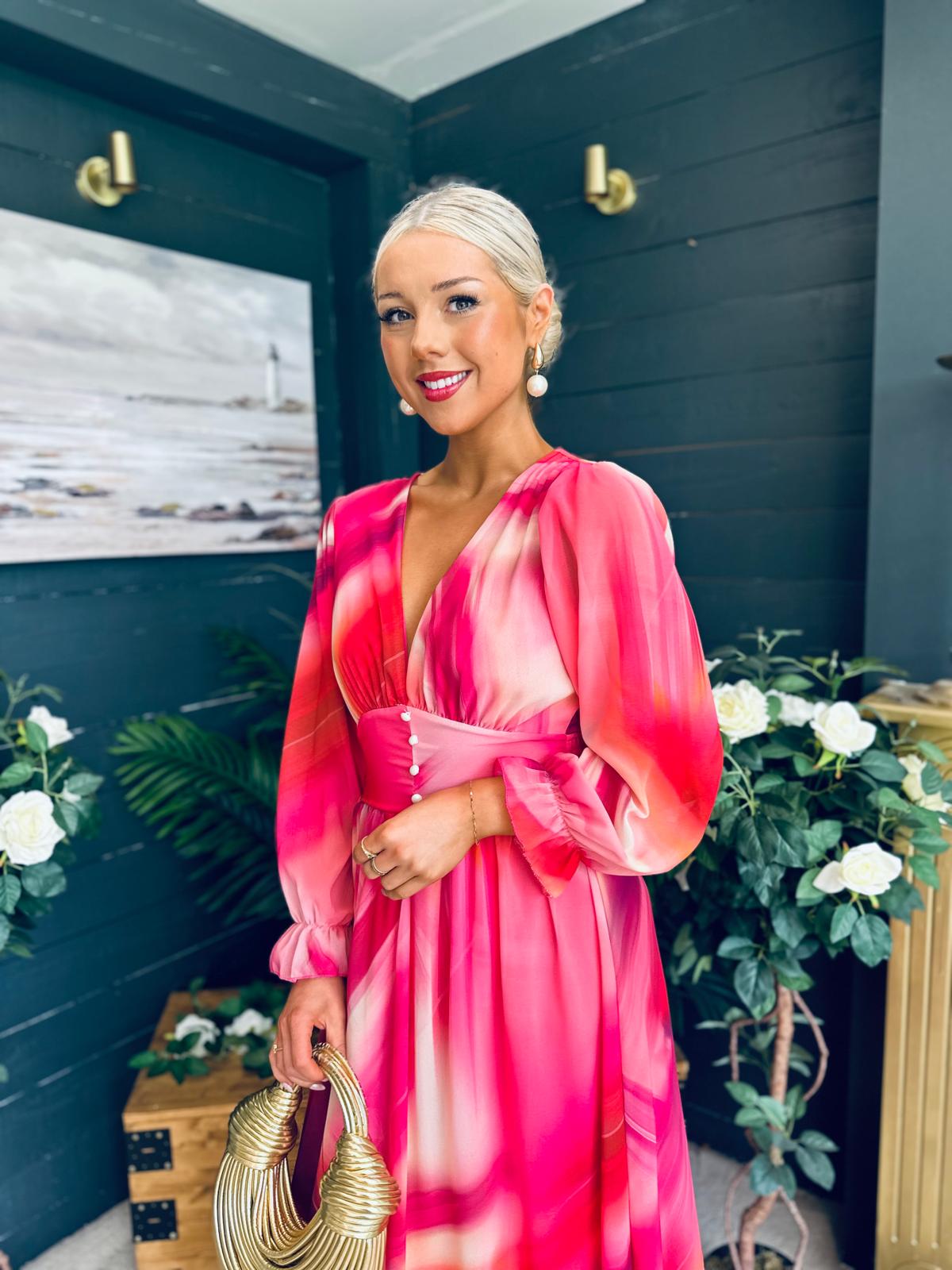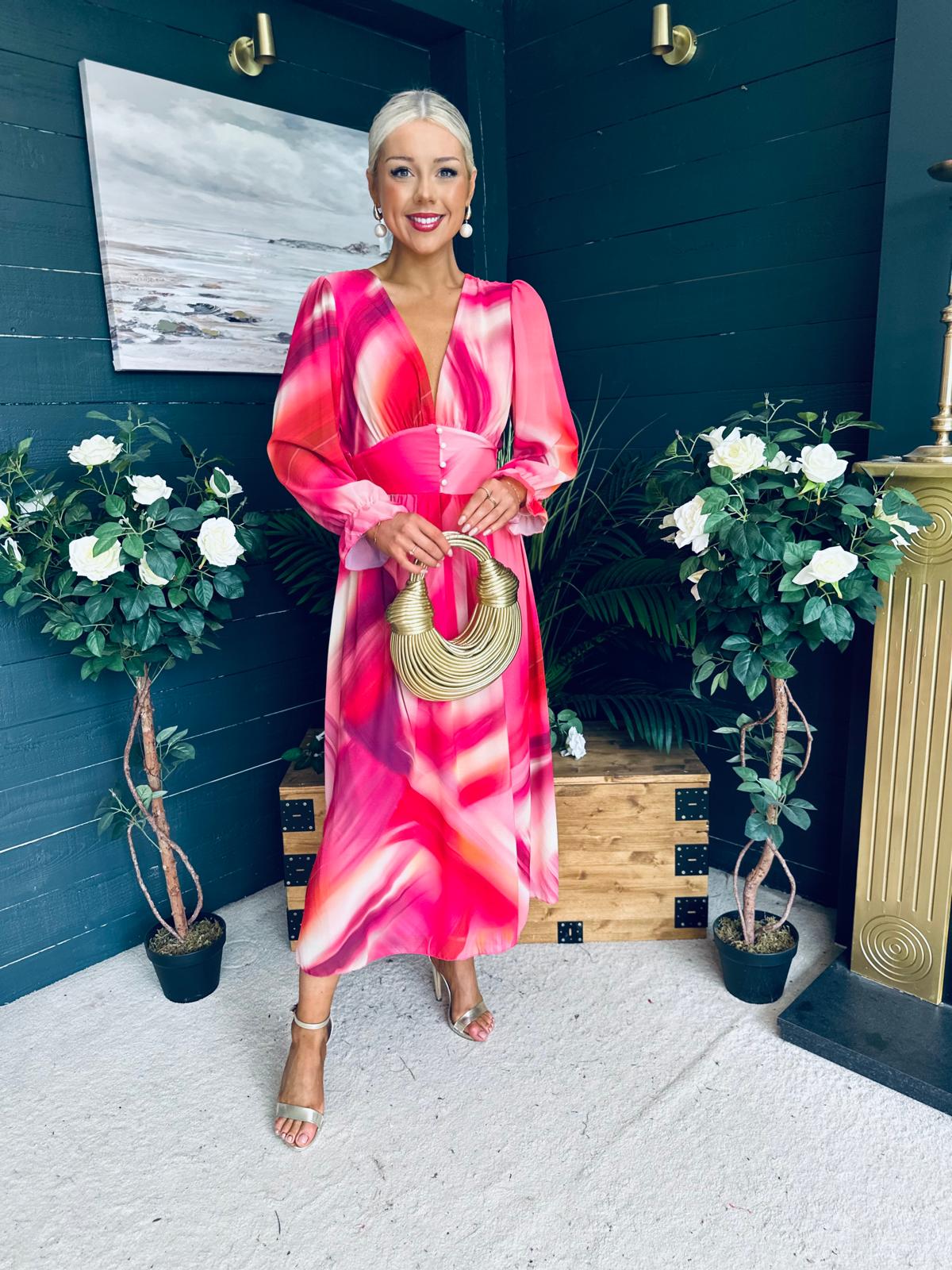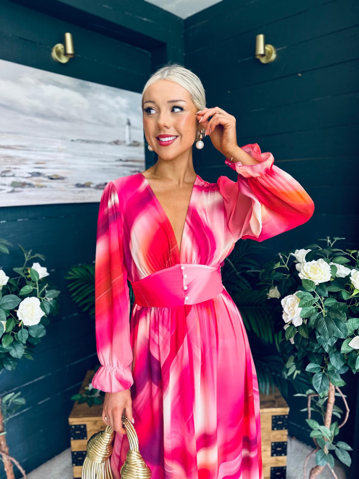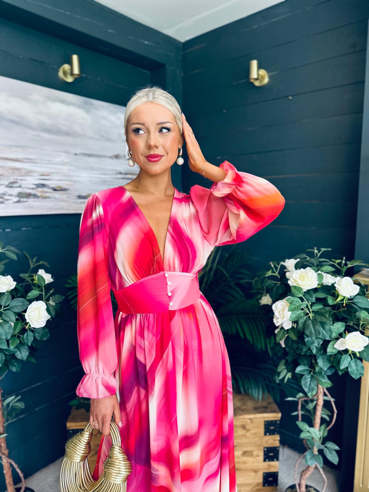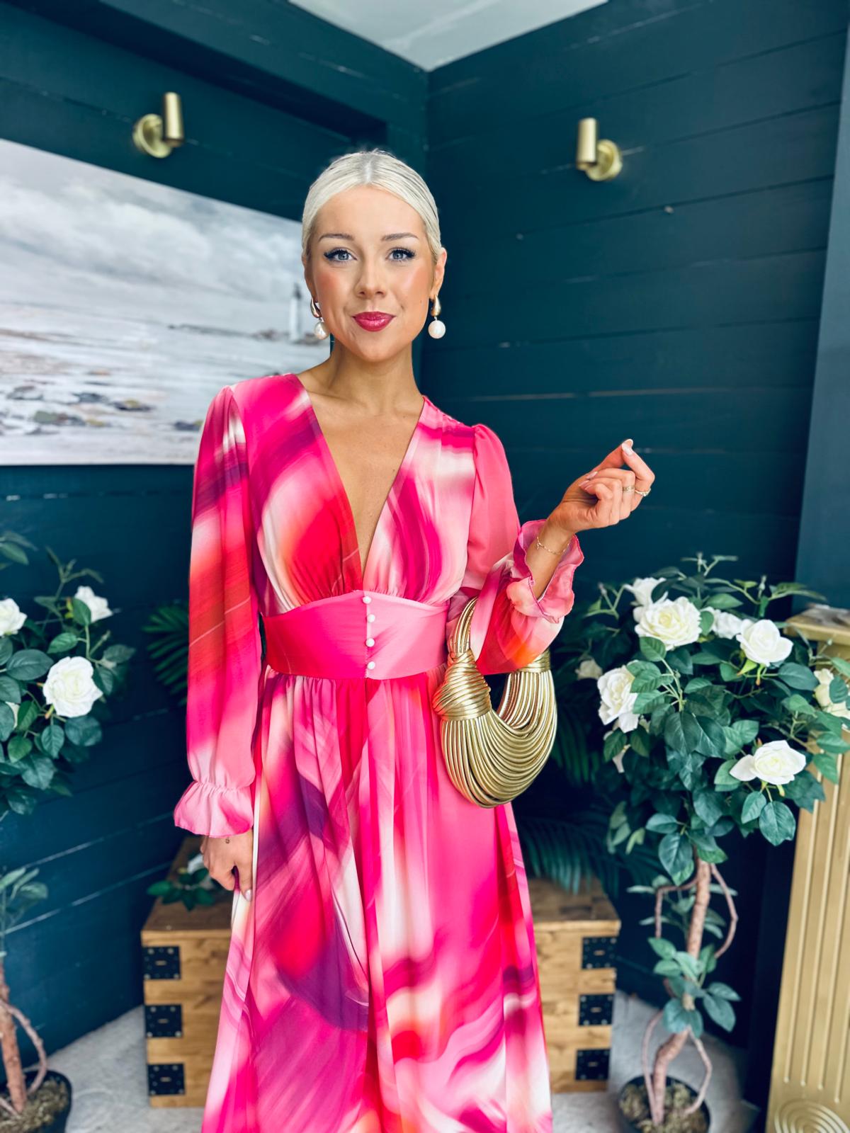 This occasion dress has a beautiful full sleeve, V neckline, button detail banded midriff, elasticated and flowing skirt for a statement silhouette and a flattering look, this dress will make you feel and look your best.