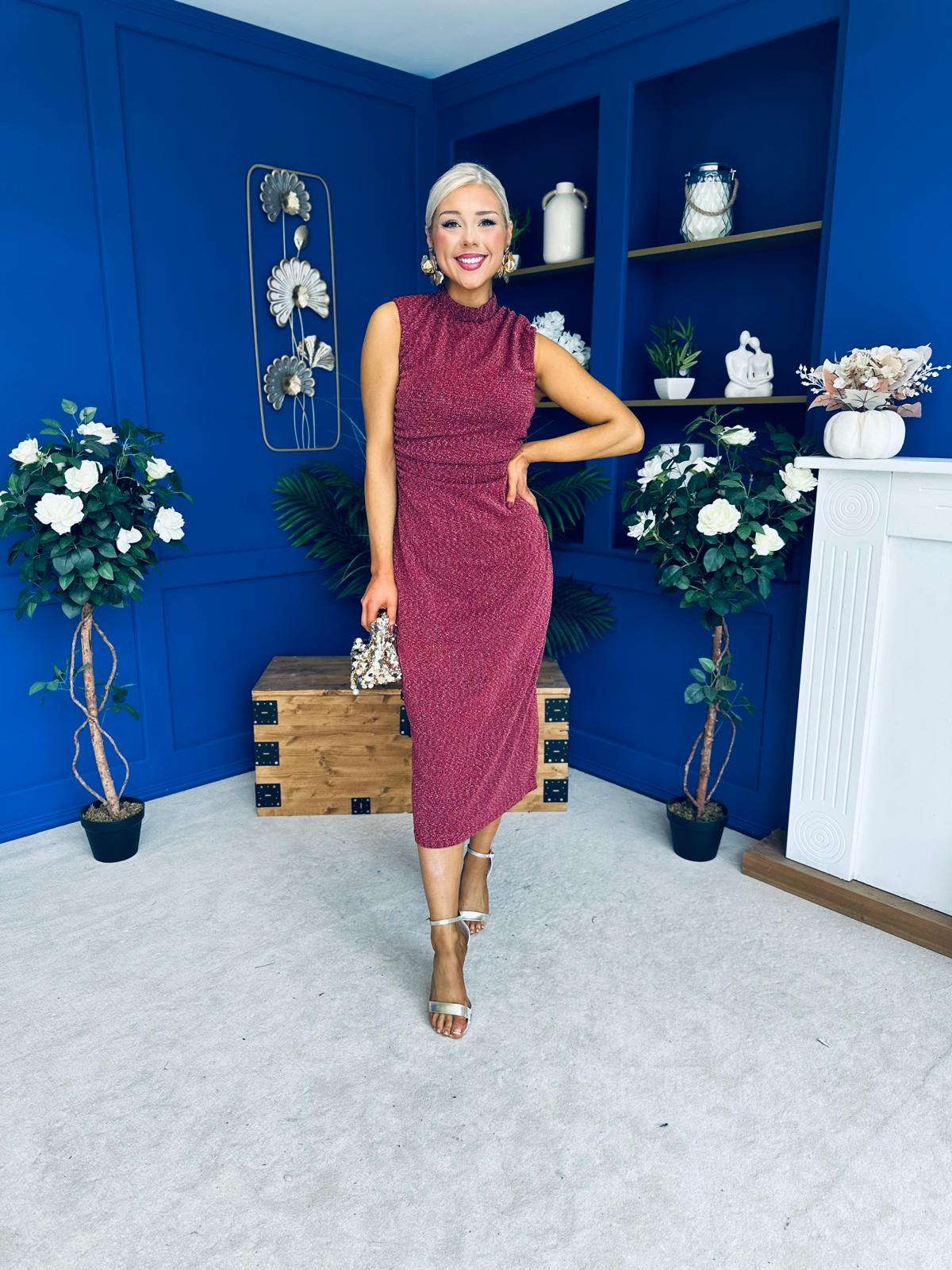 Calista Gathered Shimmer Maxi Dress Rouge