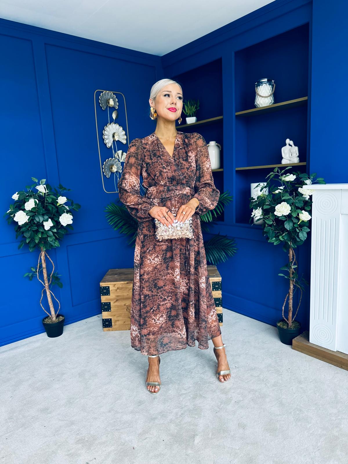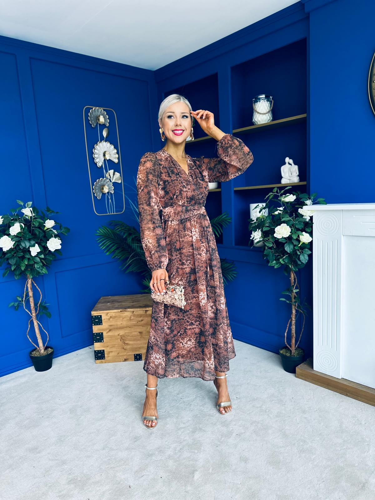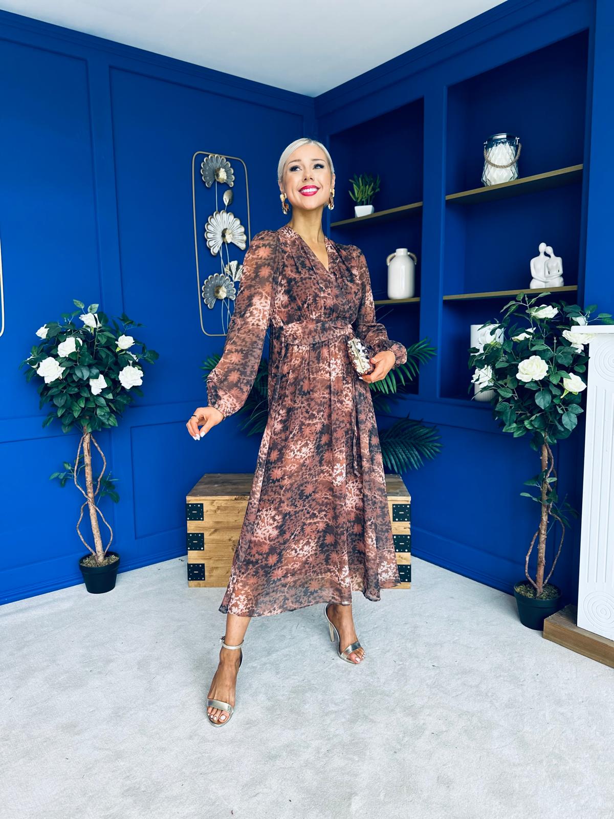 Its dramatic style, wrap over neckline & full sleeve with banded midriff and layered skirt create a stand out look