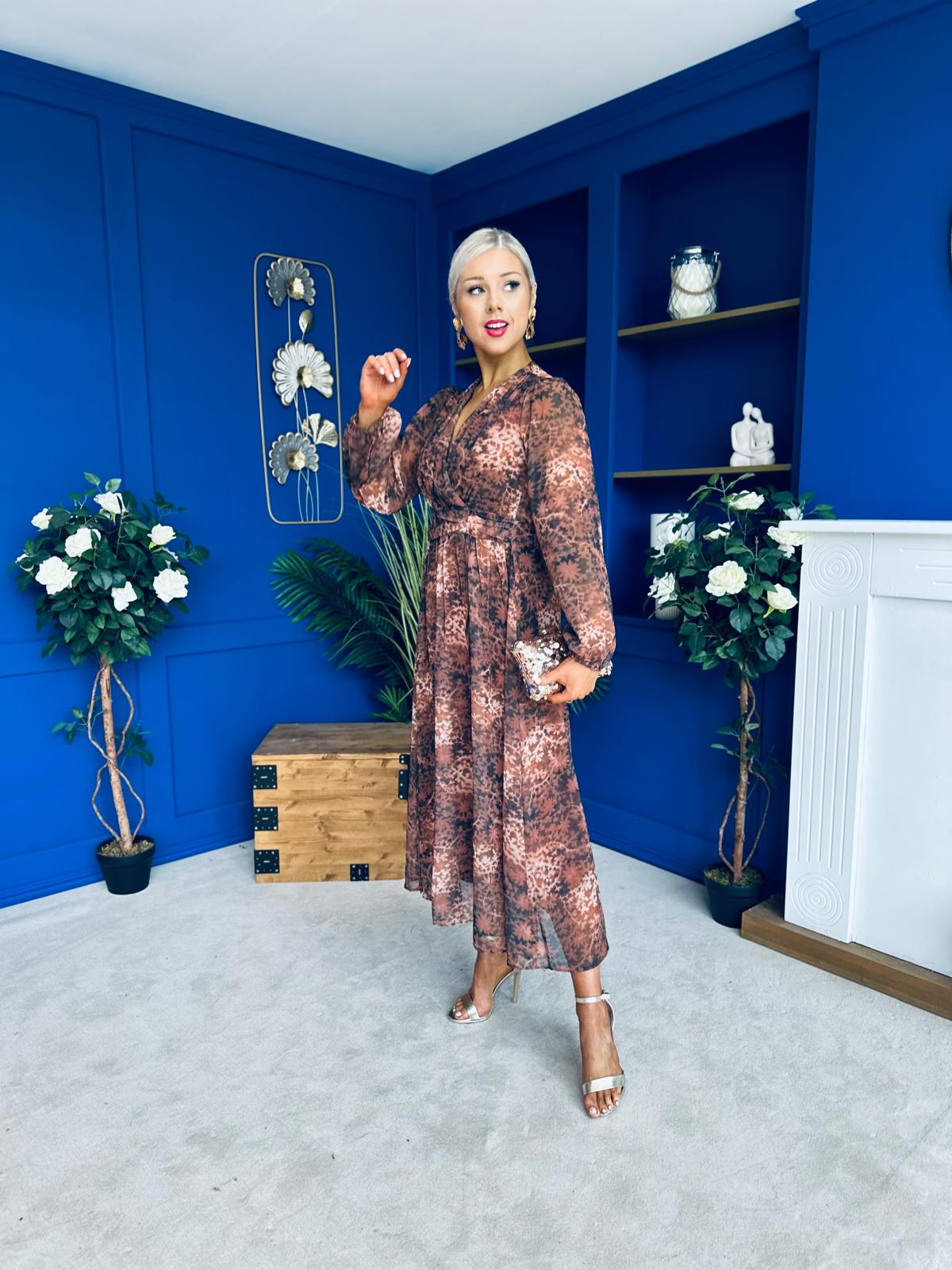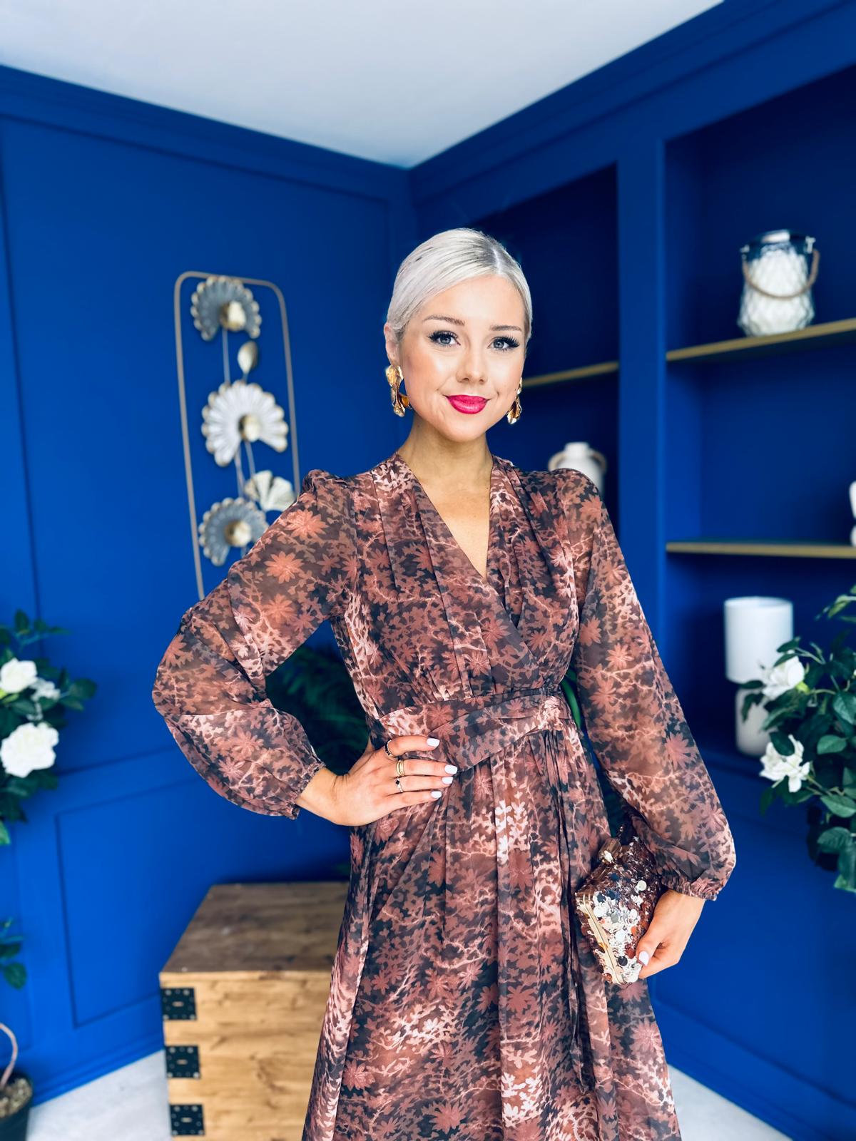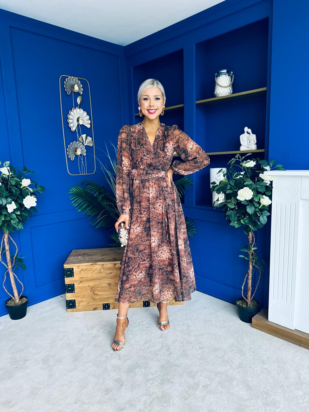 Its dramatic style, wrap over neckline & full sleeve with banded midriff and layered skirt create a stand out look