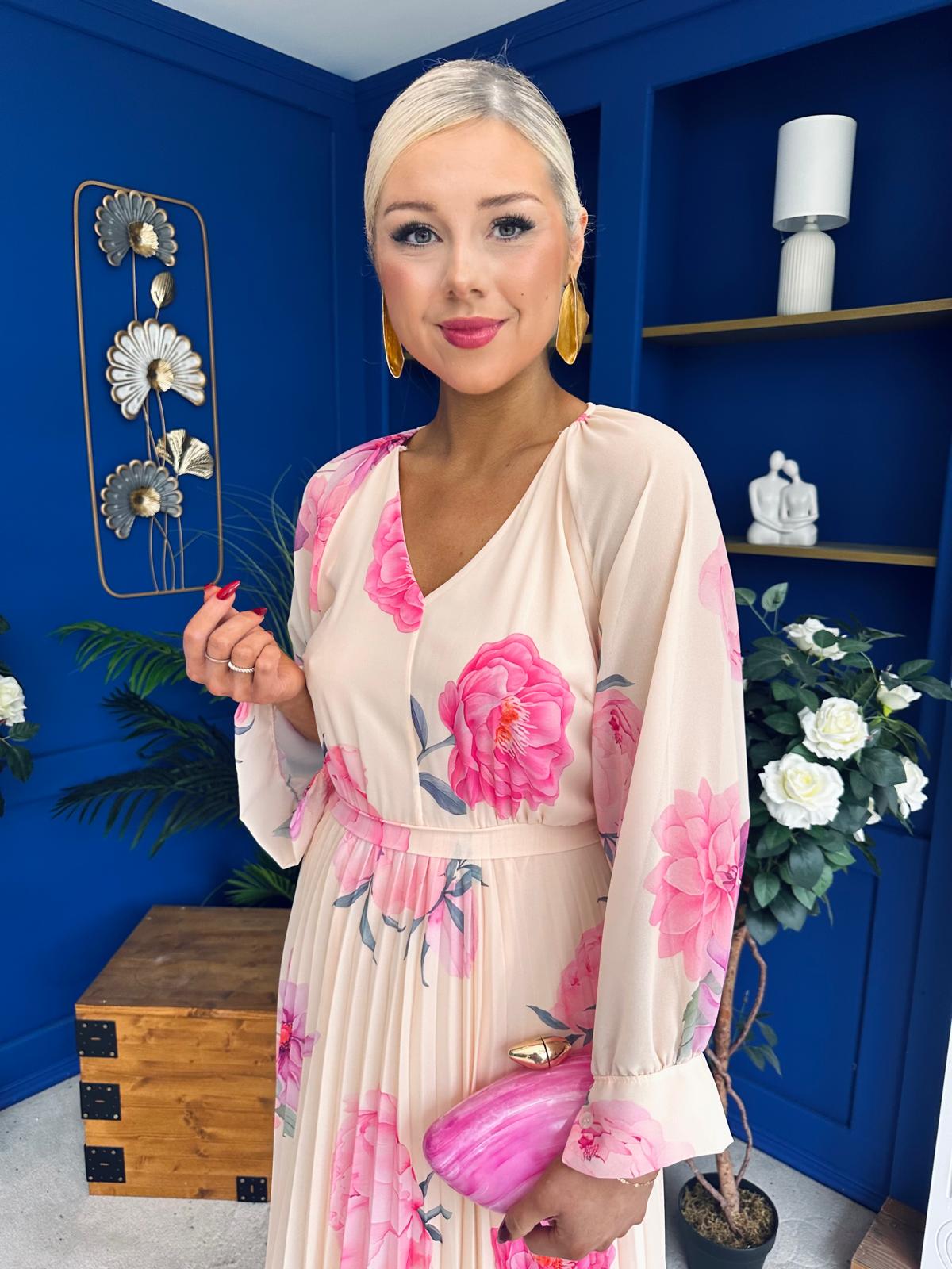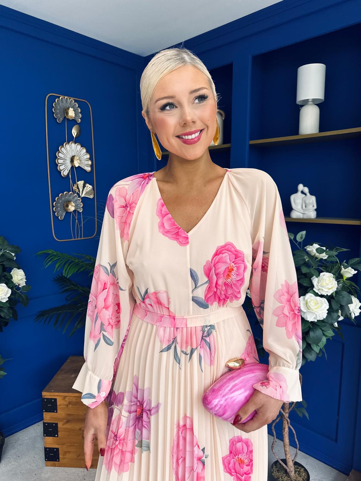 With a fabulous soft round neckline, gathered bust, beautiful full cuffed sleeve, banded midriff, elasticated waist to cinch with comfort and flowing pleated skirt to flatter