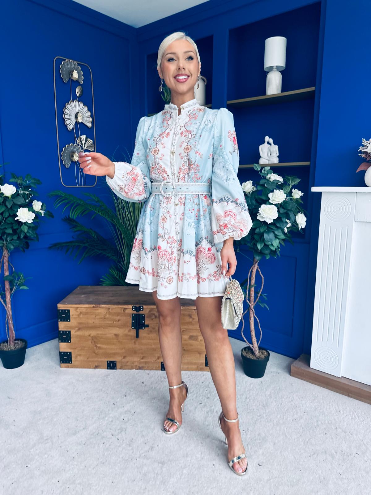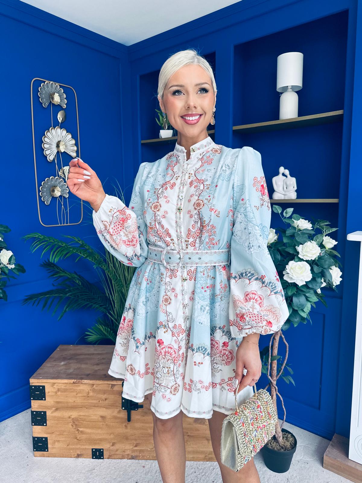 With a classic shirt detail neckline, flowing skirt matching belt and a wonderful full sleeve.