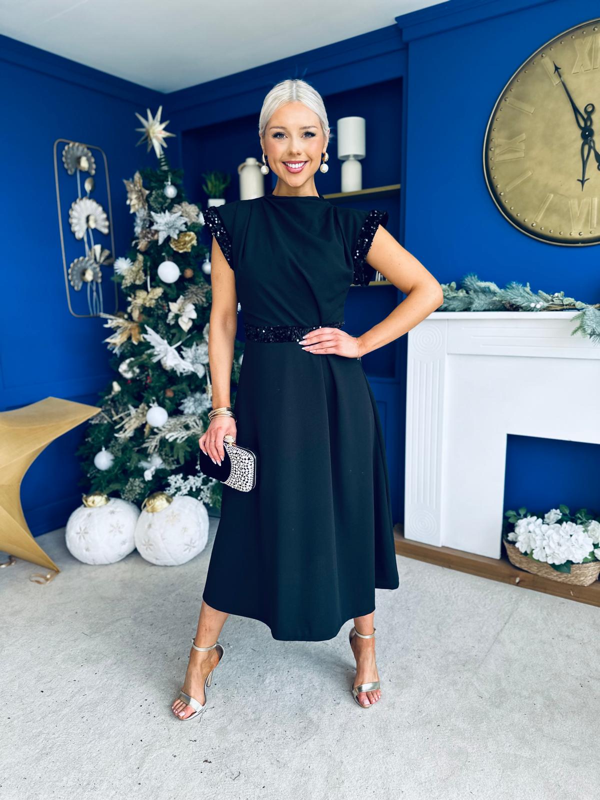 The high neckline, padded shoulder, flowing skirt and sequin trim to sleeve and waistband make this dress a one of a kind