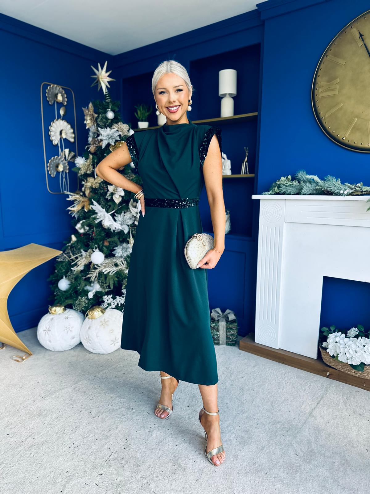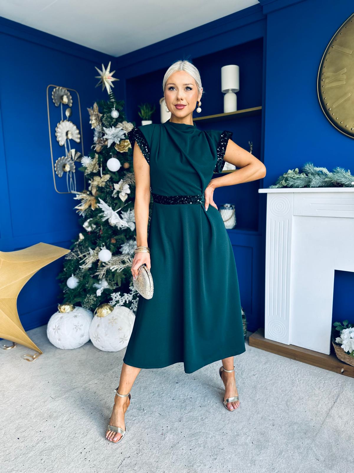 The high neckline, padded shoulder, flowing skirt and sequin trim to sleeve and waistband make this dress a one of a kind