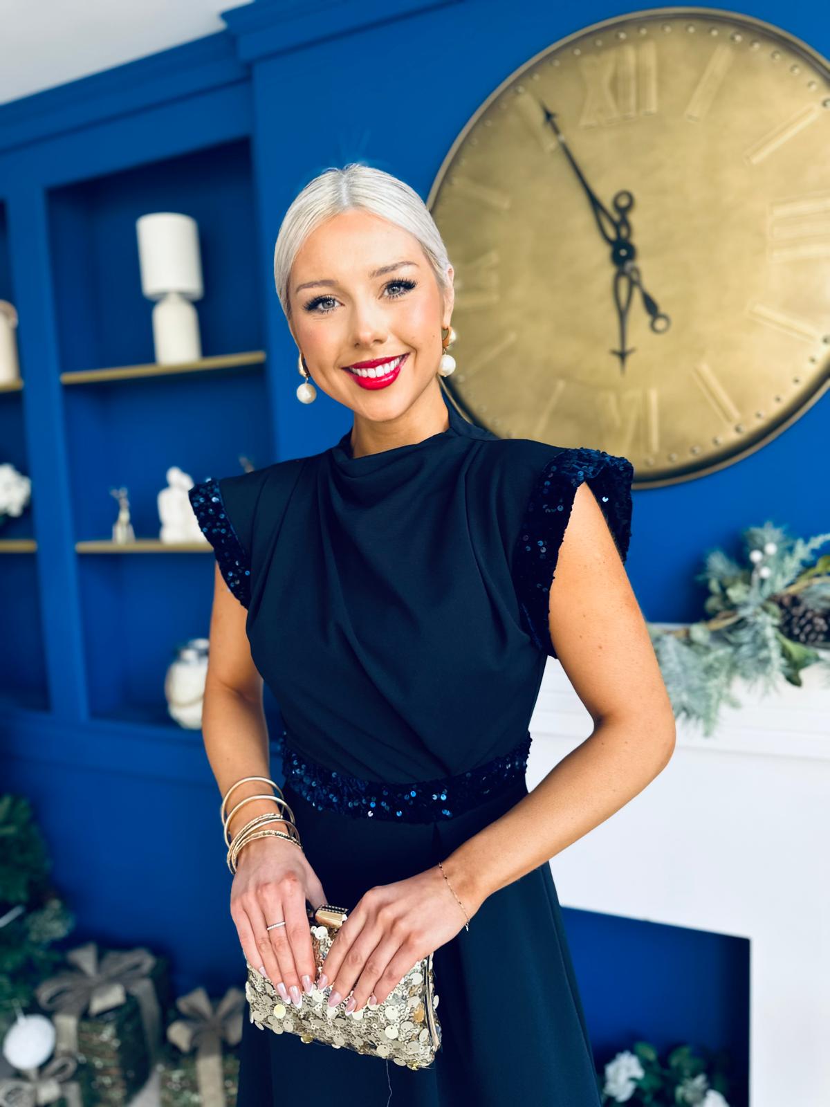 The high neckline, padded shoulder, flowing skirt and sequin trim to sleeve and waistband make this dress a one of a kind