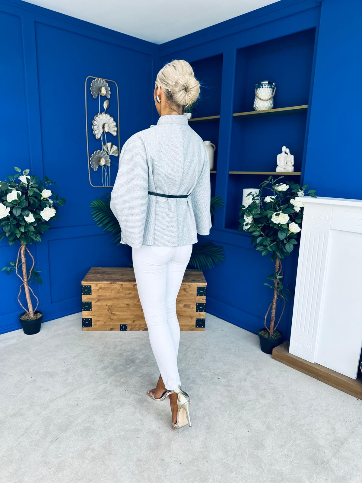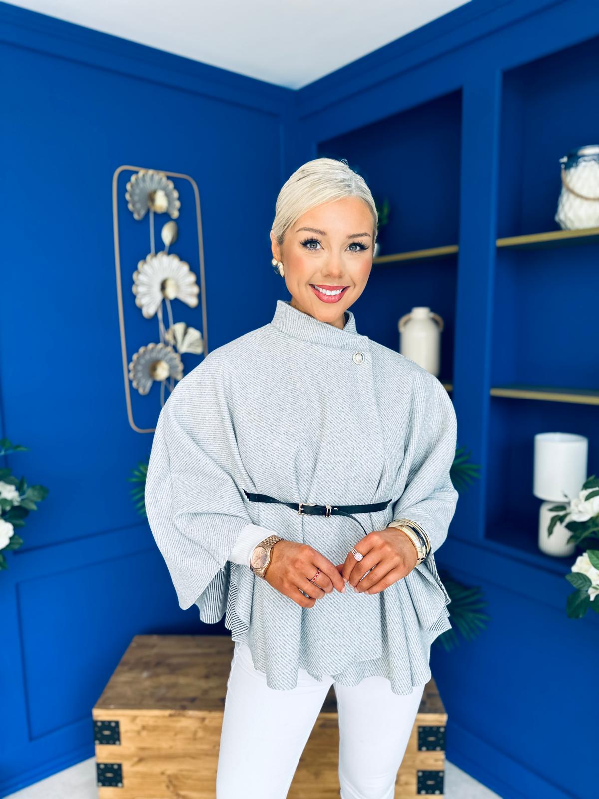 A stylish mix of a coat and cape in luxurious coat fabric with faux leather belt to cinch & embellished button detail for that little something extra.