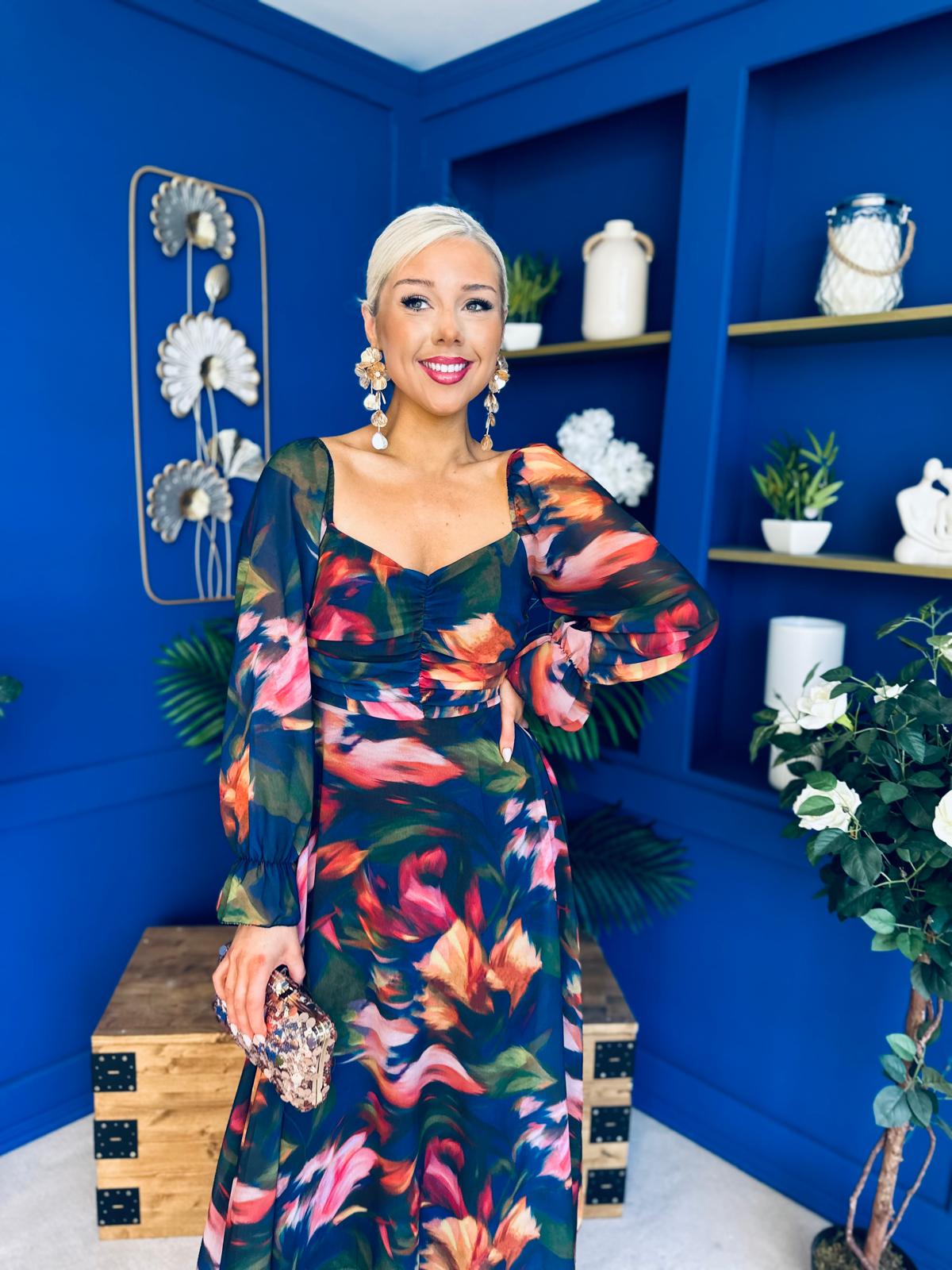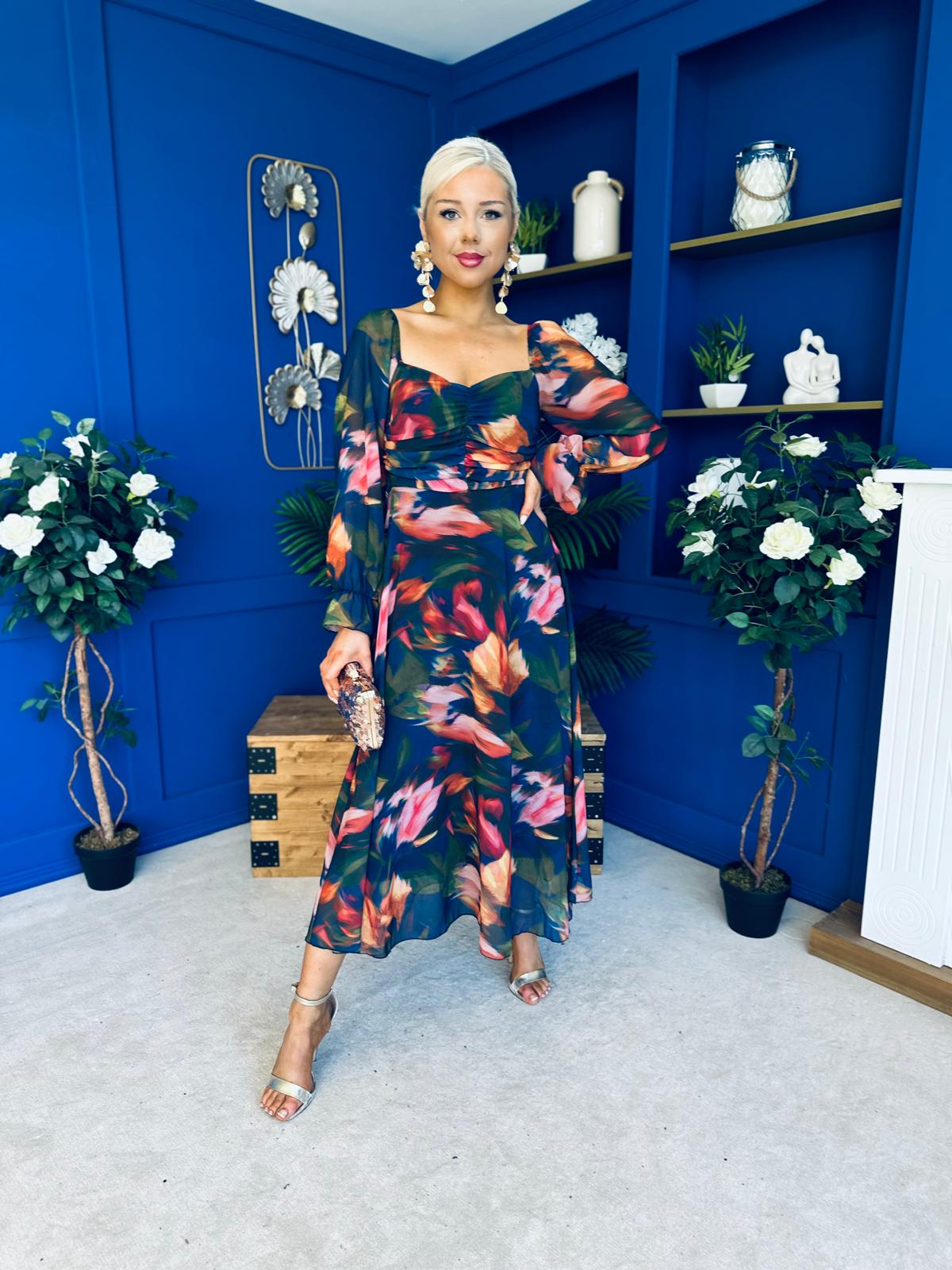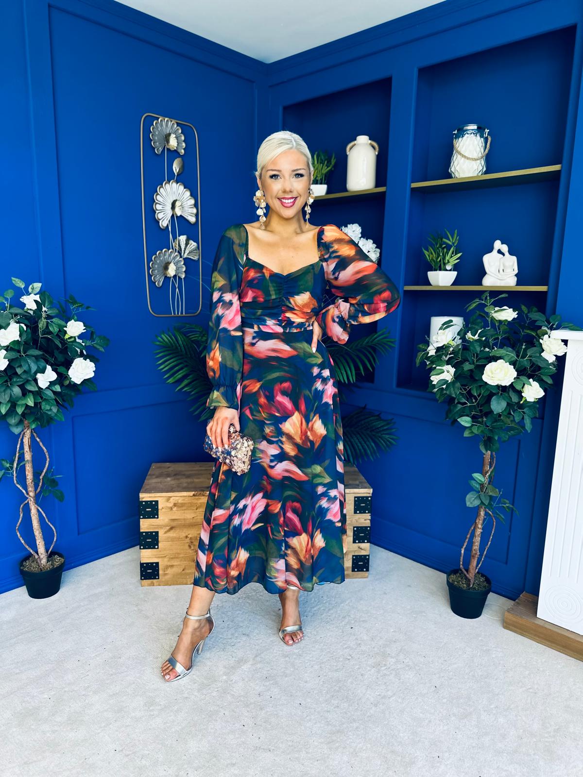 This dress comes in the most amazing lined chiffon, with beautiful sleeve detail, ruched bust, banded midriff, elasticated back to cinch and flowing skirt to flatter