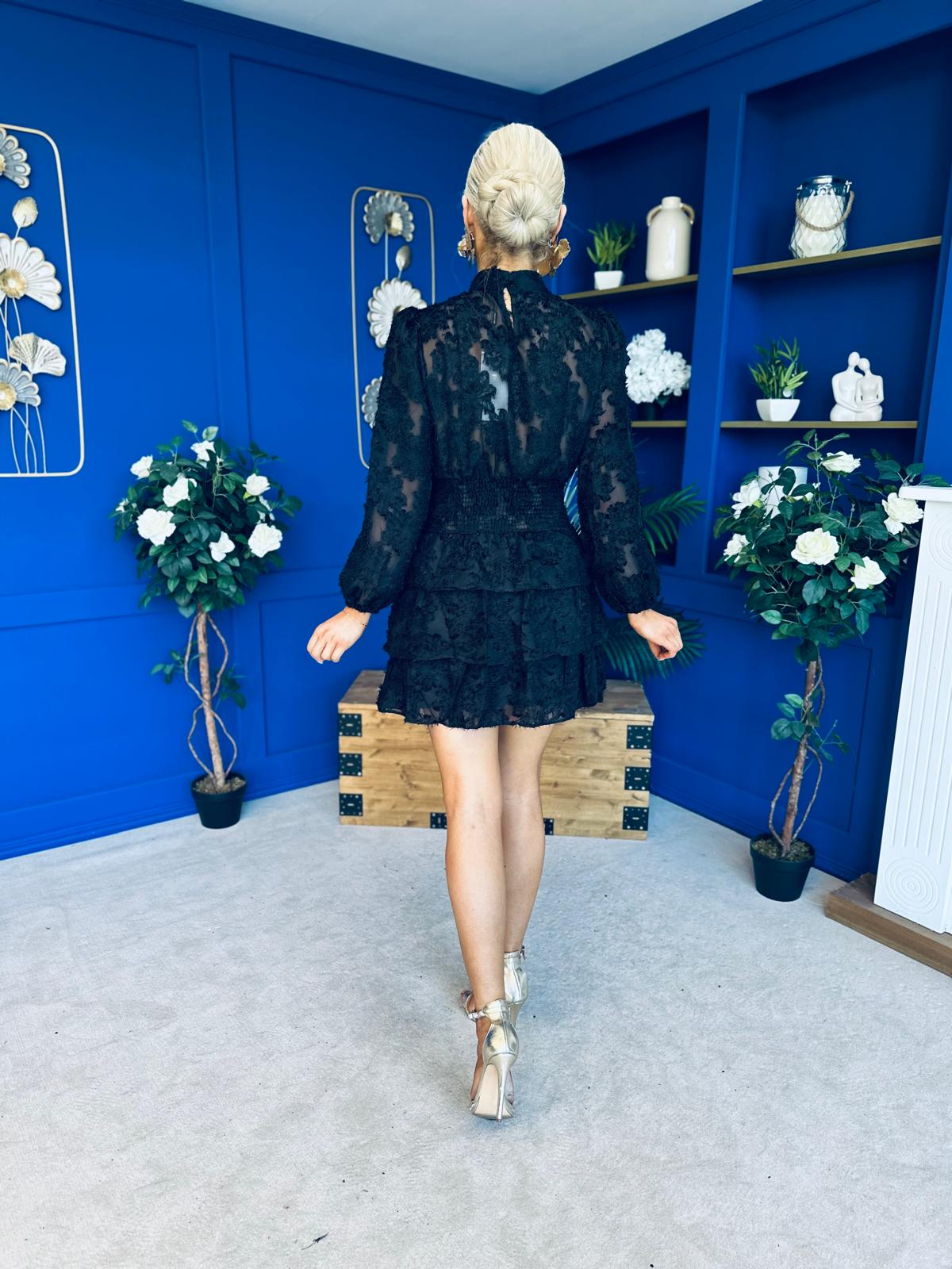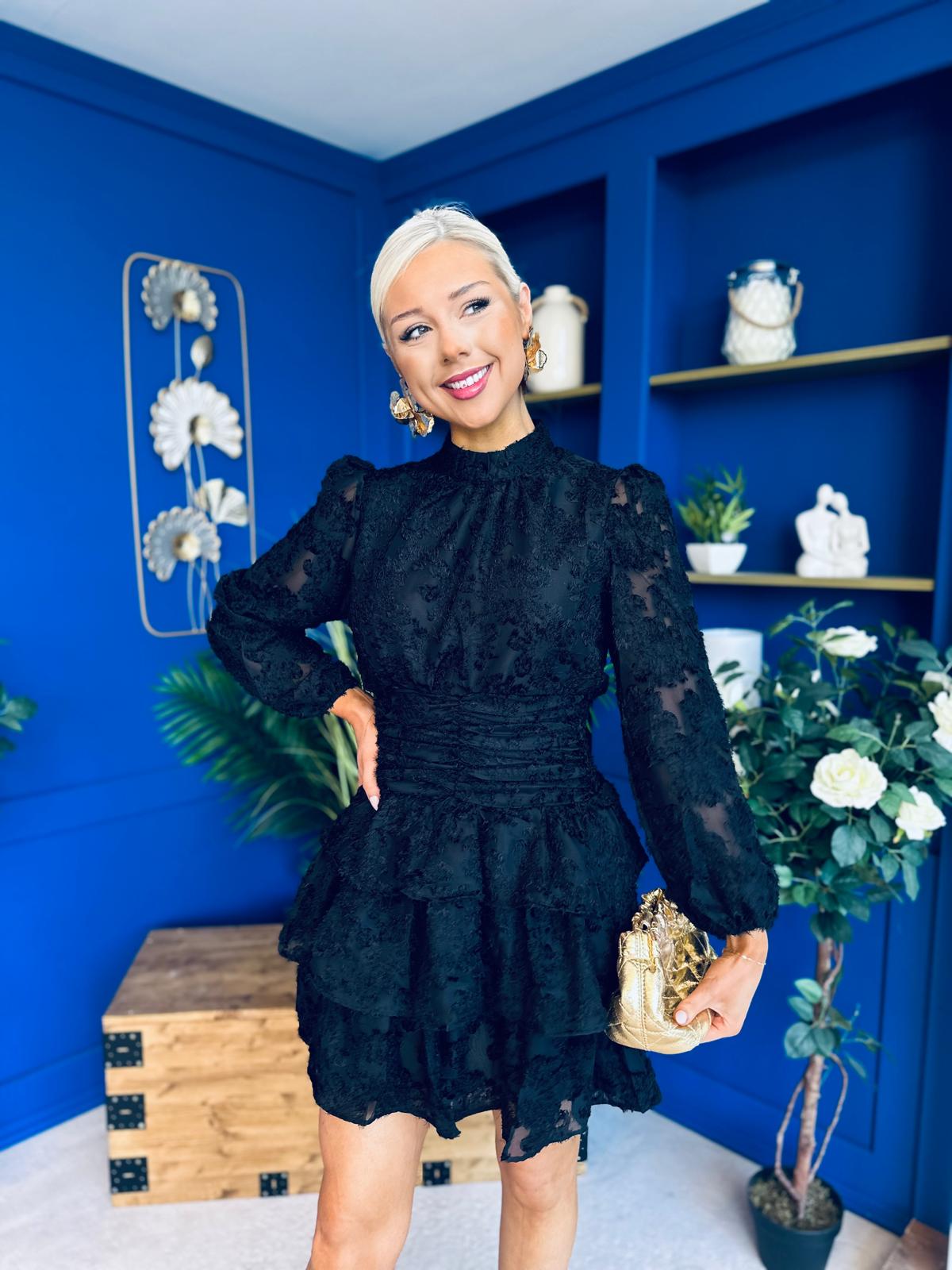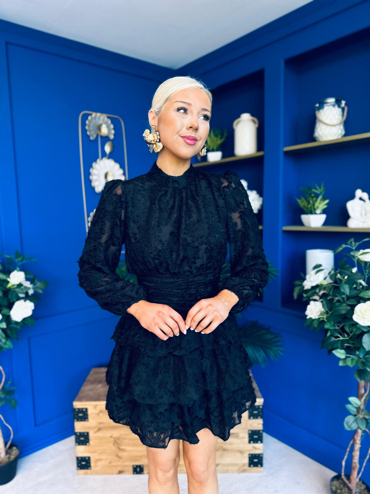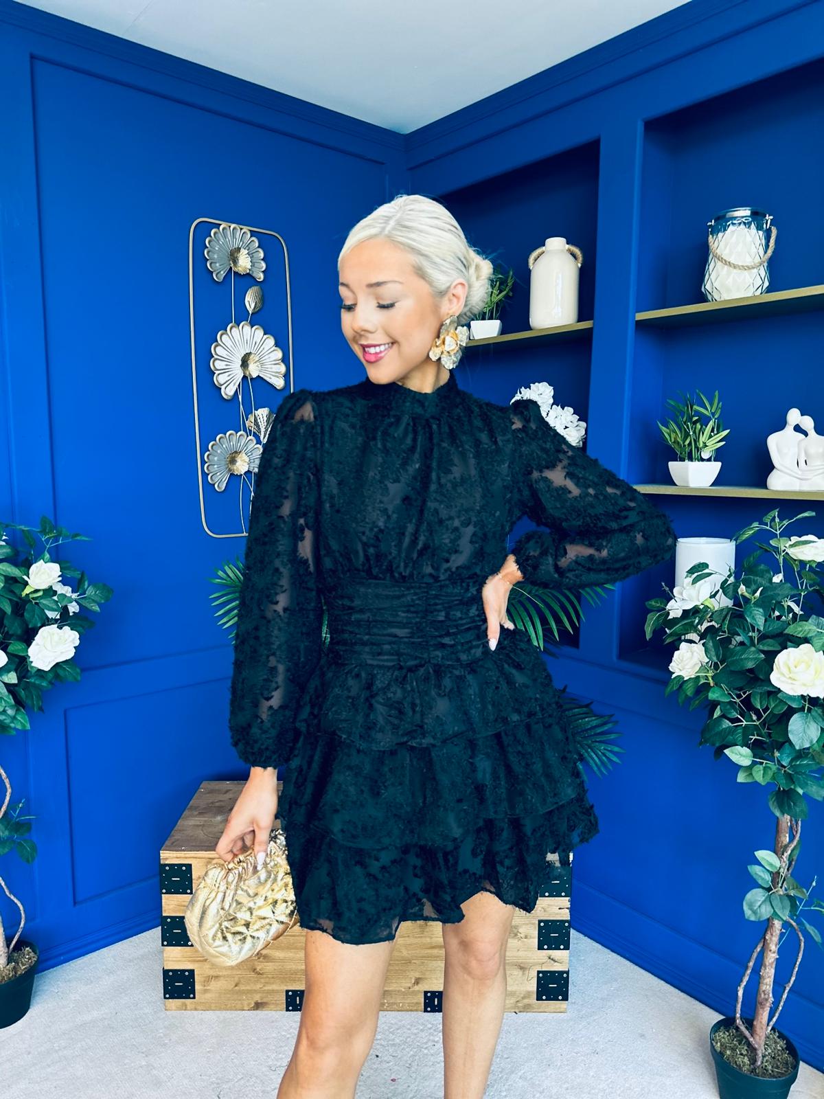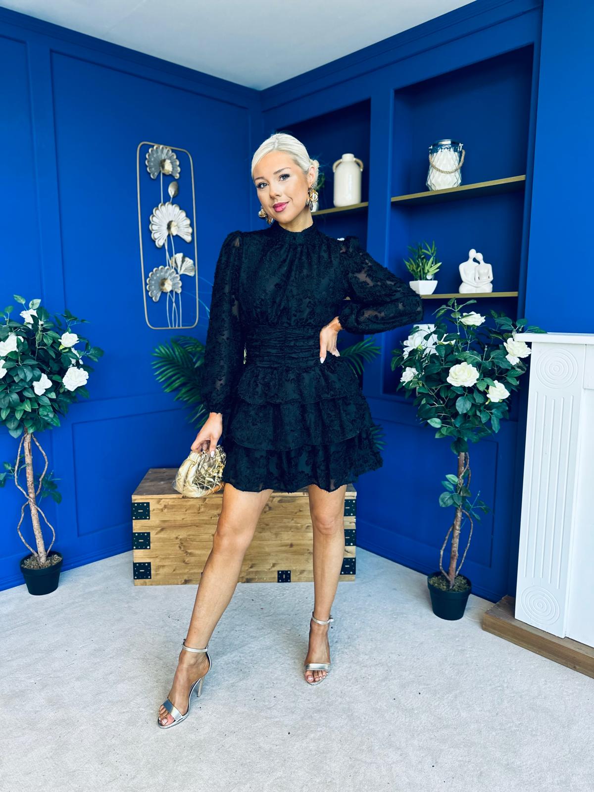 Its dramatic style, high neckline & full sleeve with banded midriff and layered skirt create a stand out look