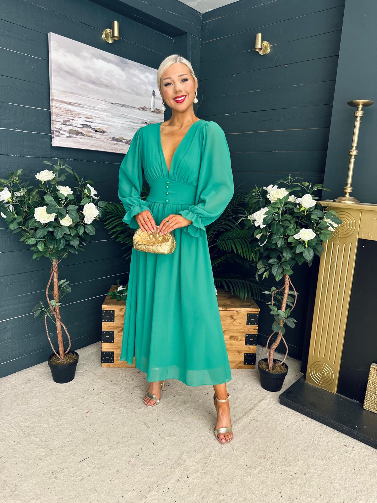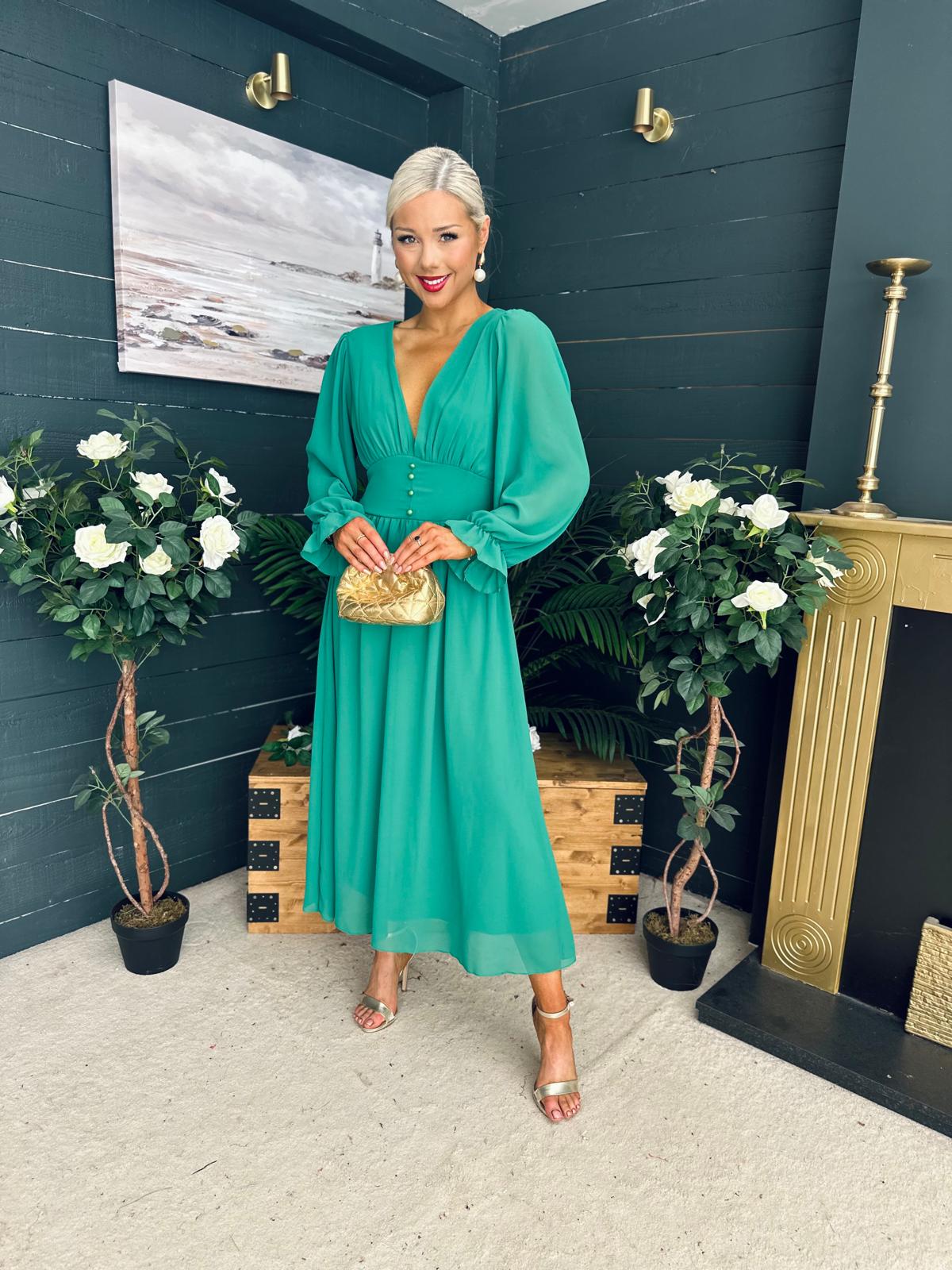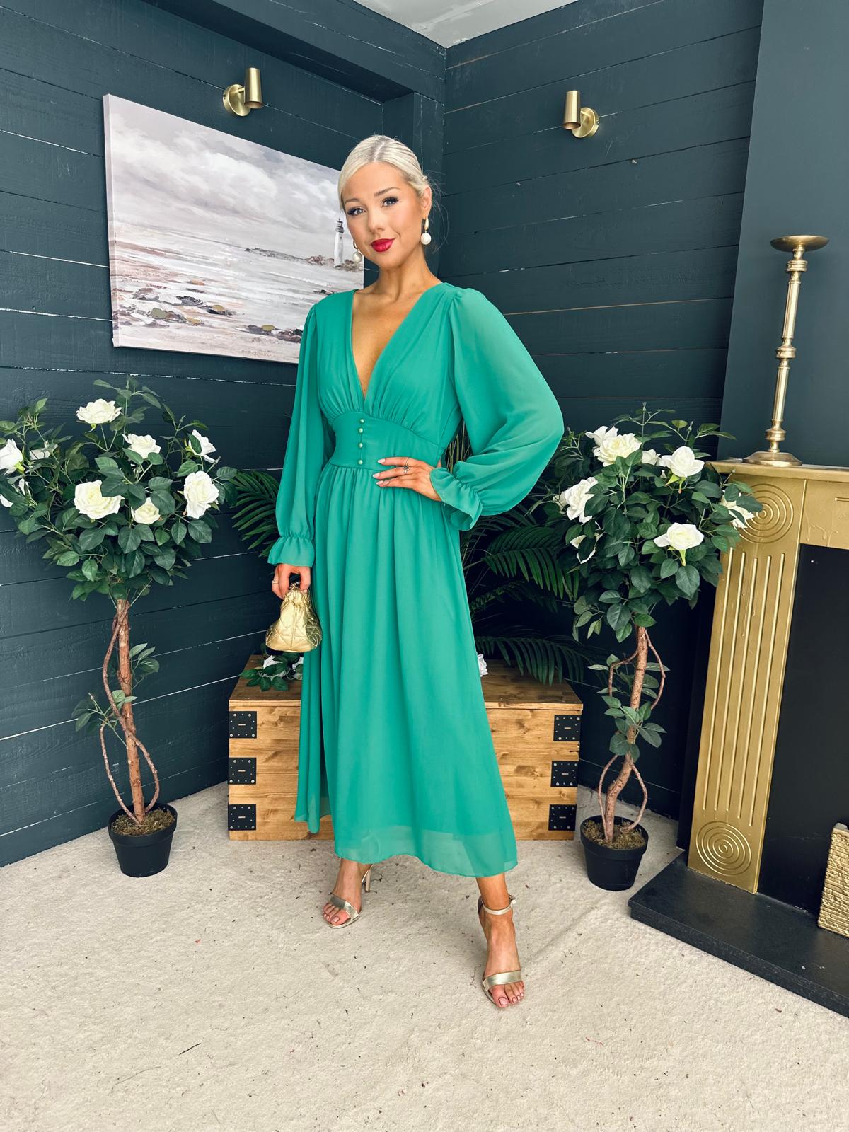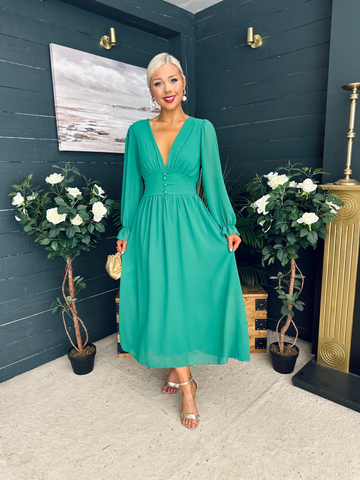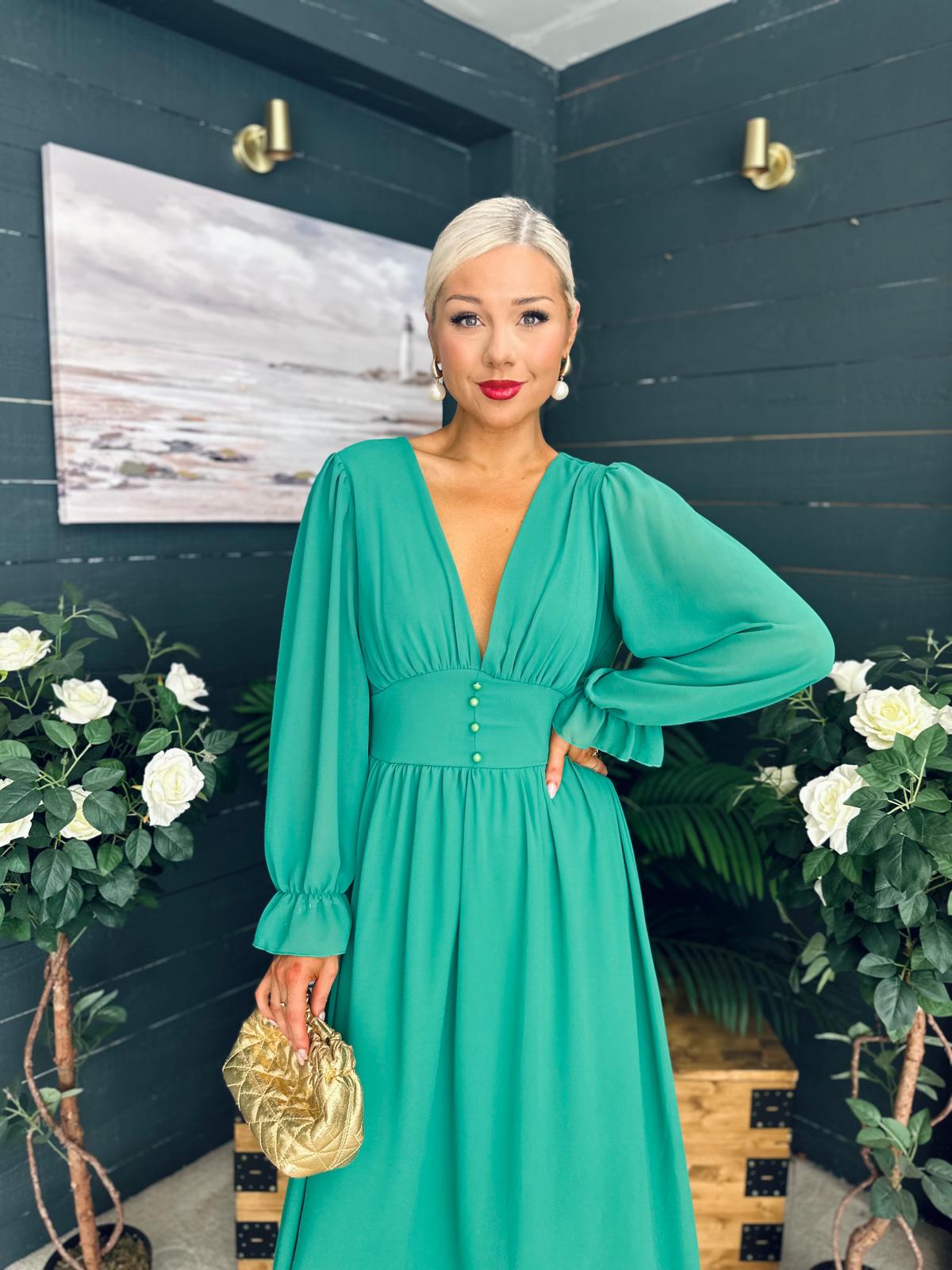 This occasion dress has a beautiful full sleeve, deep V neckline, button detail banded midriff, elasticated and flowing skirt for a statement silhouette and a flattering look, this dress will make you feel and look your best.