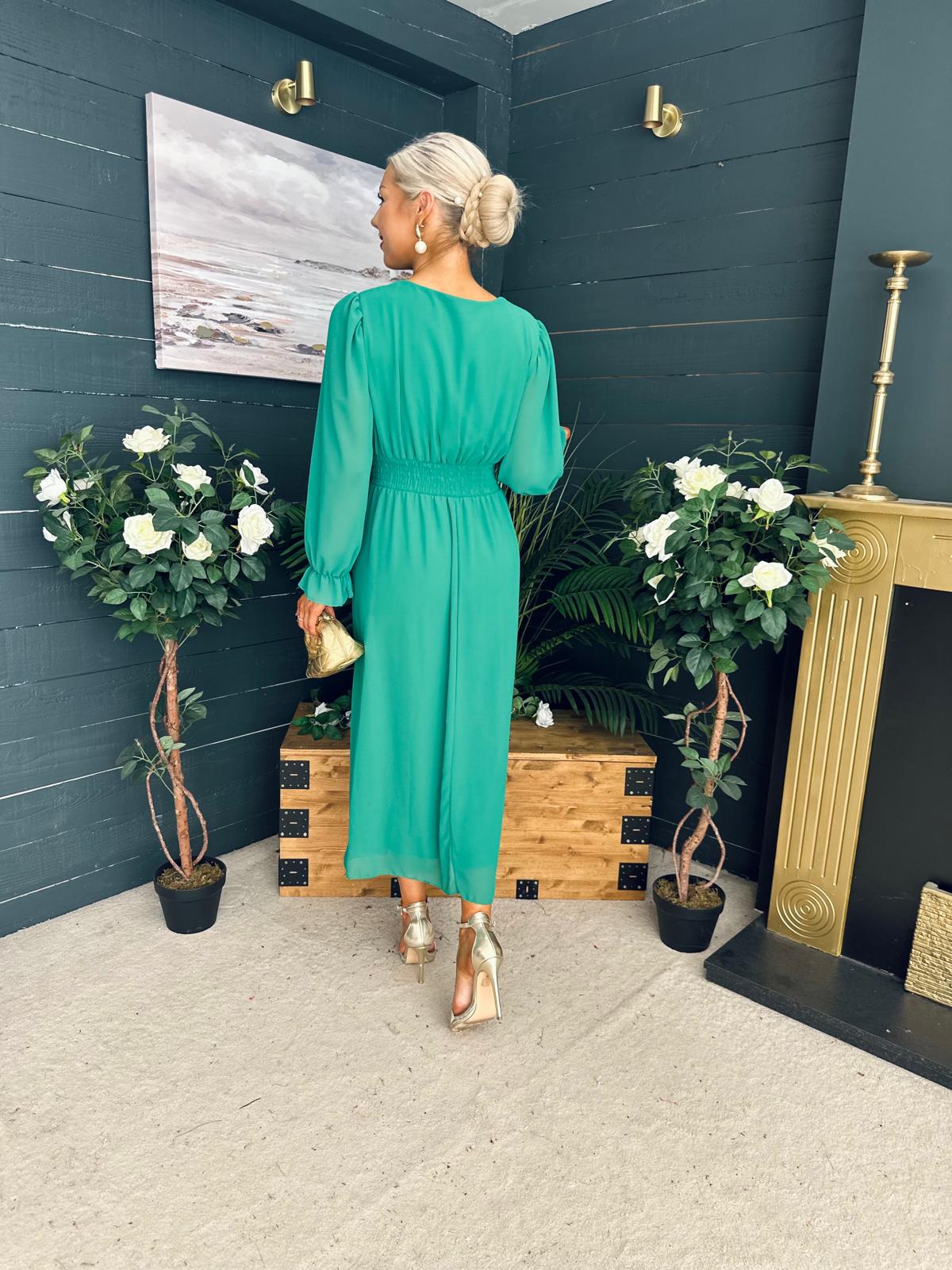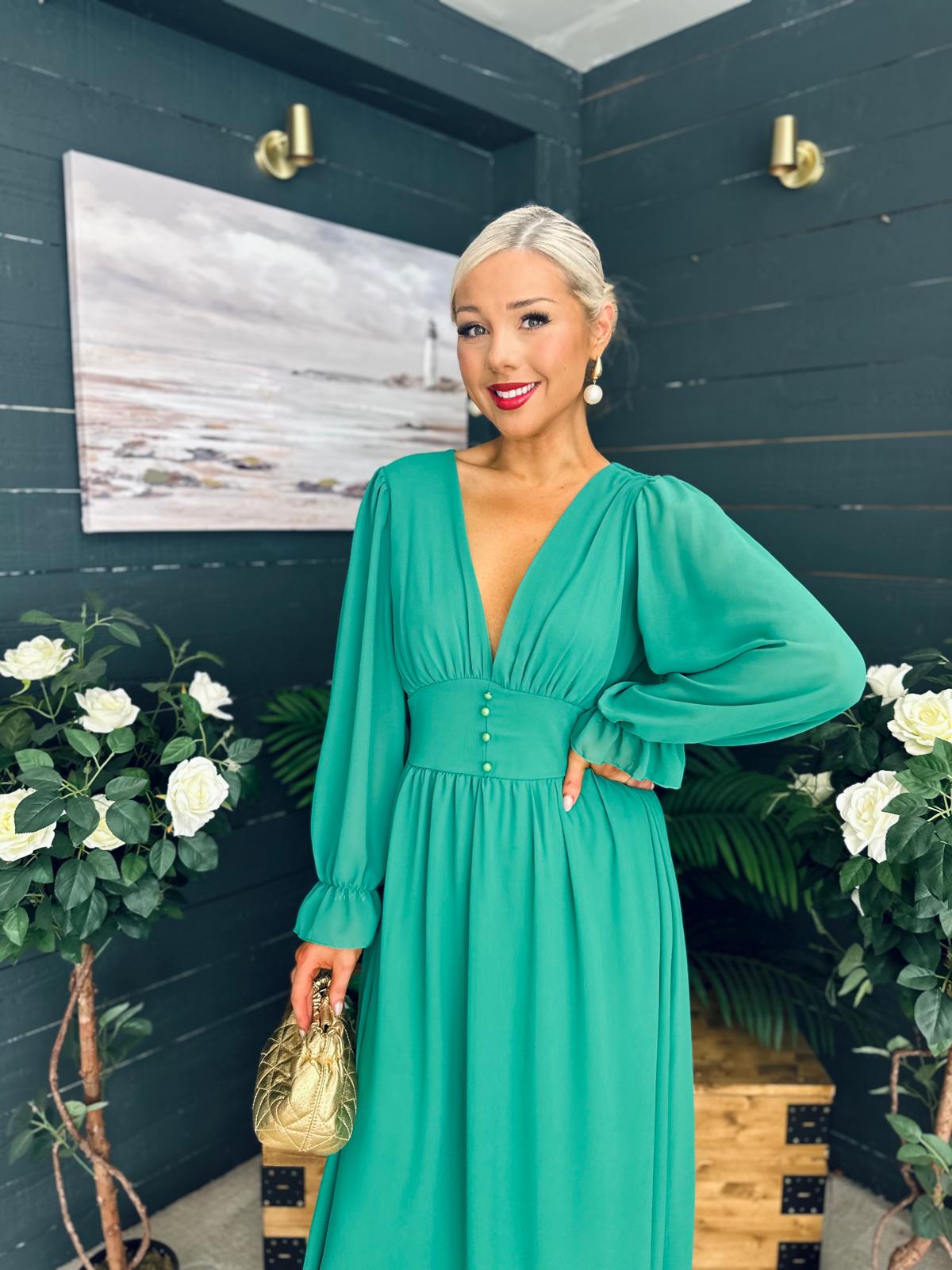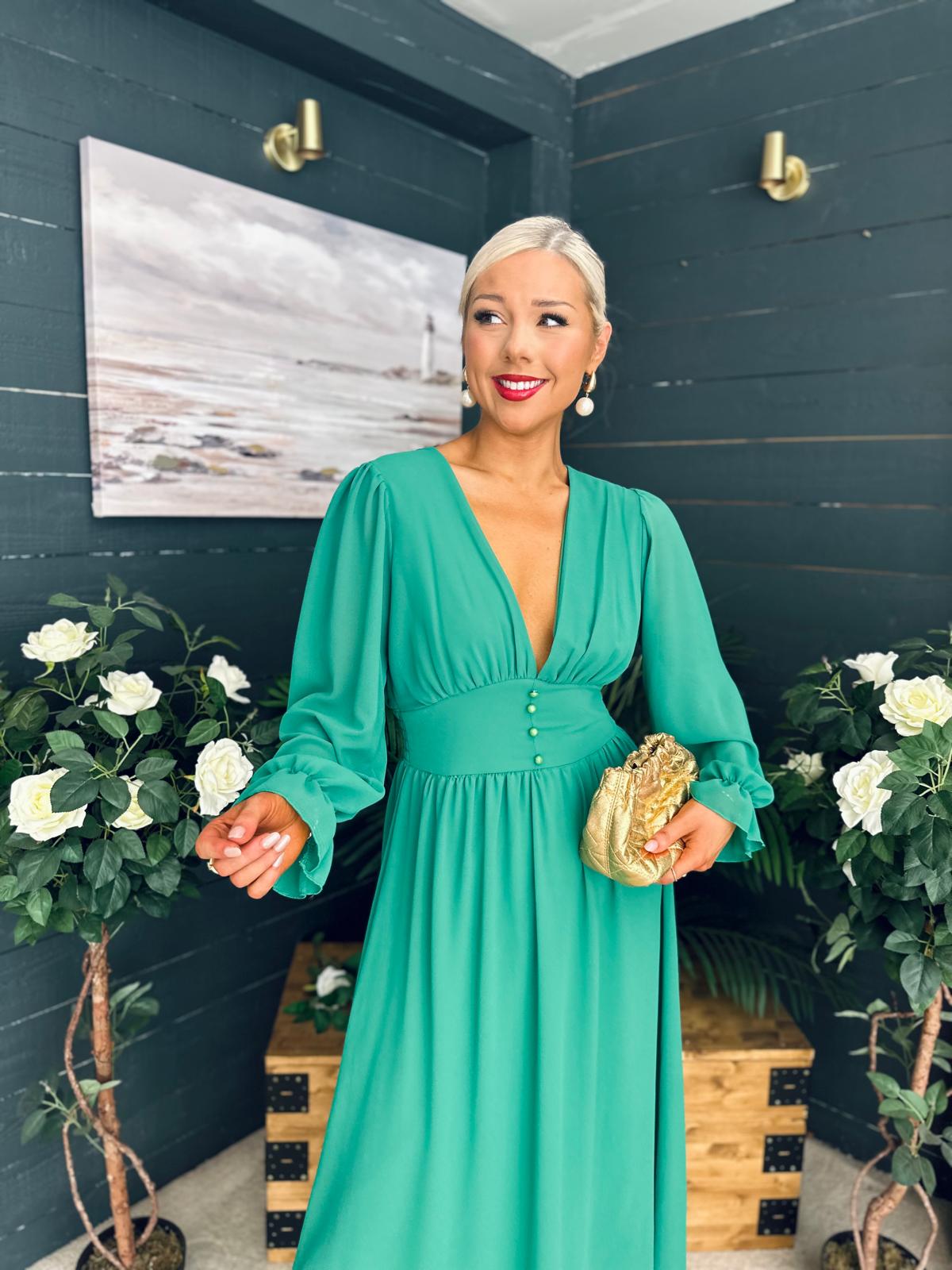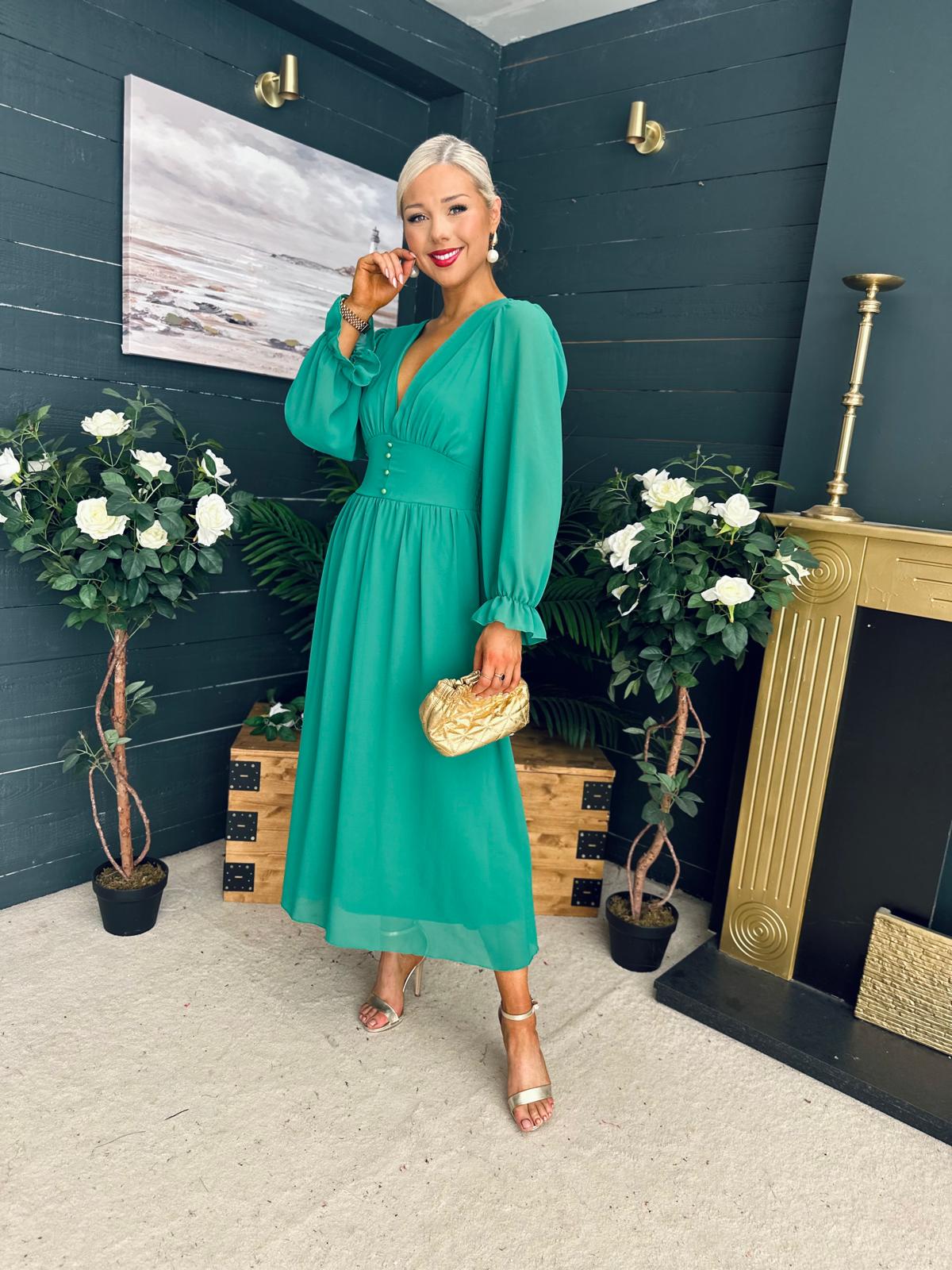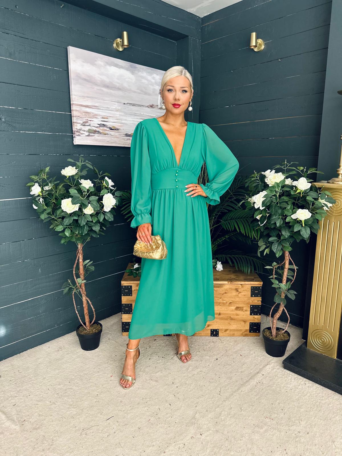 This occasion dress has a beautiful full sleeve, deep V neckline, button detail banded midriff, elasticated and flowing skirt for a statement silhouette and a flattering look, this dress will make you feel and look your best.