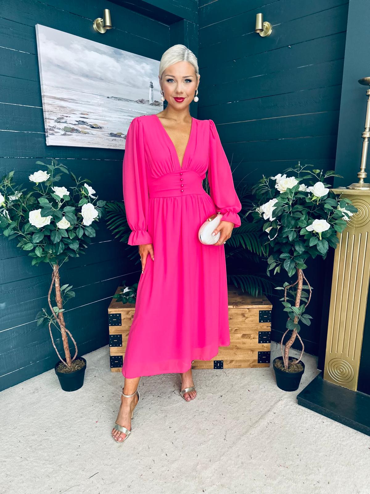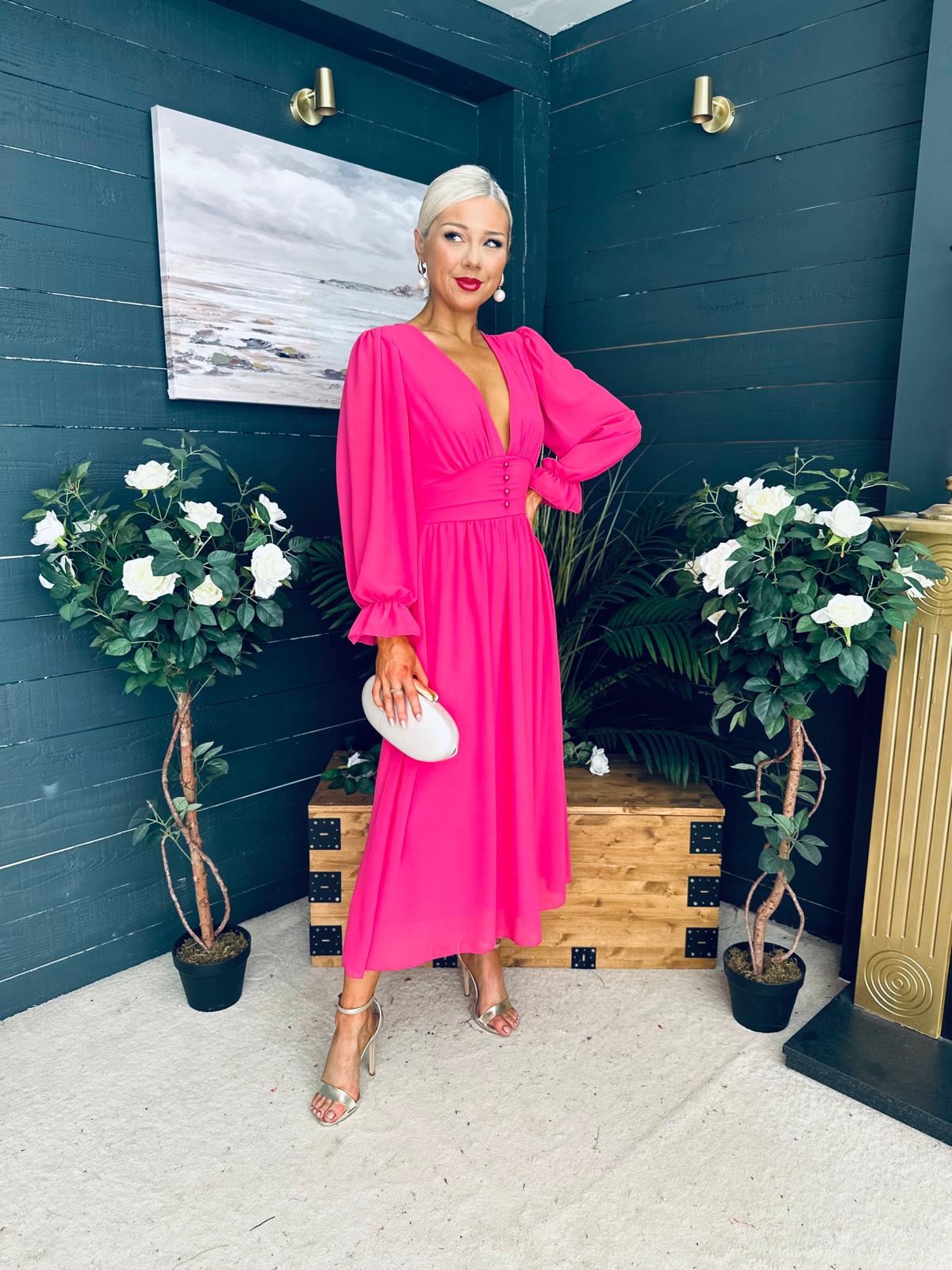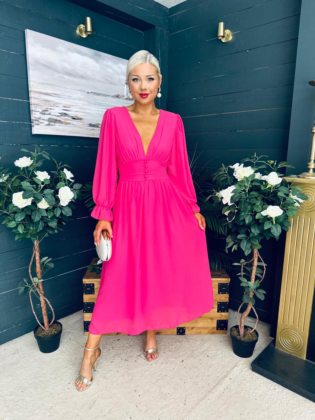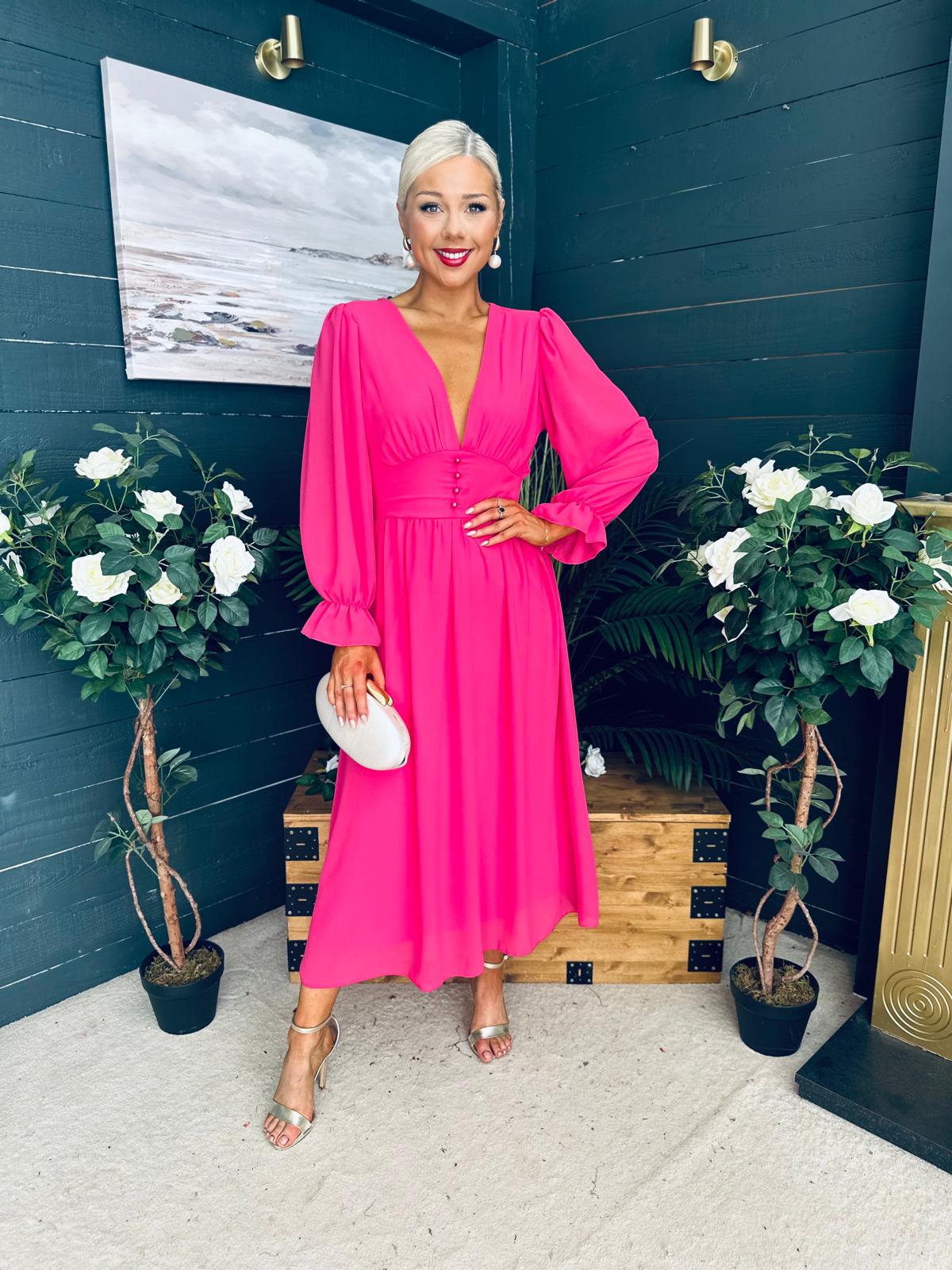 This occasion dress has a beautiful full sleeve, deep V neckline, button detail banded midriff, elasticated and flowing skirt for a statement silhouette and a flattering look, this dress will make you feel and look your best.