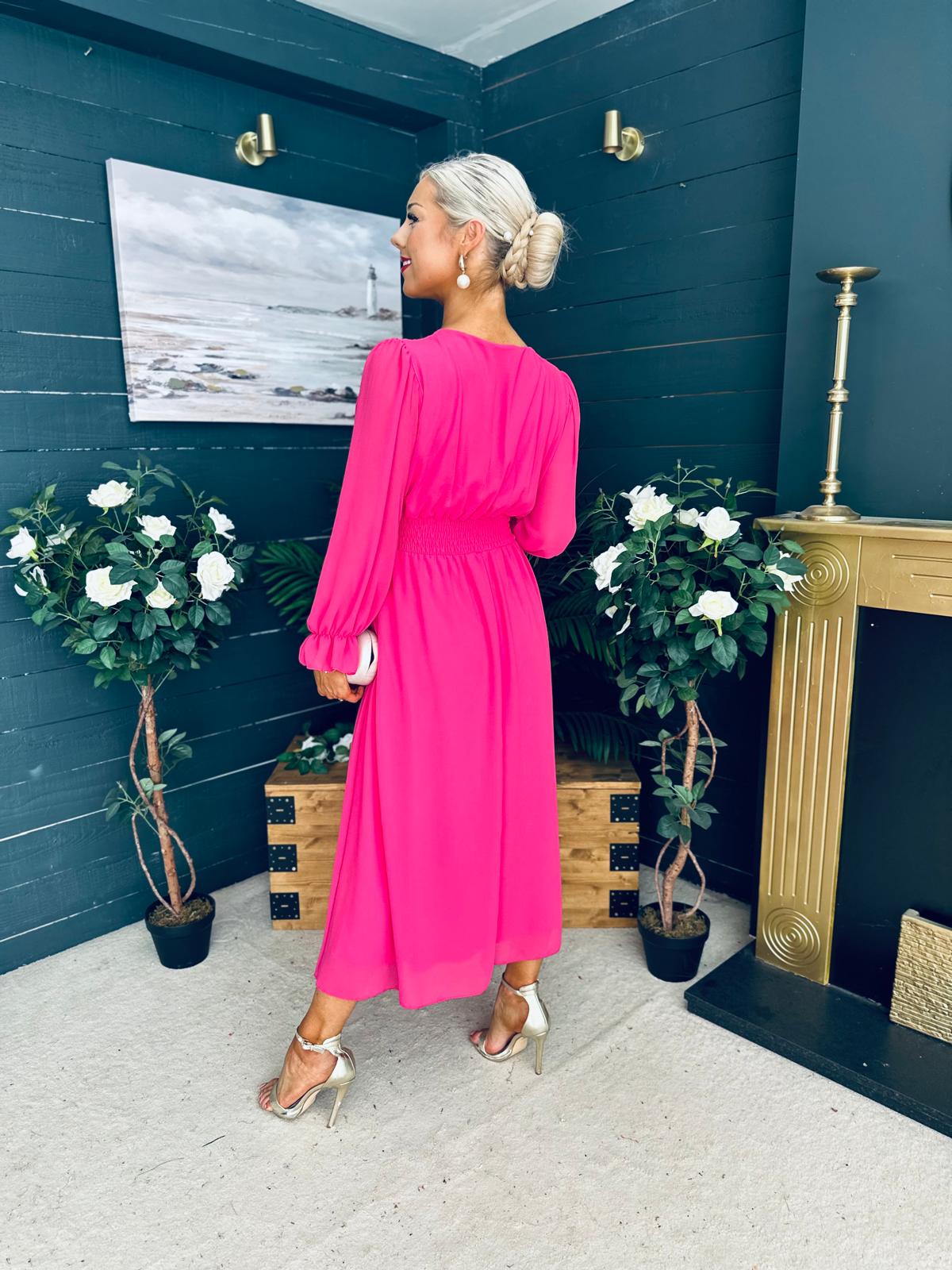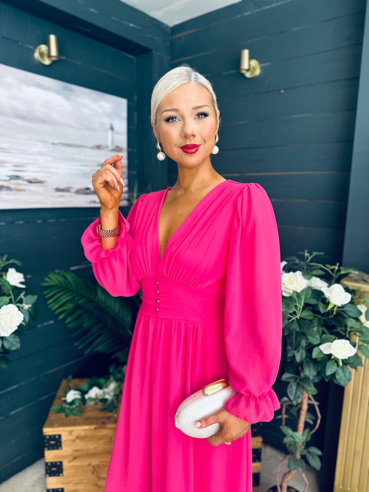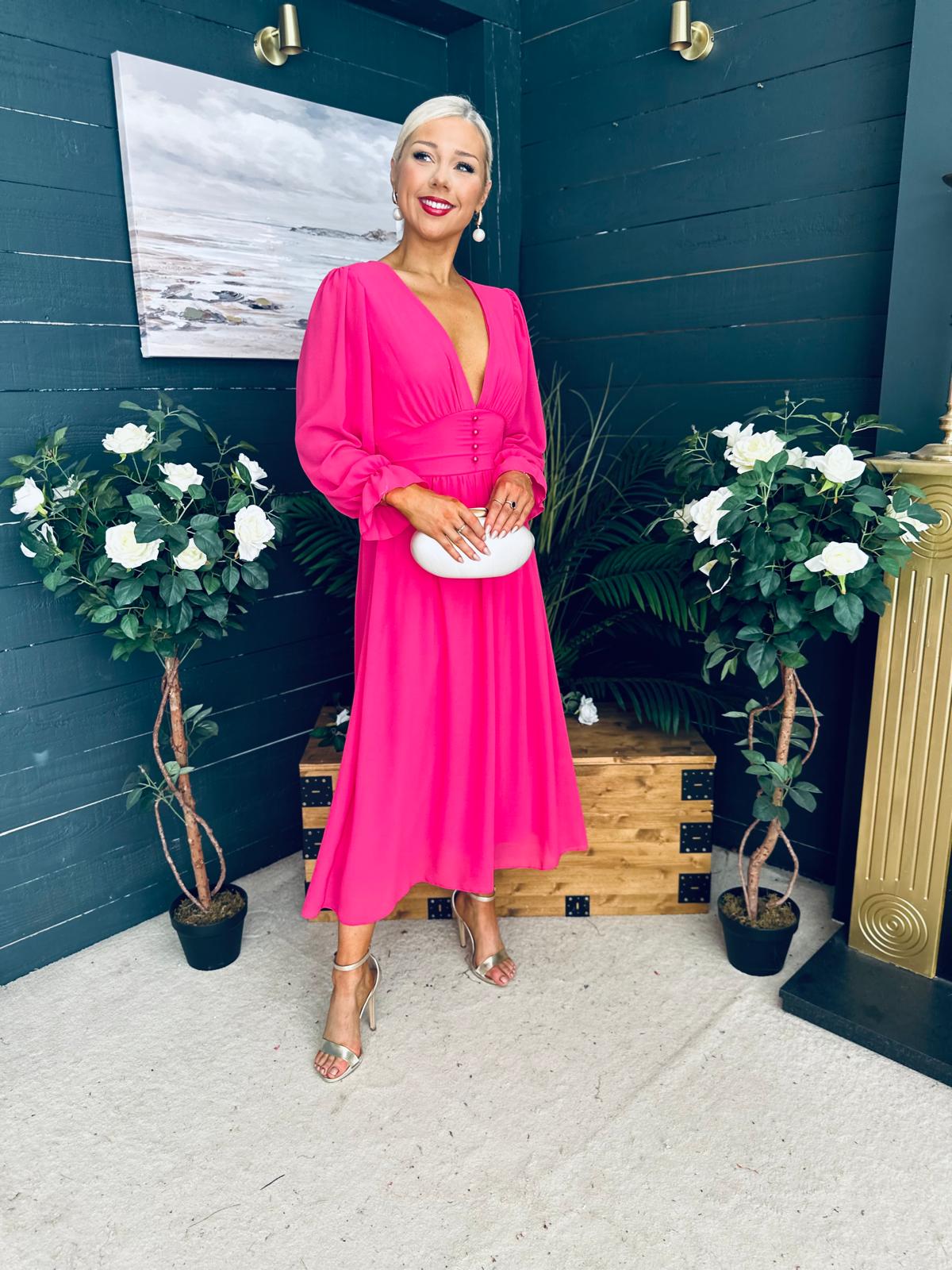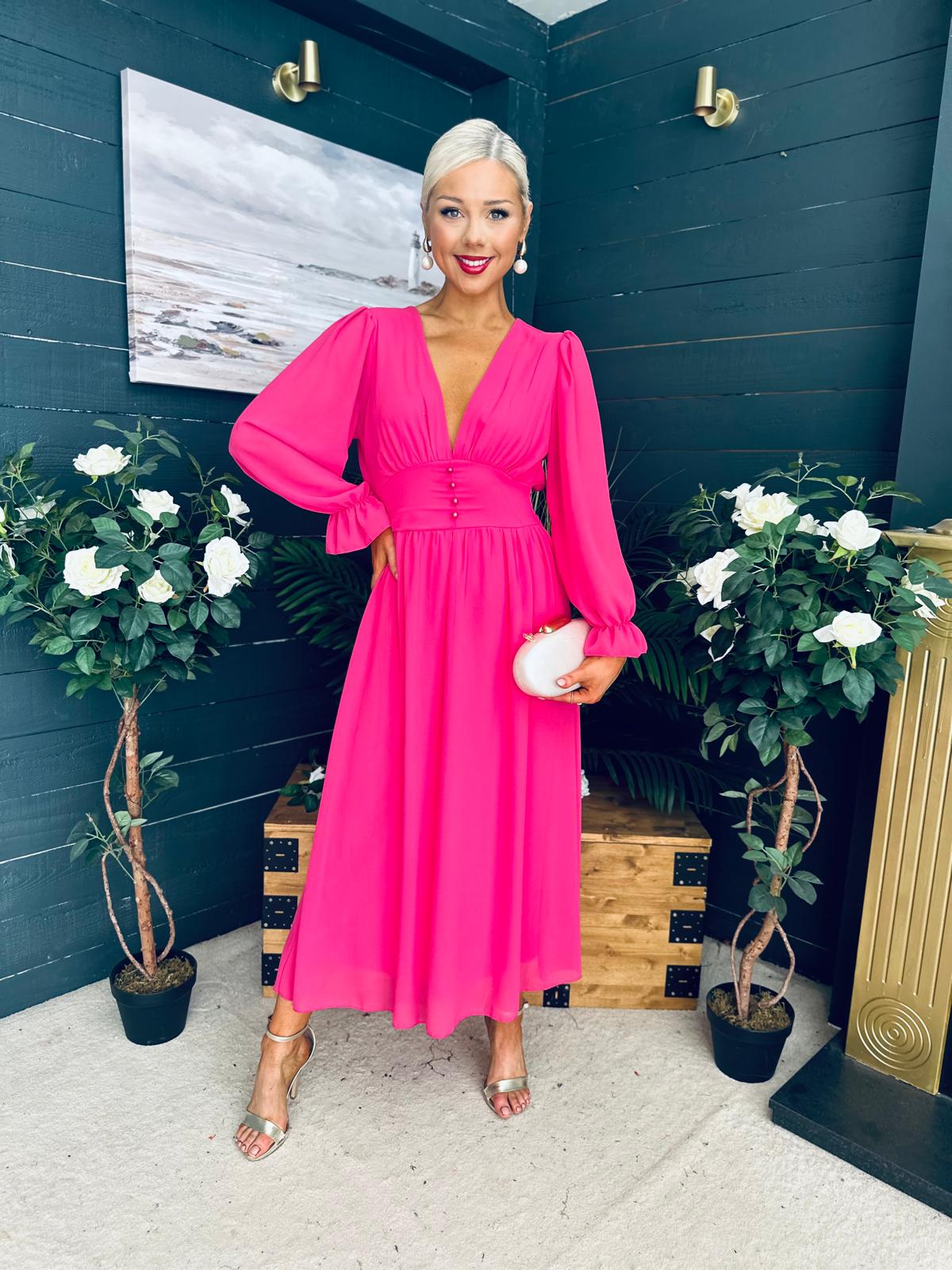 This occasion dress has a beautiful full sleeve, deep V neckline, button detail banded midriff, elasticated and flowing skirt for a statement silhouette and a flattering look, this dress will make you feel and look your best.