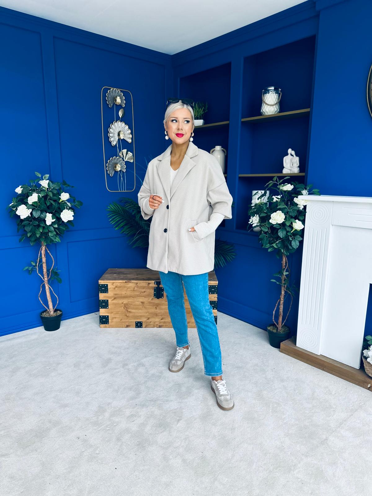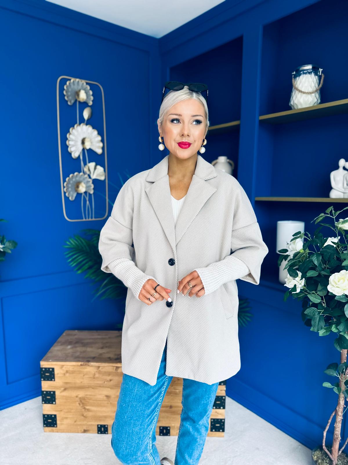 This coat features a gorgeous lapel & a stand out half sleeve in main body material with matching knit sleeve extending to cuff.