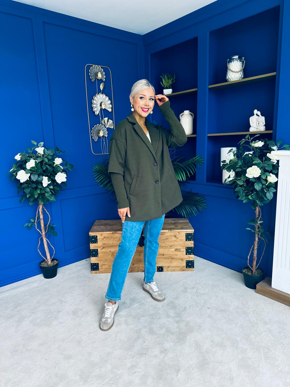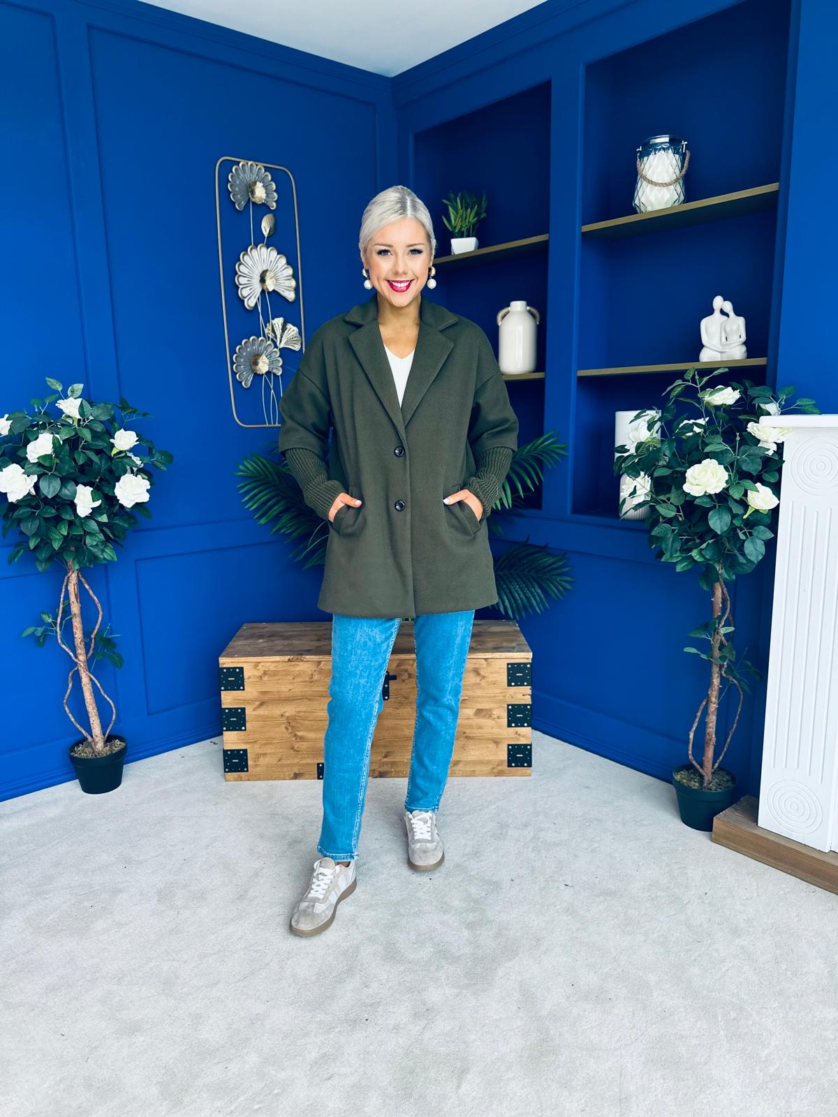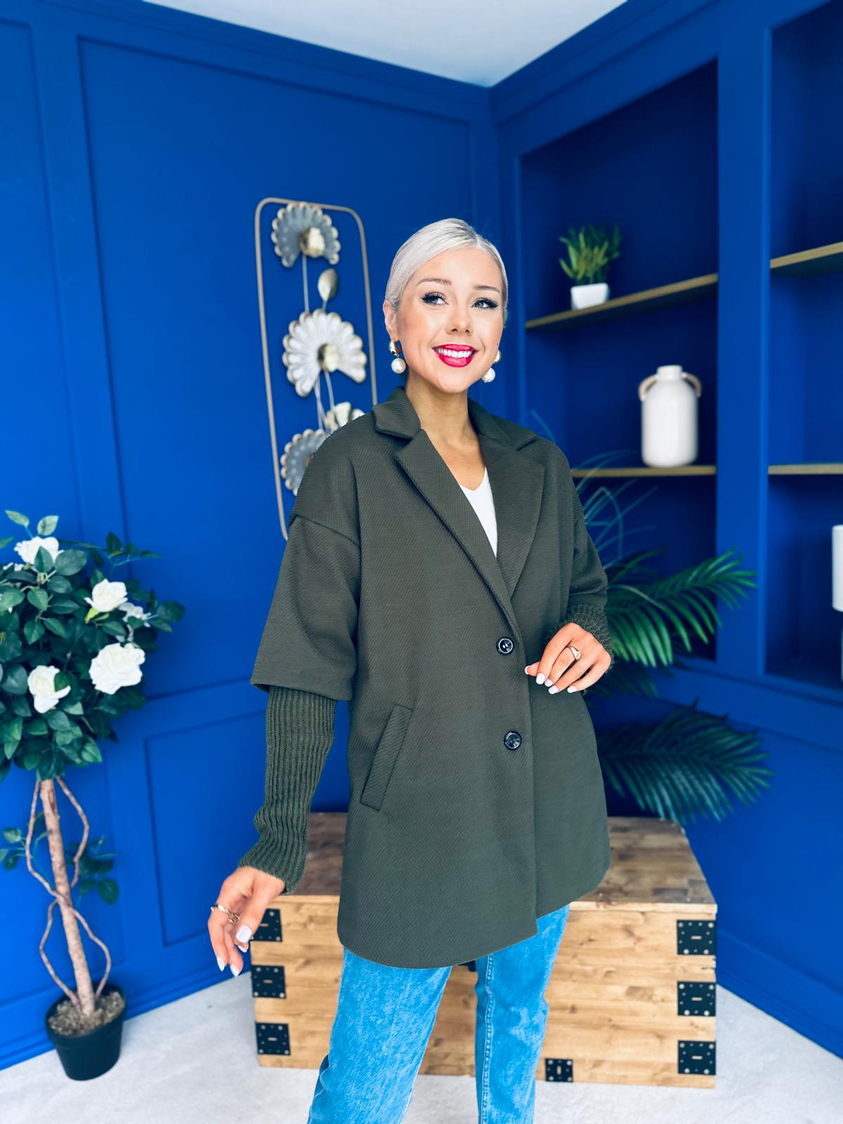 This coat features a gorgeous lapel & a stand out half sleeve in main body material with matching knit sleeve entending to cuff.