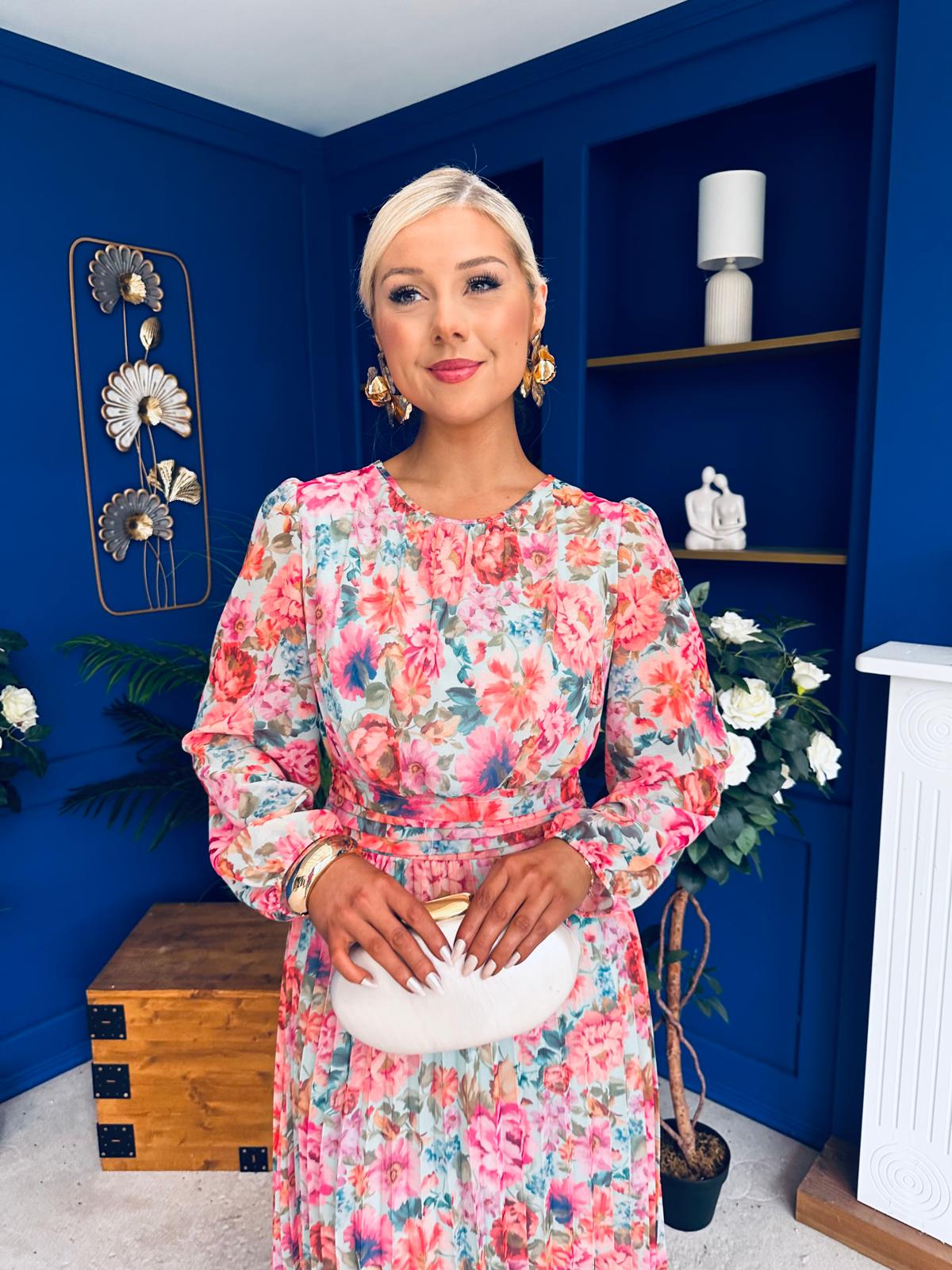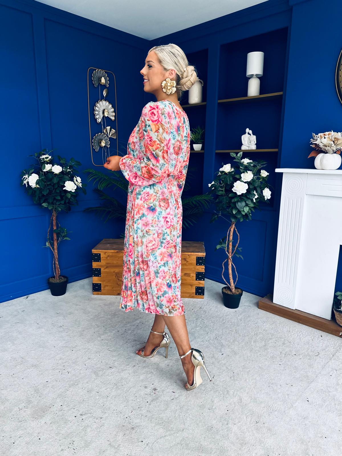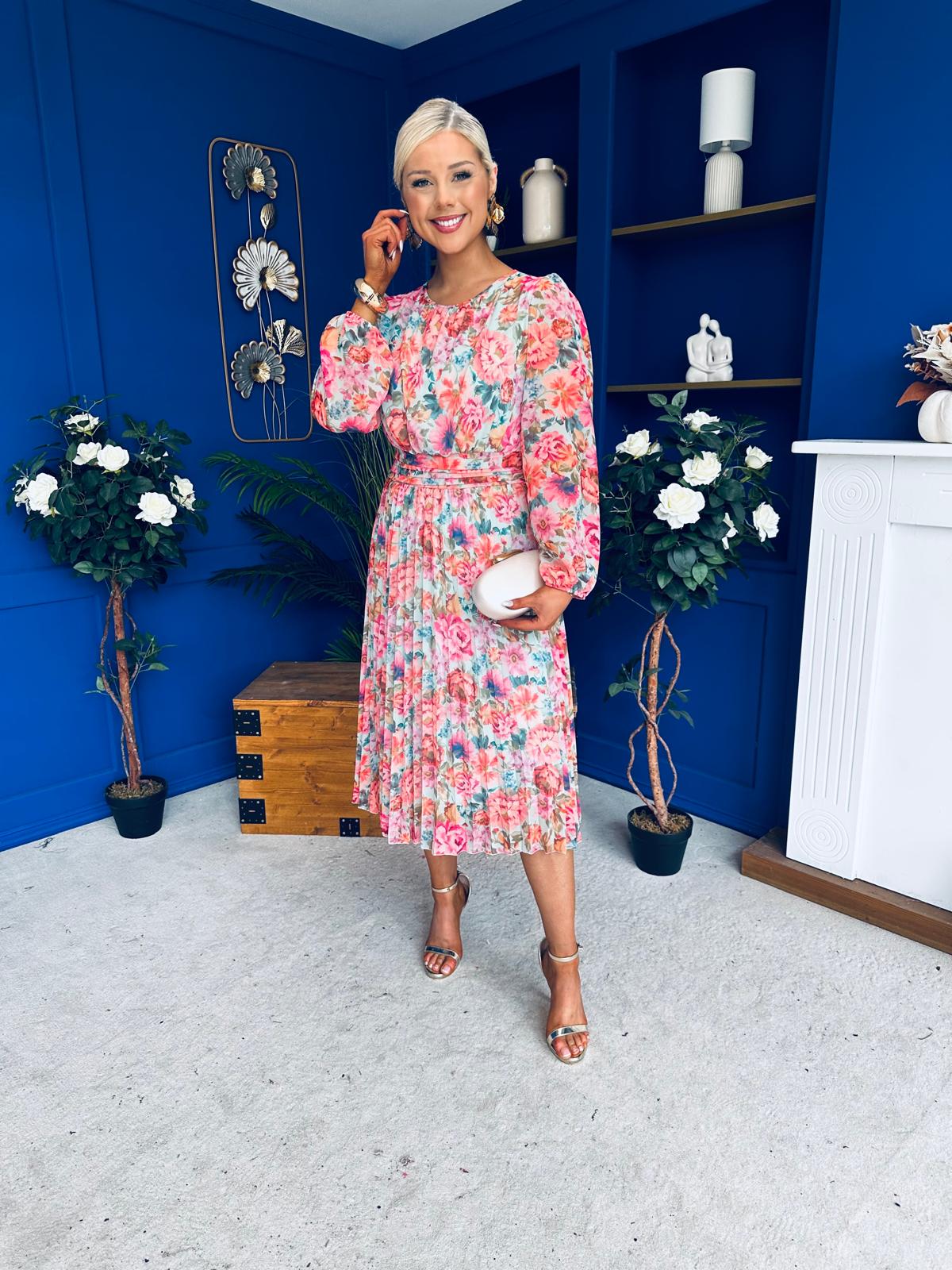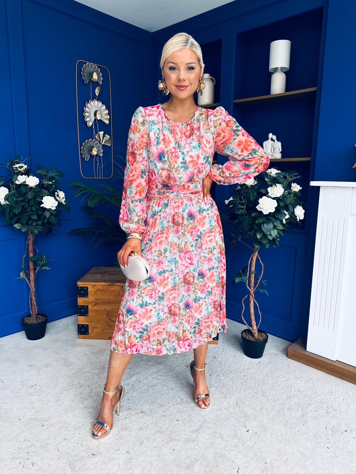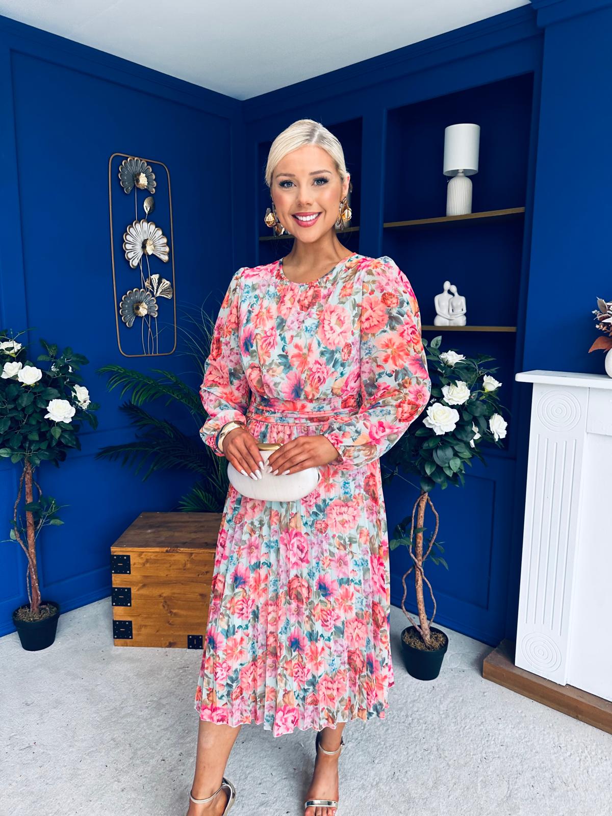 With a fabulous soft round neckline, gathered bust, beautiful full sleeve, banded waist, elasticated back to cinch with comfort and flowing skirt to flatter