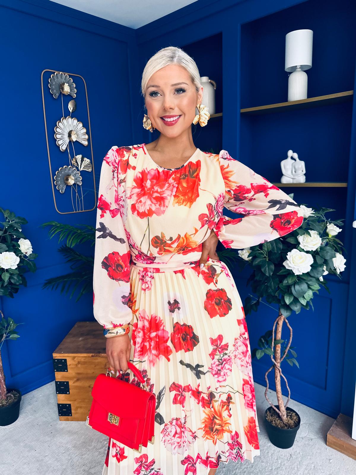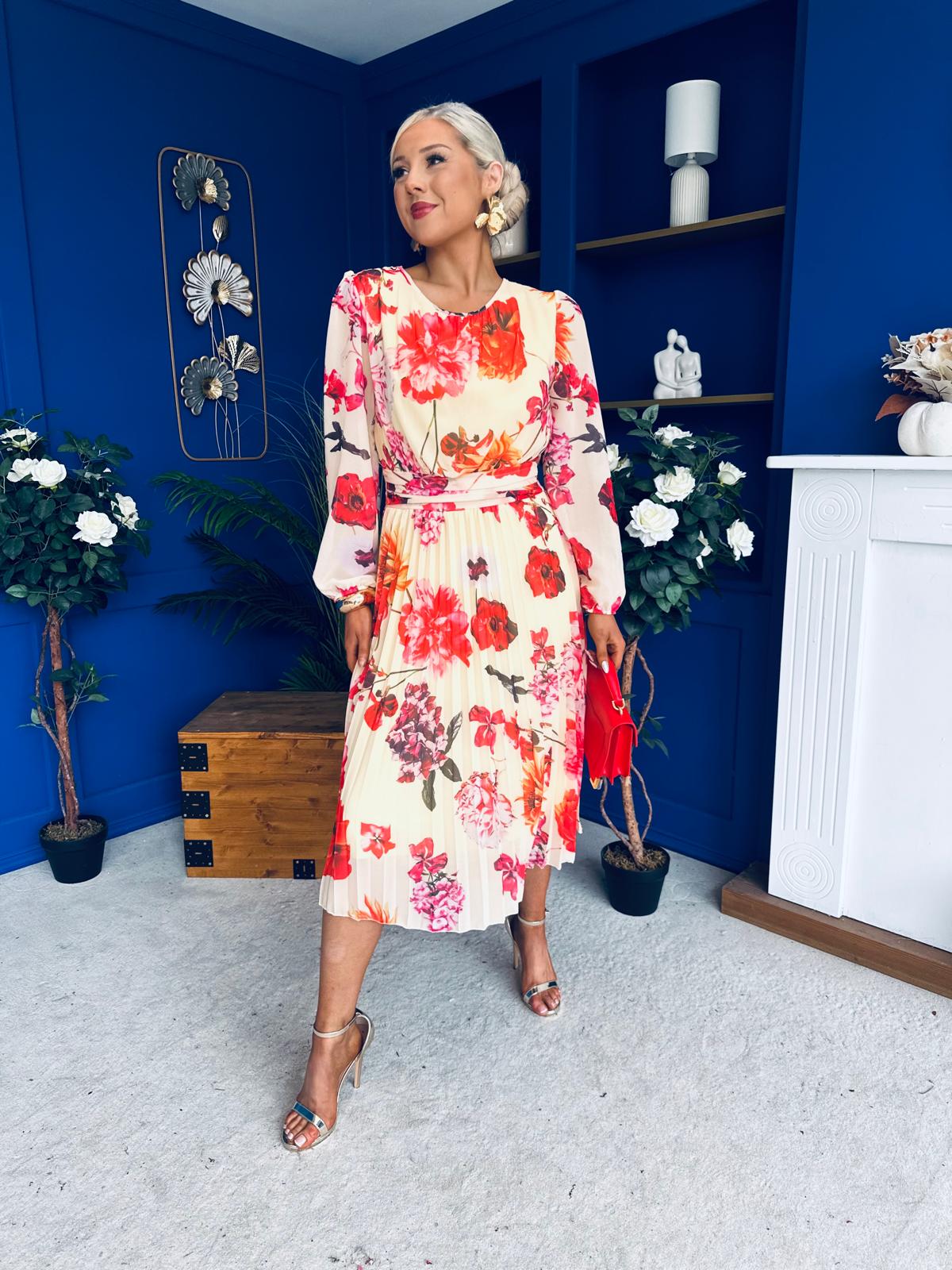 With a fabulous soft round neckline, gathered bust, beautiful full sleeve, banded waist, elasticated back to cinch with comfort and flowing skirt to flatter