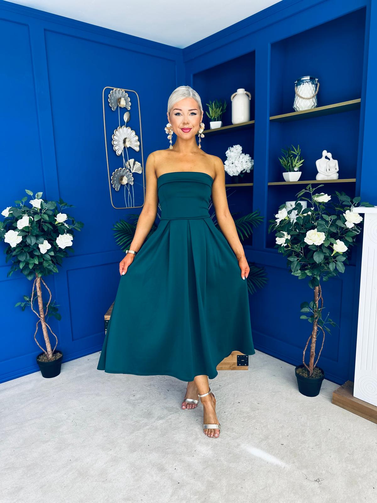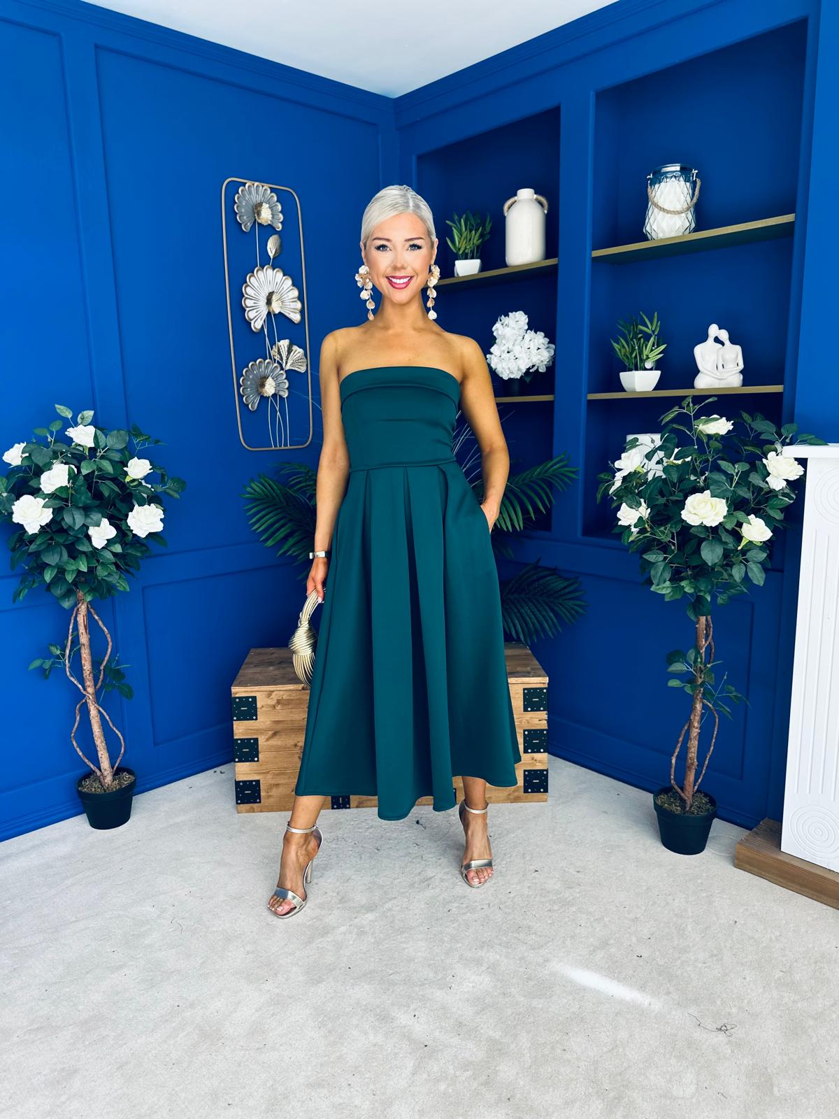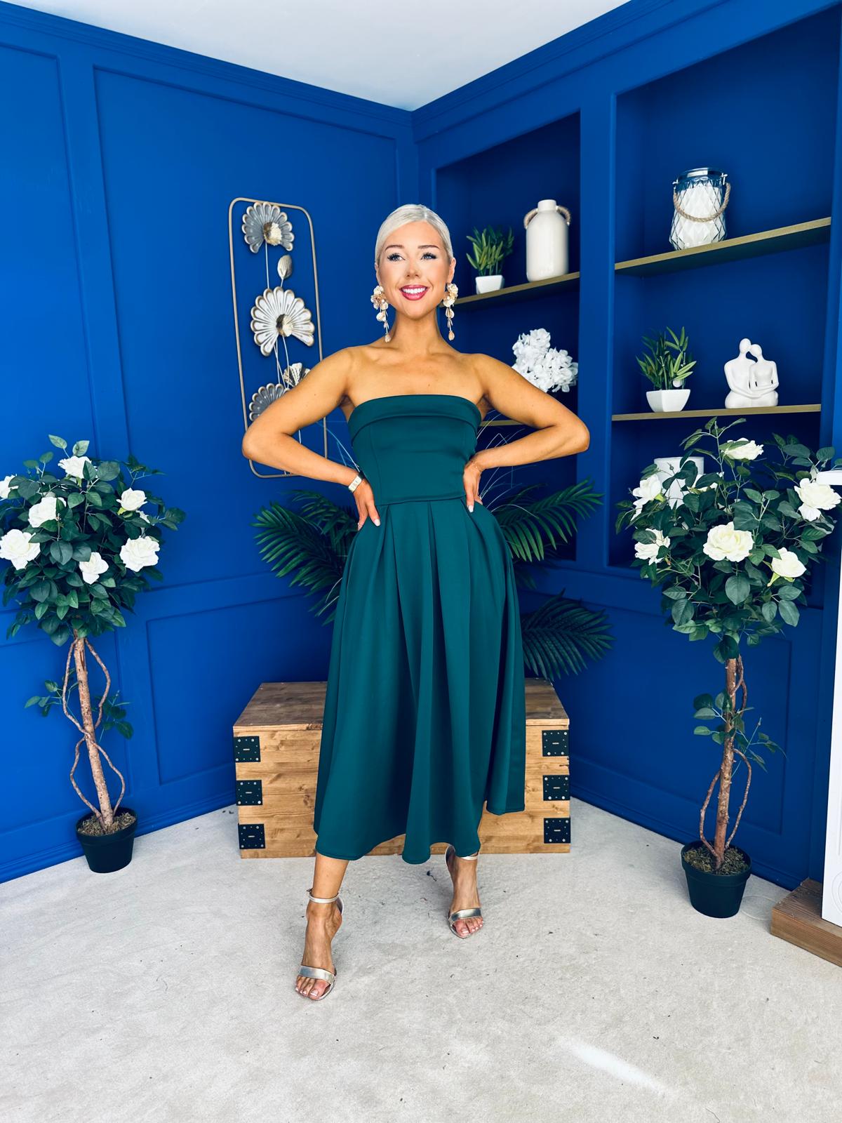 Beautifully flowing with a cinched in waist, this midi dress boasts a pleated skirt that creates an elegant sense of movement.
