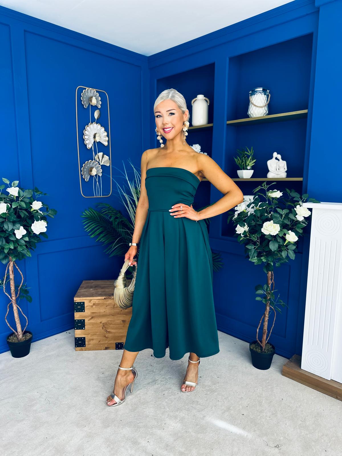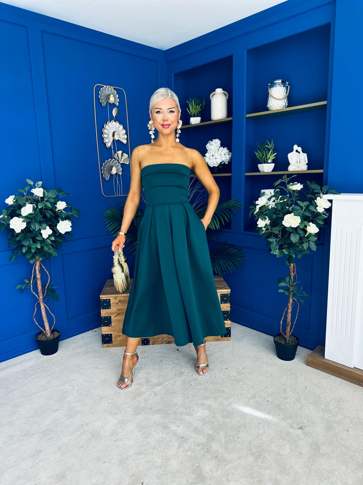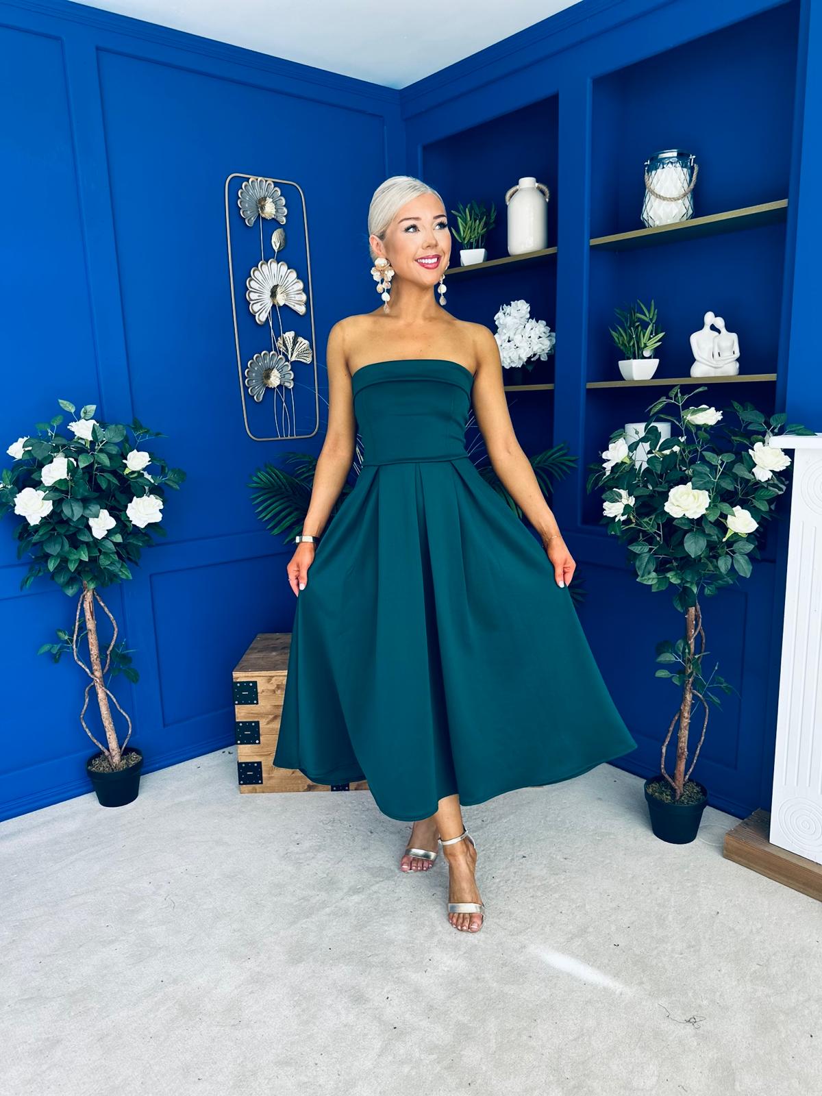Beautifully flowing with a cinched in waist, this midi dress boasts a pleated skirt that creates an elegant sense of movement.