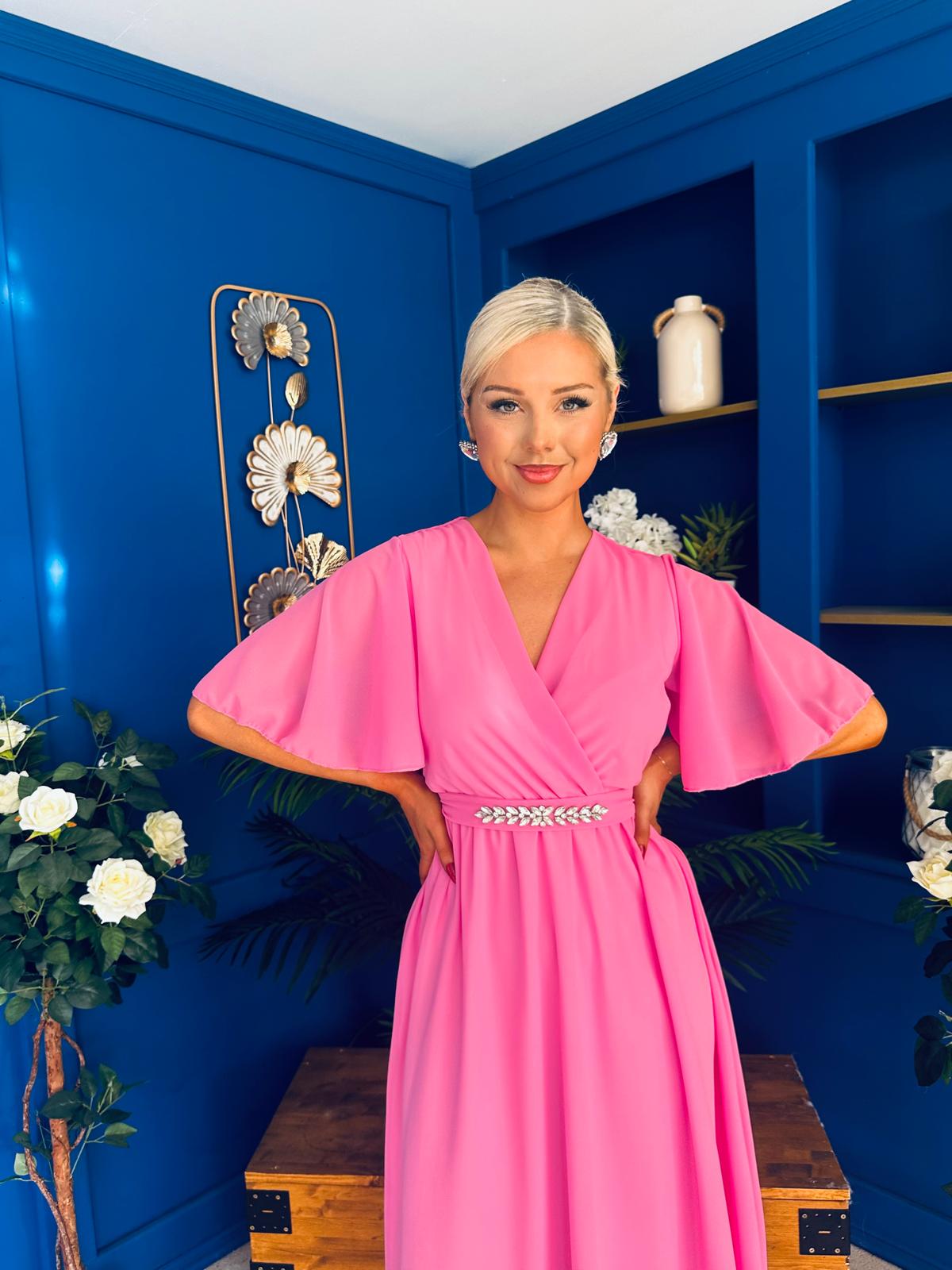 Featuring a wrap over neckline, sheer angel sleeve, elasticated waist and flowing skirt pleated skirt for a statement silhouette and a flattering look, this dress will make you feel and look your best.