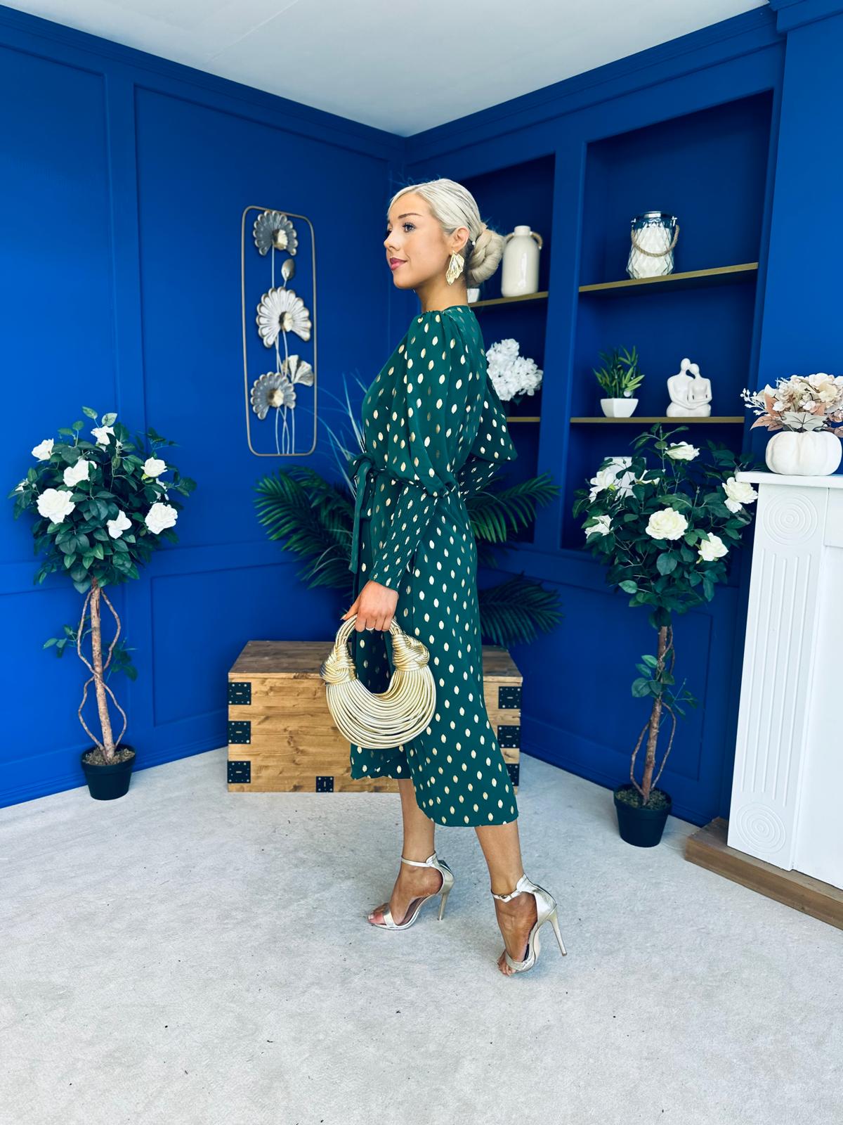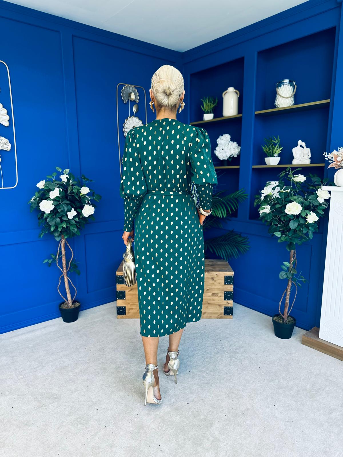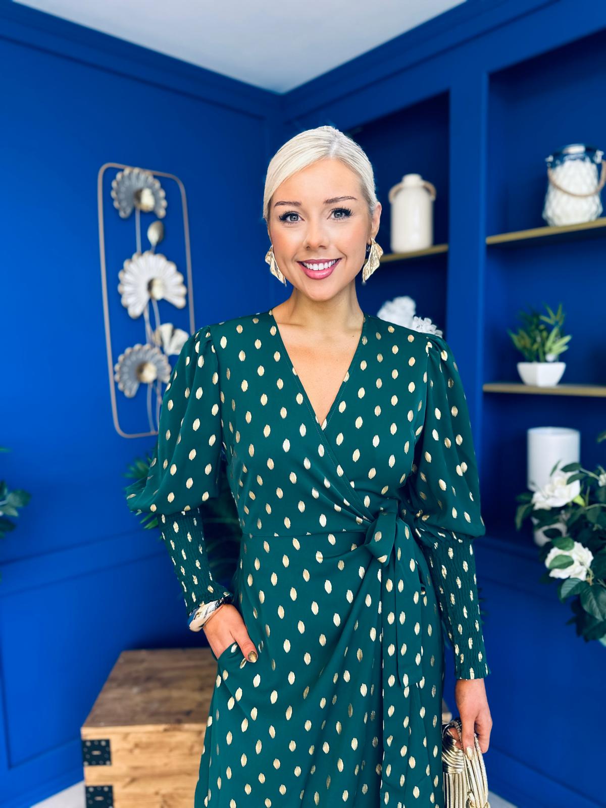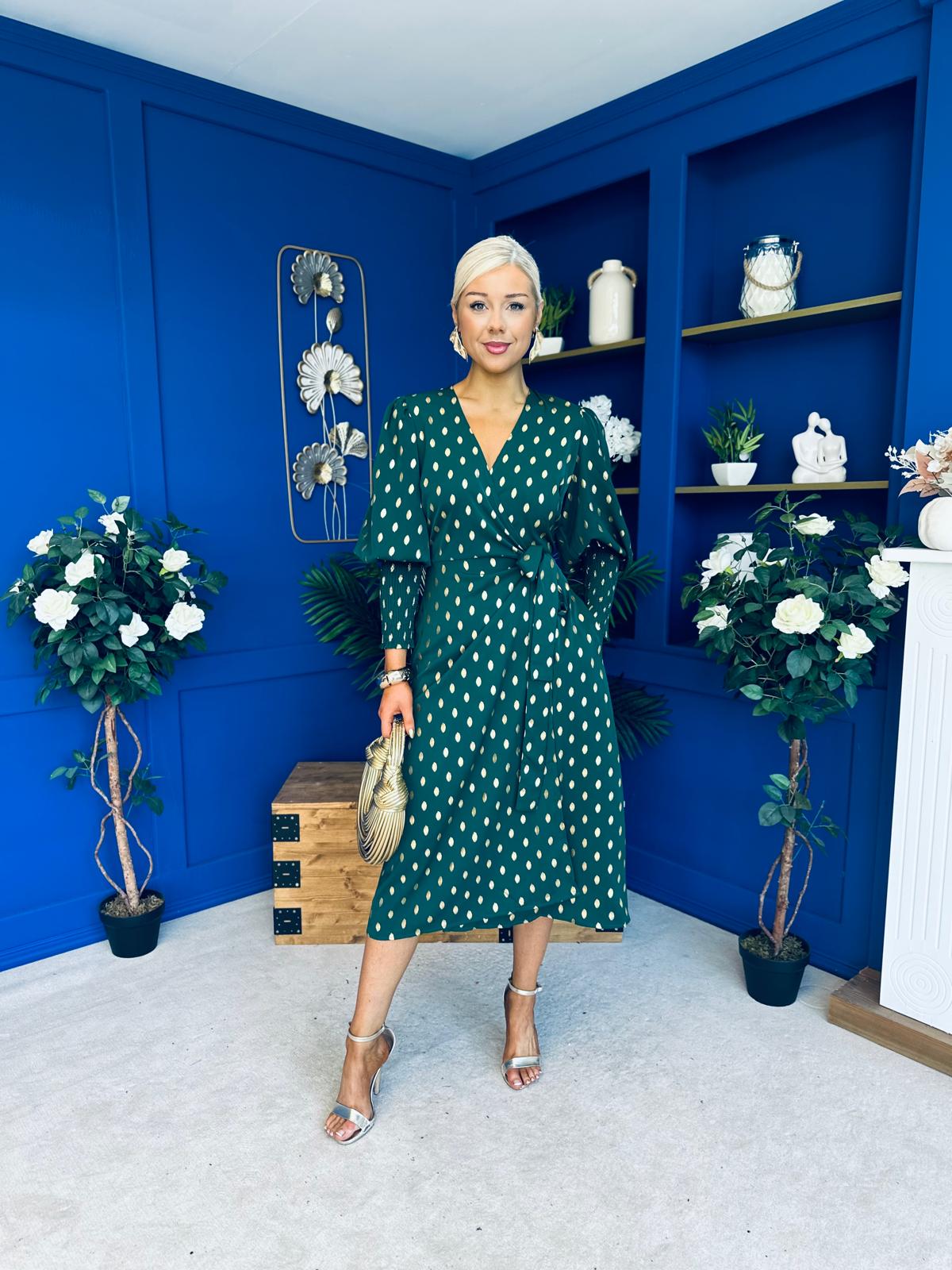 Devina Shirred Cuff Wrap Dress In Gold Foil Green