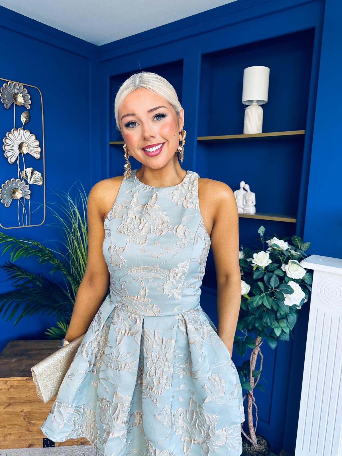 Feel like royalty in our gorgeous Duck Egg Floral Jacquard Racer Neck Skater Mini Dress.