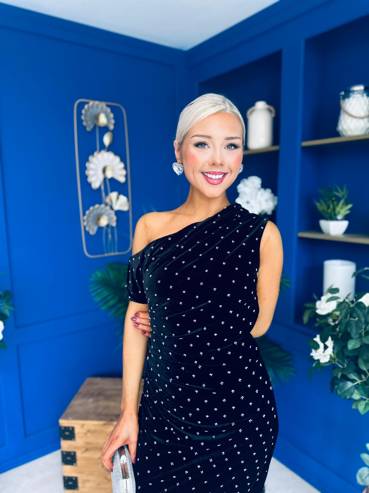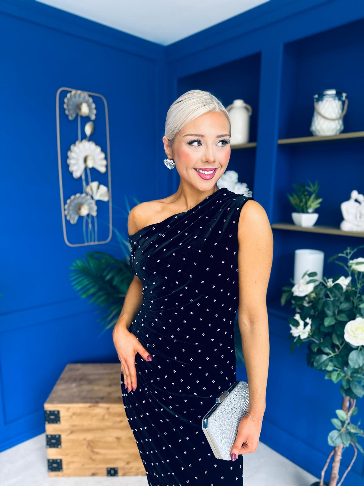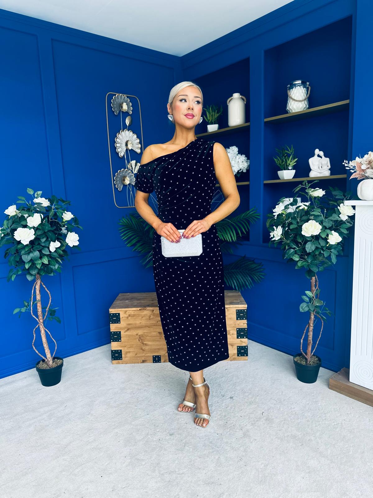 Its unique asymmetric neckline provides visual interest, while the sleek midi skirt silhouette flatters the figure, creating an exquisite look that will never go out of style.