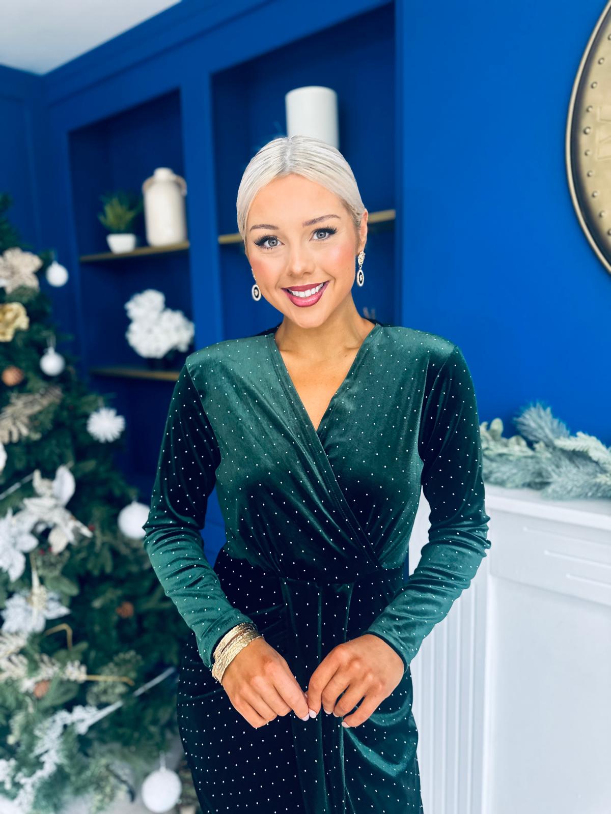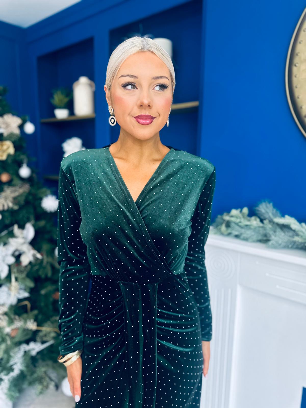 Our new Dora Studded Velvet Dress with full sleeve, V neckline, gathered waist & flowing skirt with front split is simply fabulous